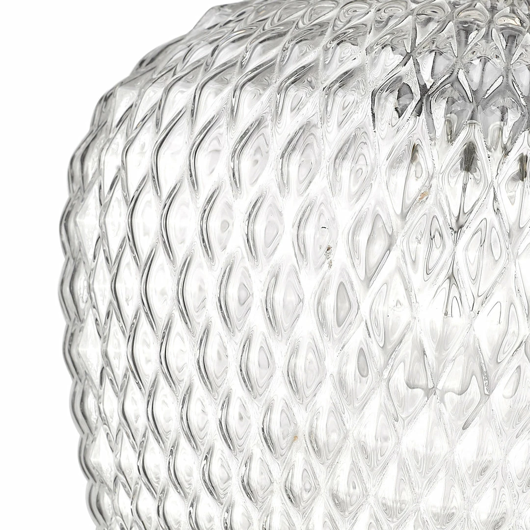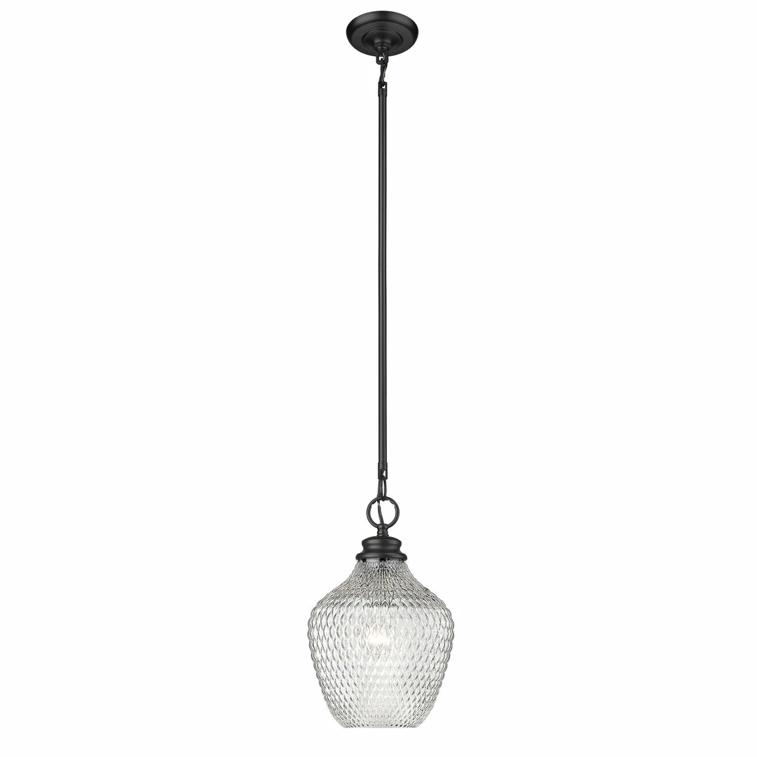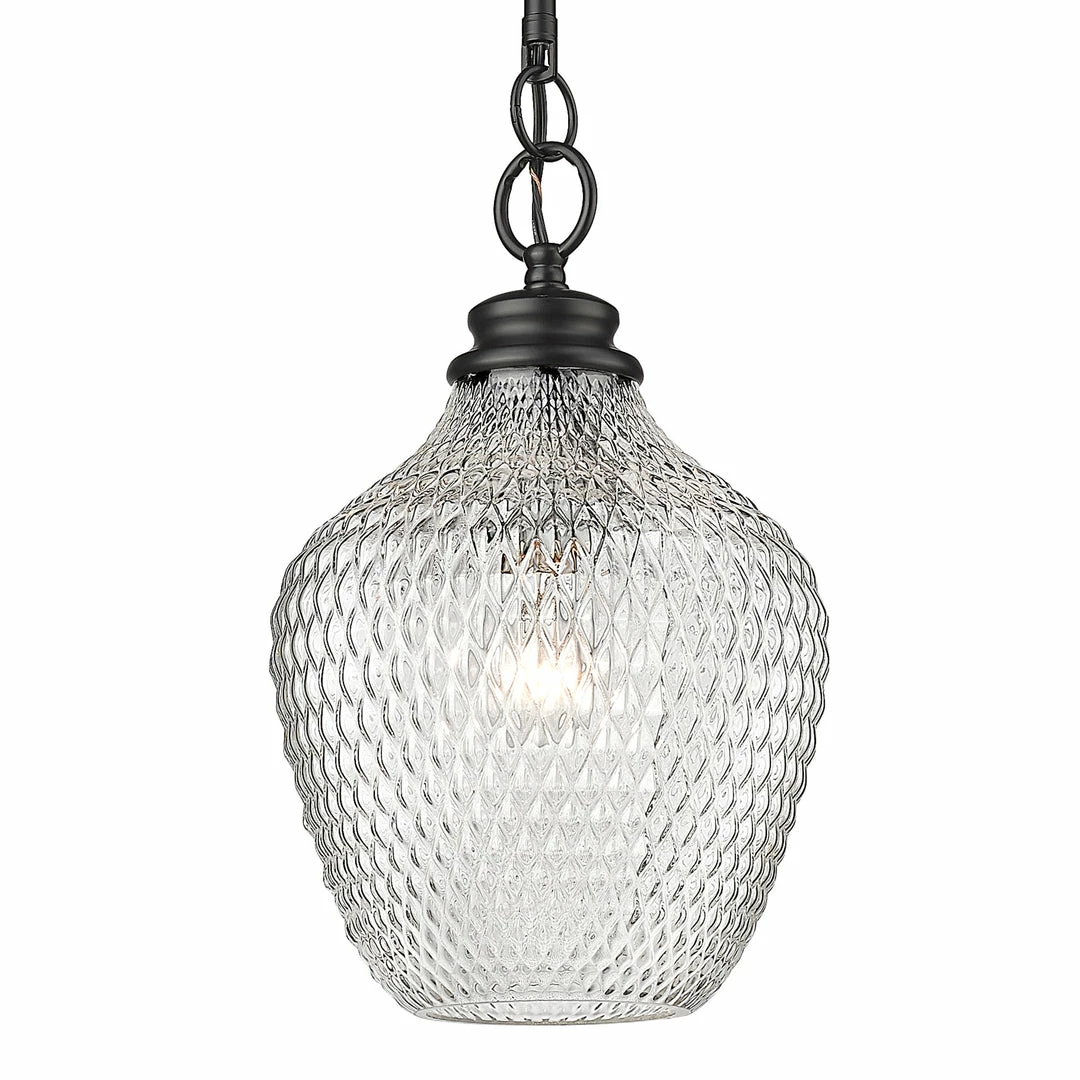 Retro with a flirty flair, Adeline is ideal for eclectic spaces. The transitional fixture is feminine with a vintage look and organic form. The embossed diamond-cut lattice pattern of the clear, curved glass refracts light and adds visual interest. An open bottom creates task lighting and allows for easy bulb changes. Hang the Matte Black pendant alone or group over a kitchen island.