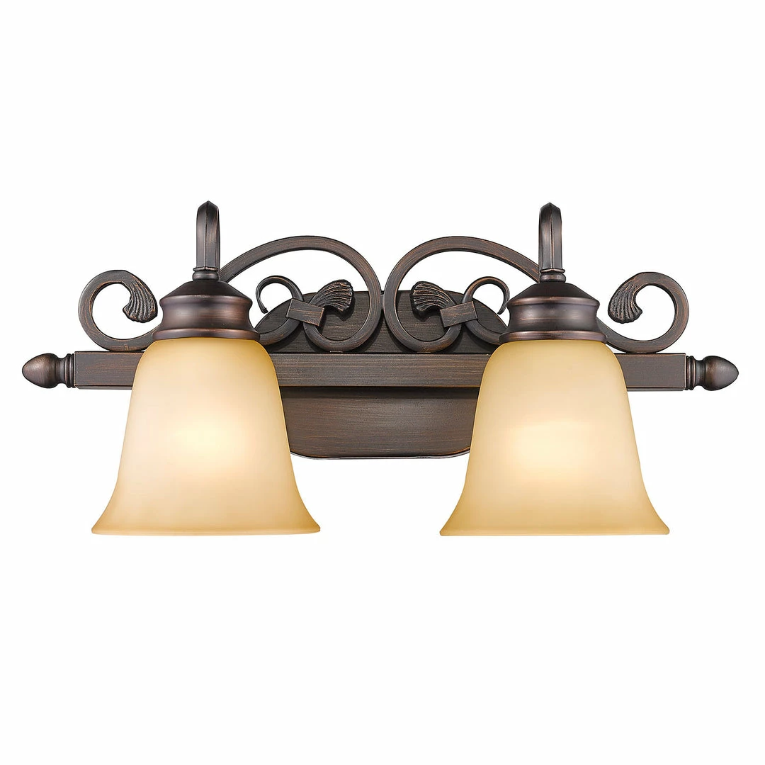 The Belle Meade collection is traditional, classic Mediterranean style with warm Tea Stone Glass and graceful scrolling arms. The Rubbed Bronze finish is perfect for cozy, casual bathrooms and this 2-light bath vanity is UL approved for damp locations and is ideal over a vanity or mirror.