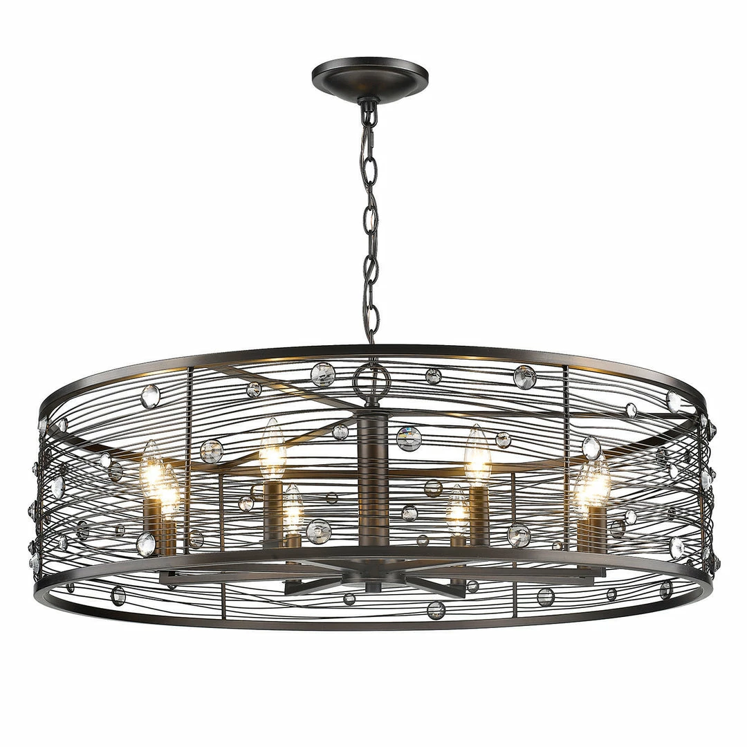 Bijoux is a jewelry-inspired collection of industrial-chic fixtures. Partially exposed bulbs shine coyly through hand-wrapped wire shades, lighting the lustrous faceted crystals. A dark beauty, the collection features a hand-painted multi-layered Brushed Etruscan Bronze finish. Transitional in style, the fixtures are ideal for eclectic and contemporary room decors. This 8-light semi-flush creates a stylish focal point.