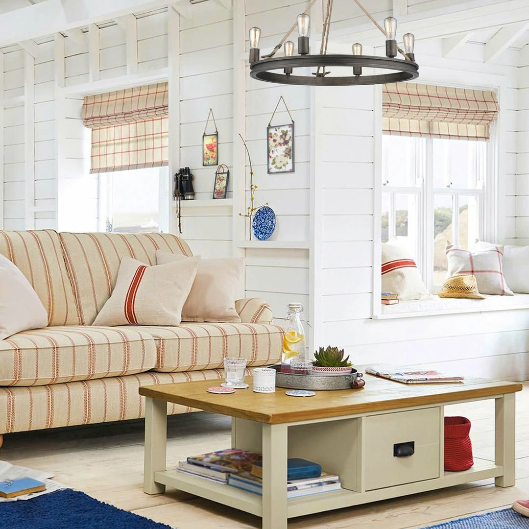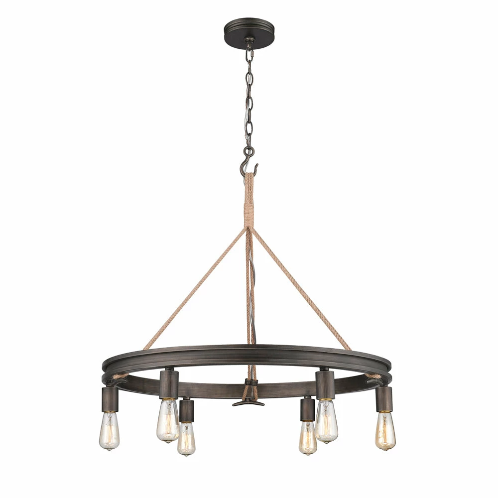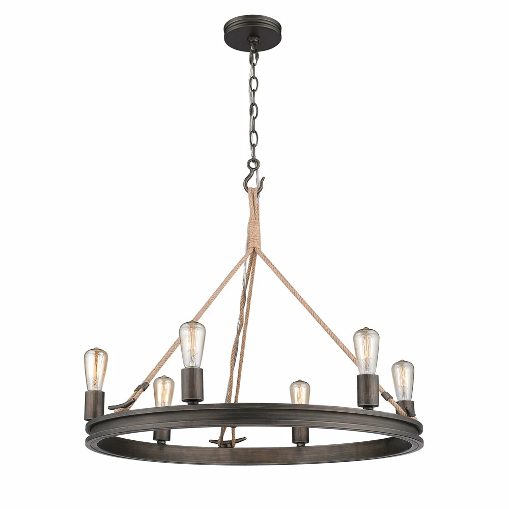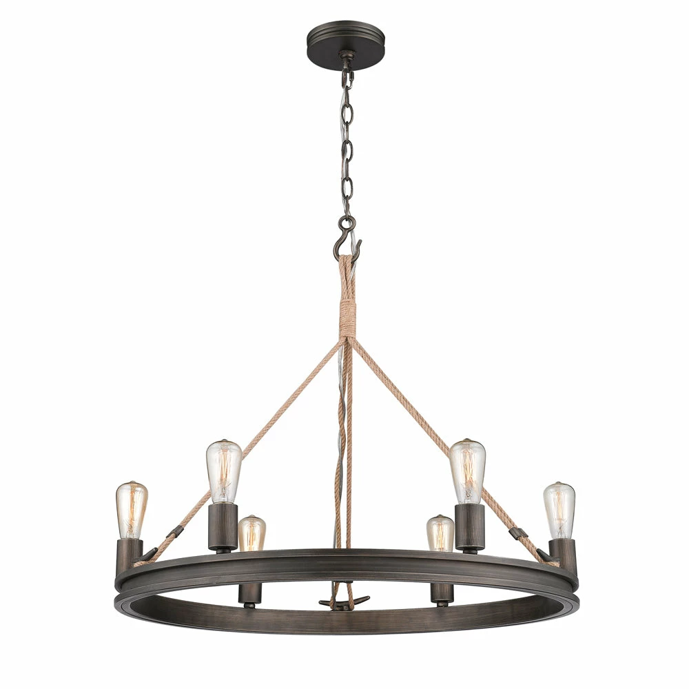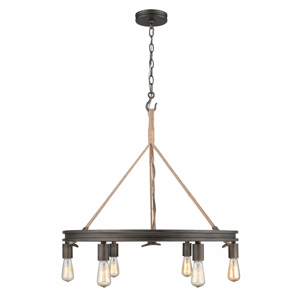 Inspired by the sea, this coastal collection features a simple design with authentic, nautical details. Tied in sailor’s knots, woven ropes loop metal cleats before being suspended from maritime hooks. The contrast between the available finish options and texture of the rope and metalwork creates visual interest. Created to be hung with the lamps facing up or down, the transitional fixtures are versatile. This look is perfect for seaside retreats, casual lofts, and rustic bungalows. This 6-light chandelier is comfortably sized for intimate dining and living areas.