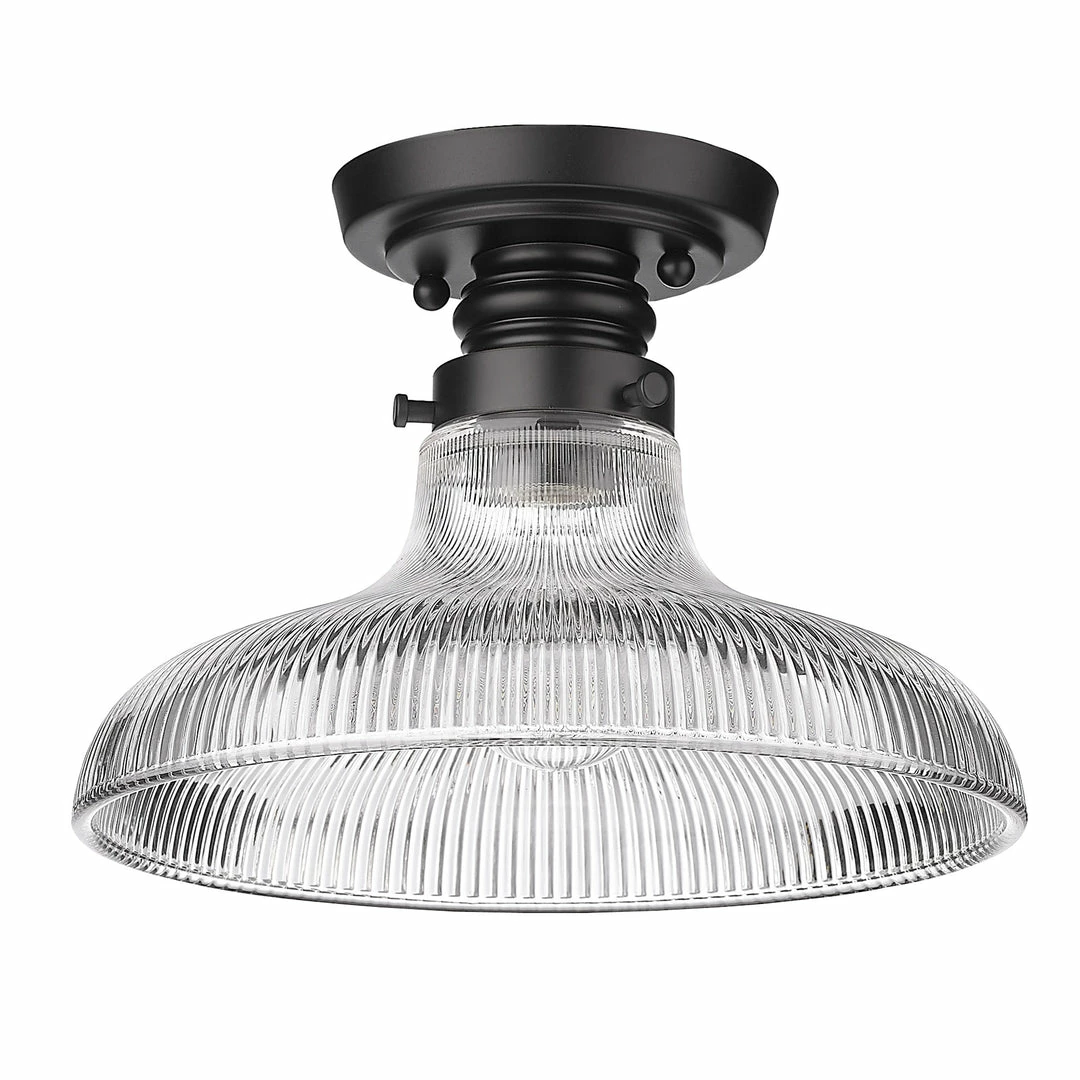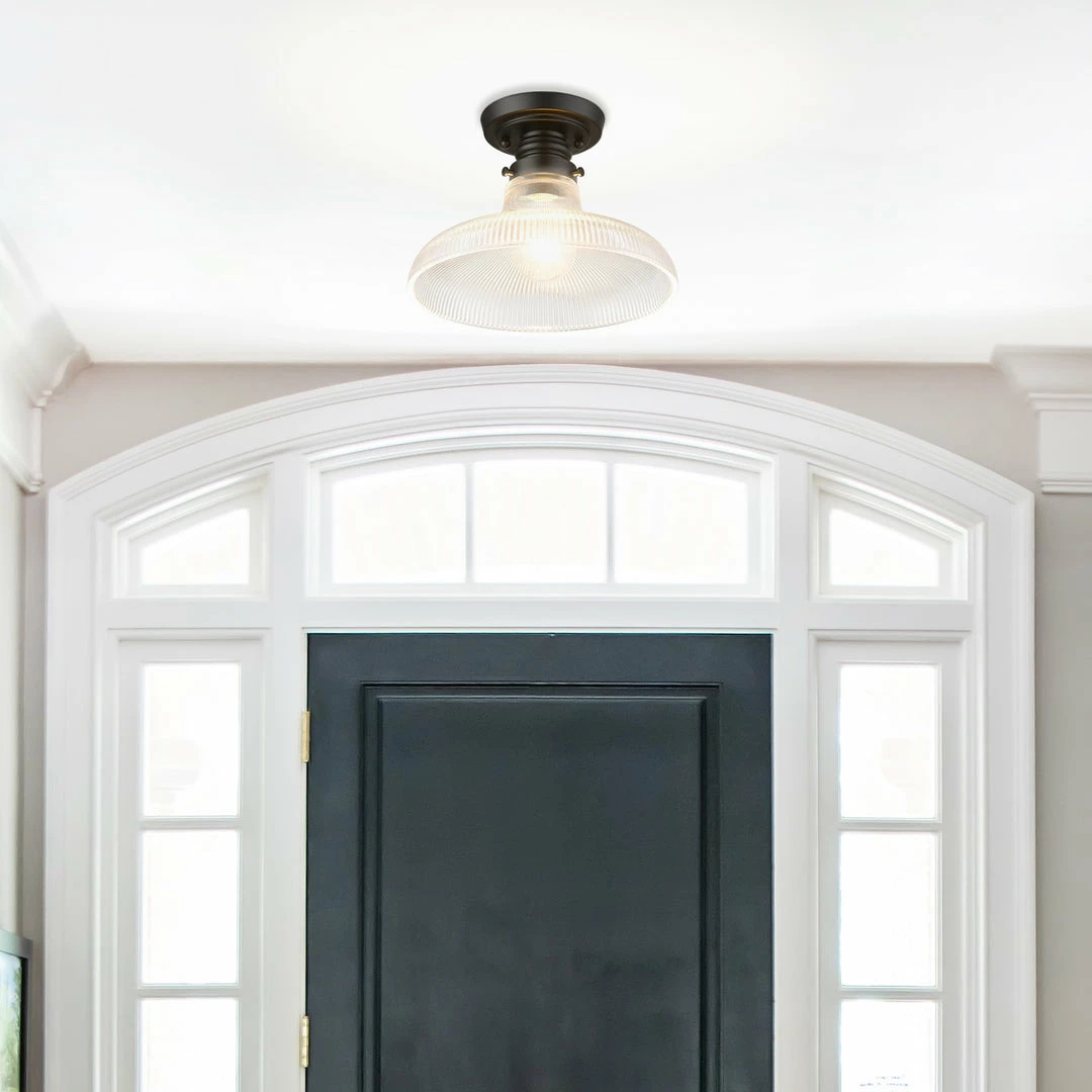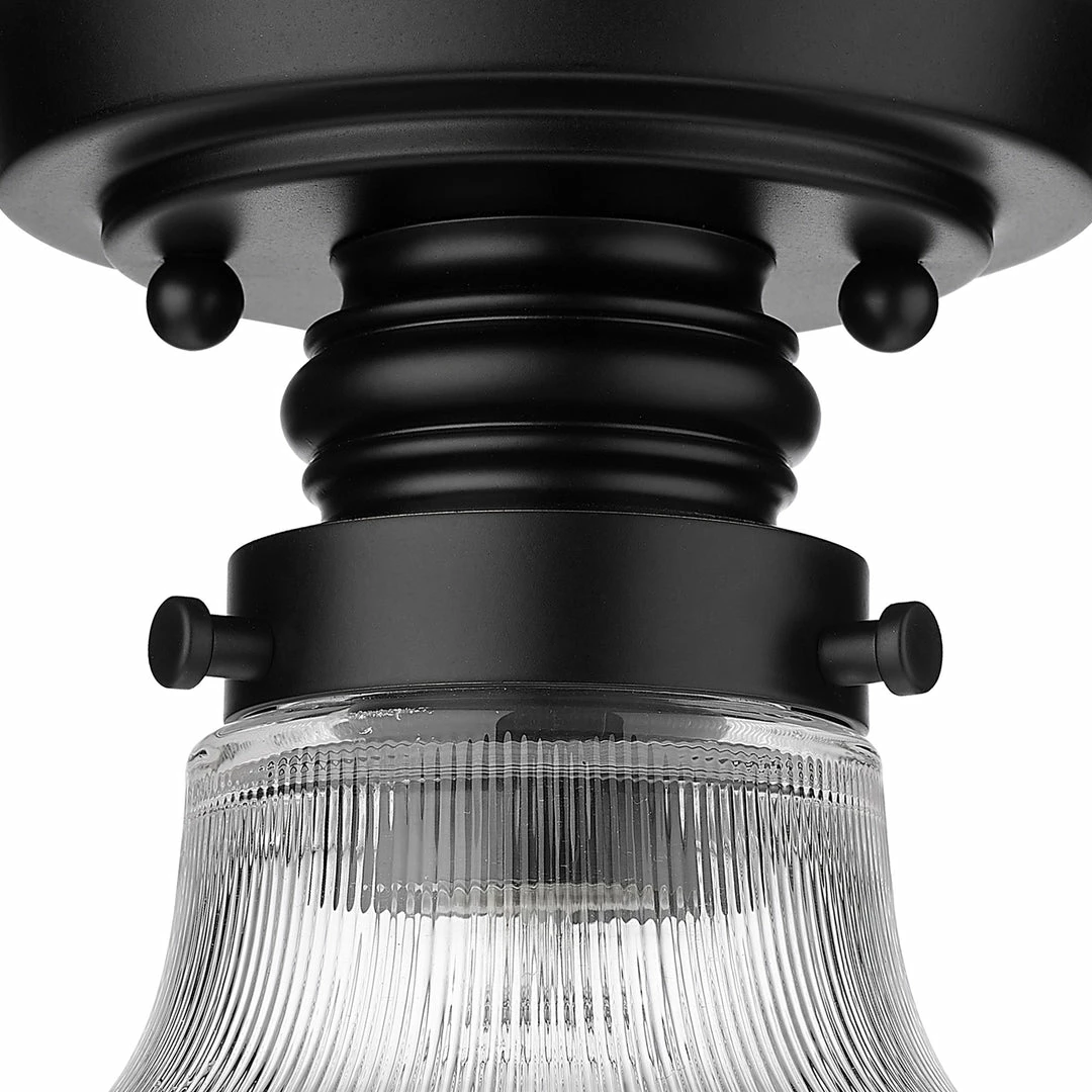 Clary’s vintage-inspired design is great in eclectic, traditional, and transitional interiors. The clear, optic glass is paired with a modern Matte Black finish, allowing the light to work well in classic and more modern environments. Paying homage to the fun decor of old-school diners and food joints, the timeless look of the wide Ribbed Optic Glass shade takes center stage. The linear texture of the attractive flared glass draws the eye while gently diffusing light. Clary is damp-rated. With a low-profile design, it is perfect for hallways and bathrooms.