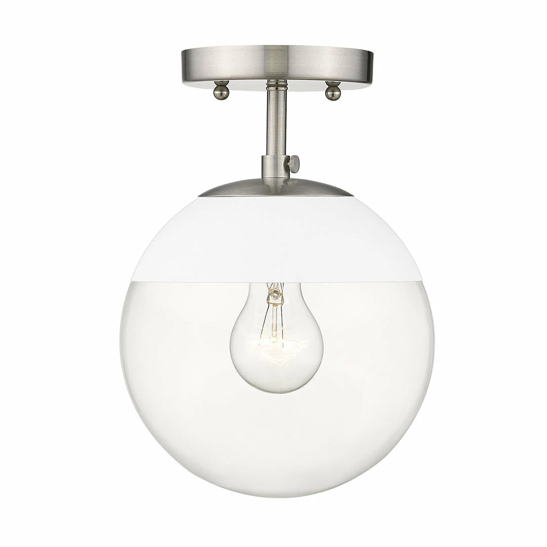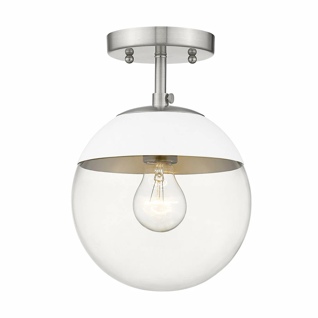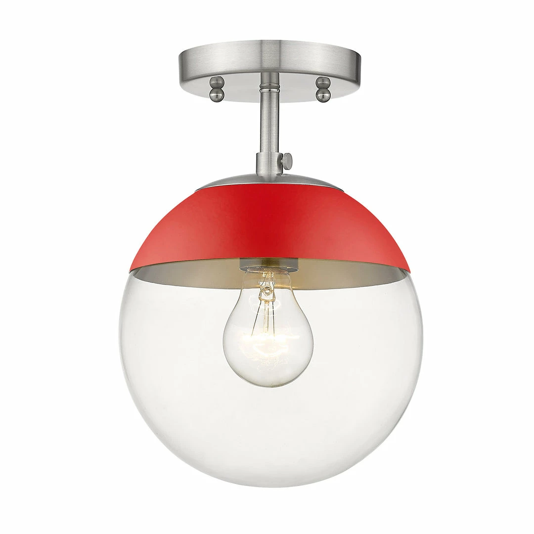 Mid-century modern design with a modern twist, these fashionable orbs are highly customizable. Available in clear or opal glass with plated chrome, pewter or brass hardware. Caps are available in a number of accent colors to further customize your look. Choose colors and finishes that complement your existing dรฉcor or design your entire room around your favorite color combination. This semi-flush is UL approved for use in a bathroom, but also works perfectly in a kitchen, living room, entry, or hallway.