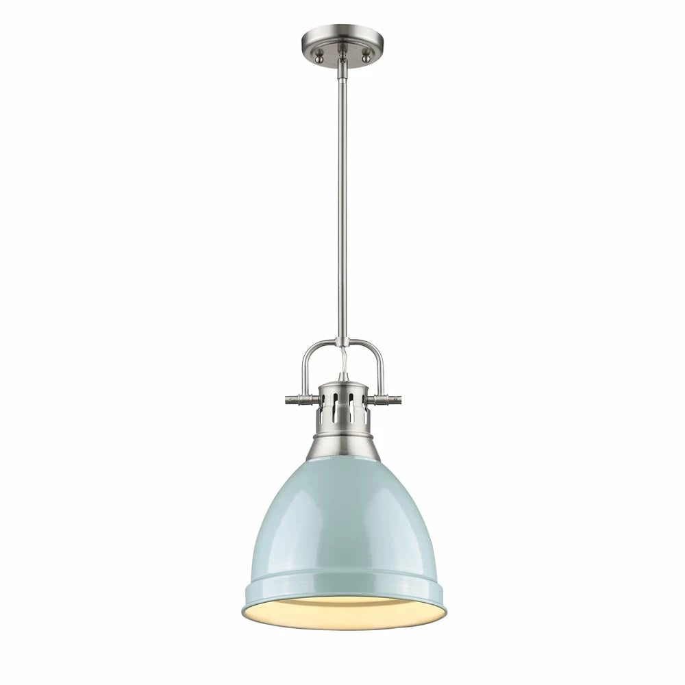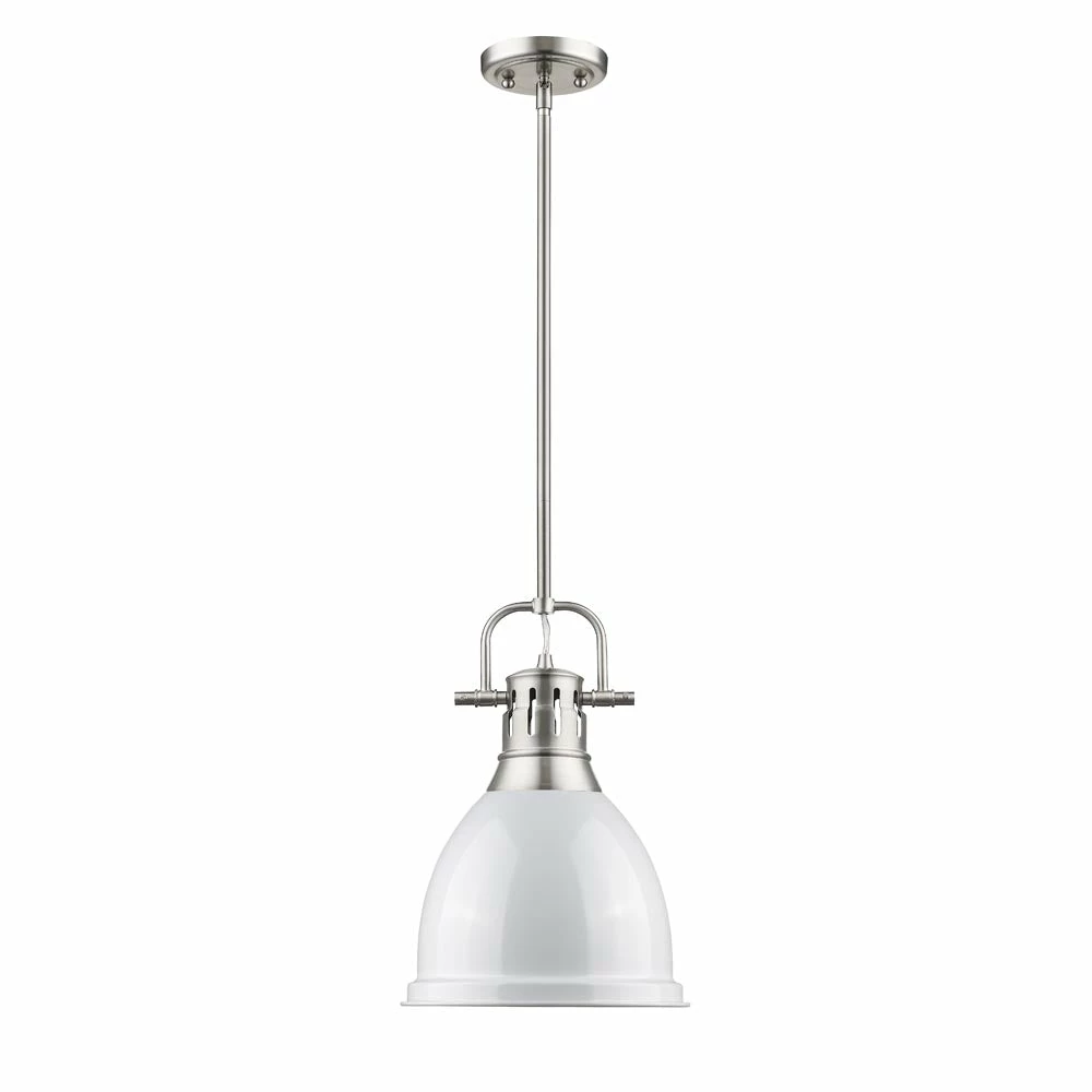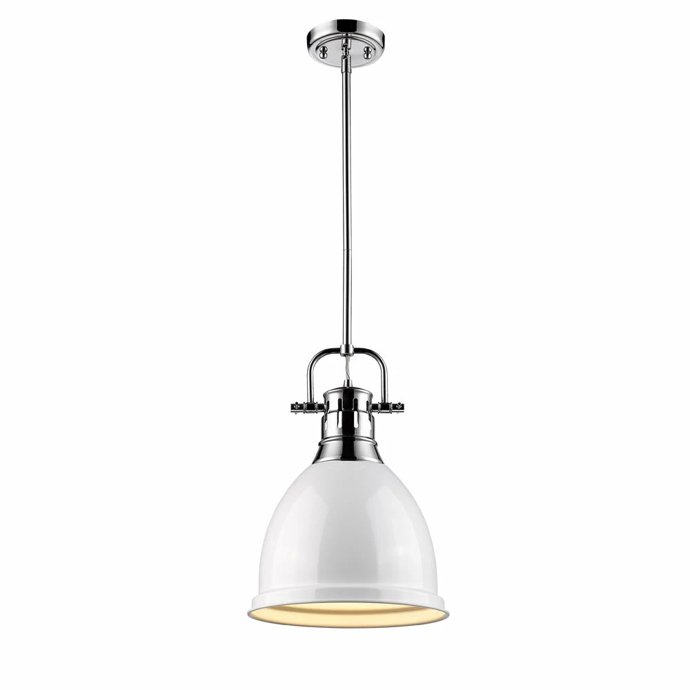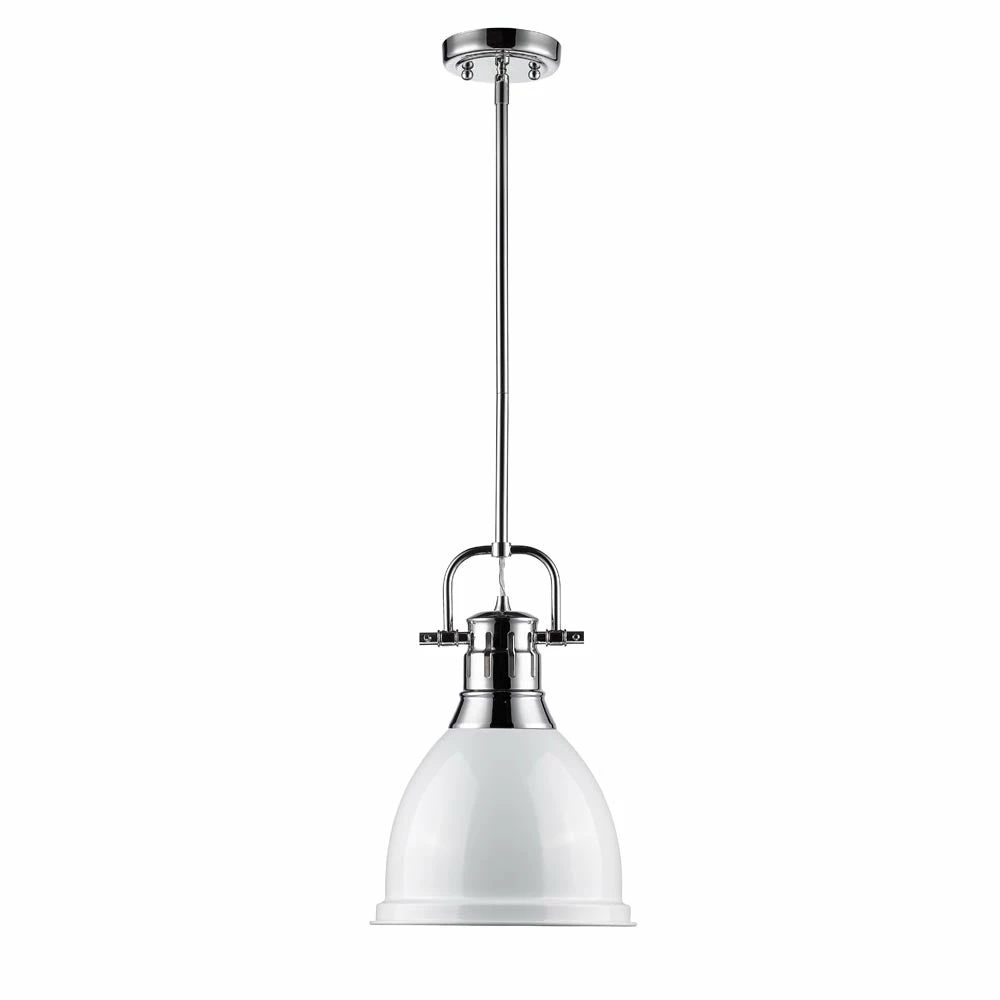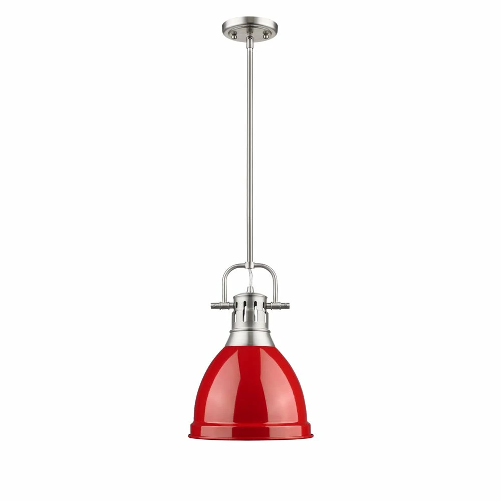 The Duncan collection is contemporary style with an industrial feel. The collection features a variety of simple, traditional silhouettes that are a nod to a bygone era. Transform the look of your room with these classic, vintage-inspired fixtures. A variety of plated and painted metal shade finishes are offered in choice combinations. This small, rod-hung pendant features a may be hung individually or grouped over a bar.