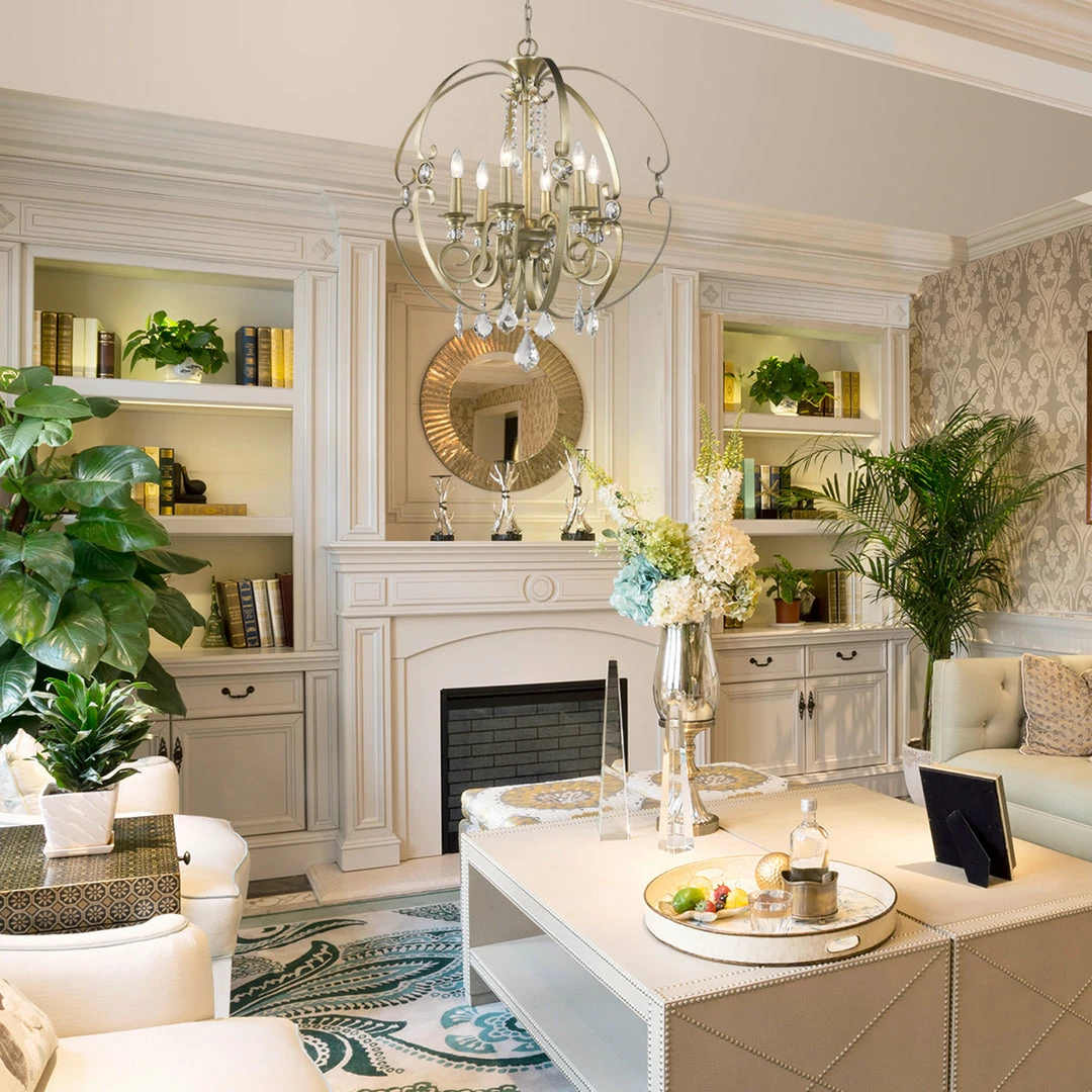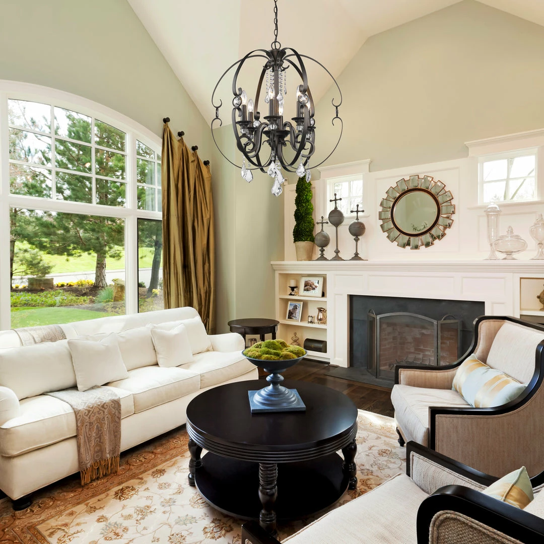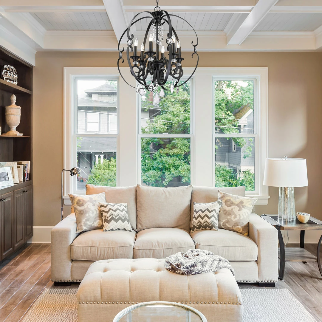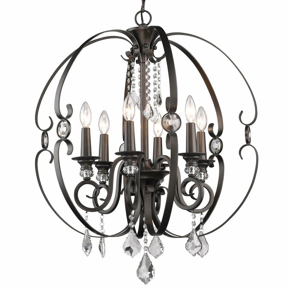 Beauty, glamour and fantasy are the inspirations behind this enchanted collection, the Ella collection lends charm and romance to a room. The style is transitional, but ideal for eclectic and contemporary room decors. Riveting, multi-faceted clear crystal accents twinkle vivaciously. Offered in several finishes, pendant chandeliers provide stylish focal points and this 6-light fixture is comfortably sized for a dining room or entry.