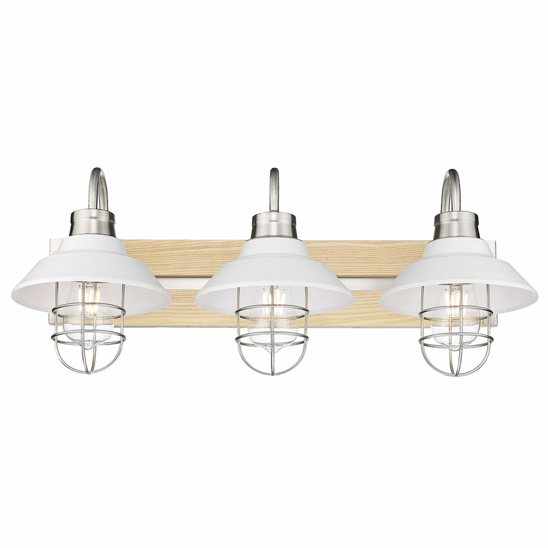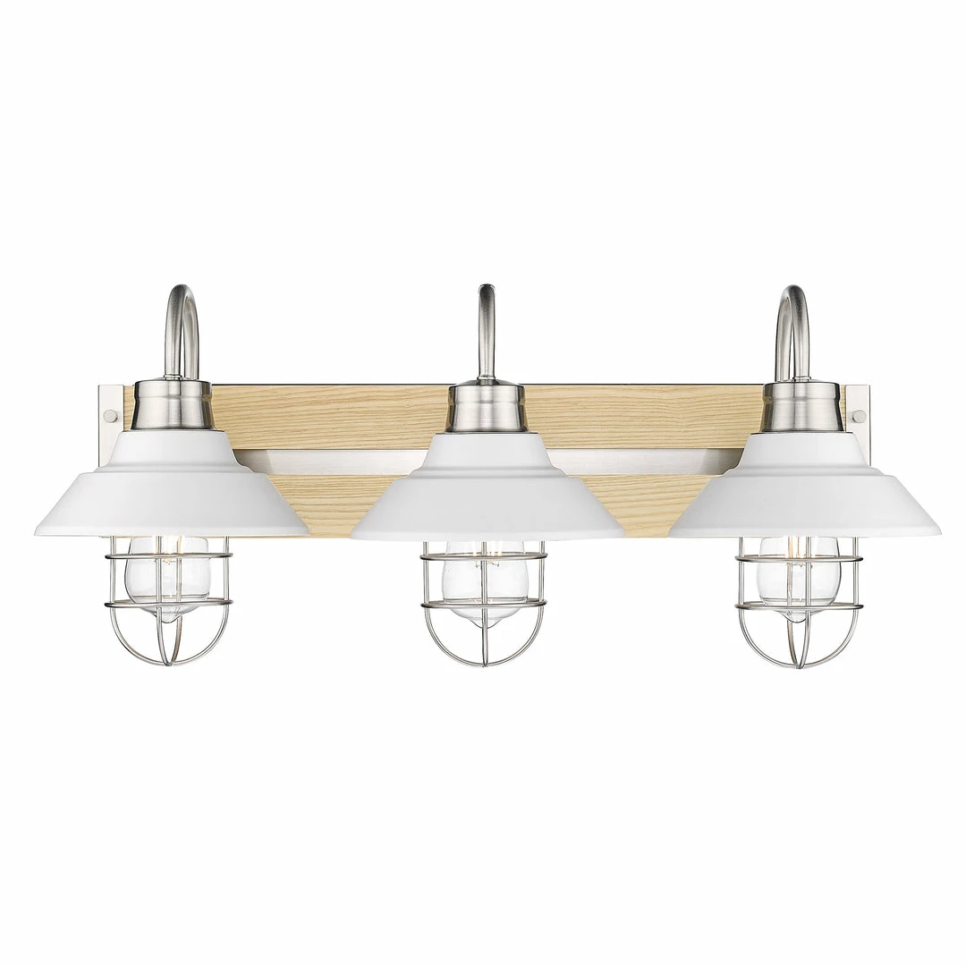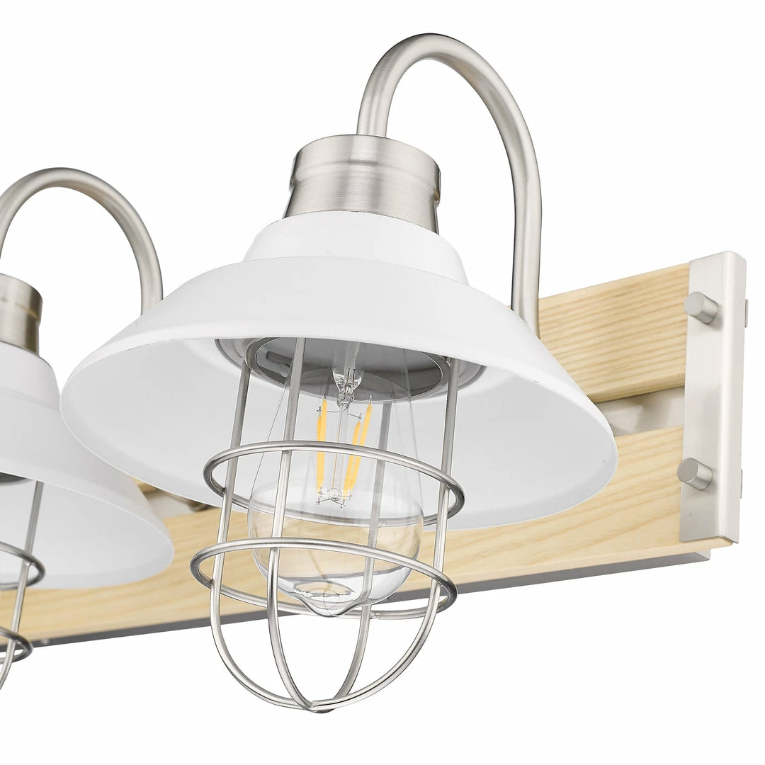 Fraser utilizes wood accents, partial shades, sleek metal finishes, and protective cages for an updated coastal-inspired look. A modern, highly adaptable Pewter finish complements the light tone of the natural wood and Matte White Shades. Gooseneck arms, exposed hardware, and partially exposed bulbs add to the industrial feel of the collection. Push the look further by installing Edison bulbs.