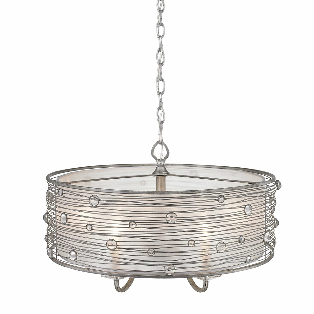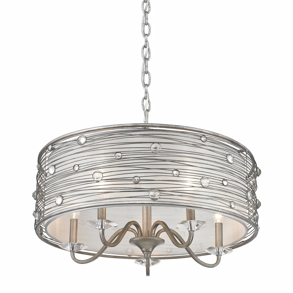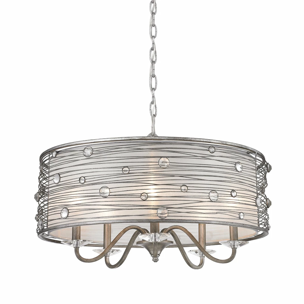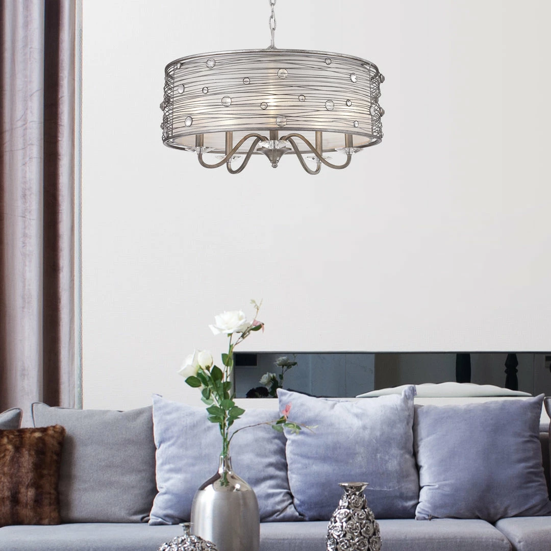 The Joia collection was inspired by jewelry. Transitional in style, the fixtures are ideal for eclectic and contemporary room decors. The collection is offered in multiple hand-painted finishes. The hand-wrapped wire frames are accented with crystals that glisten when lit. A fabric shade romantically diffuses the light. Chandeliers create stylish focal points and this 5-light chandelier is comfortably sized for an intimate dining room or entry.