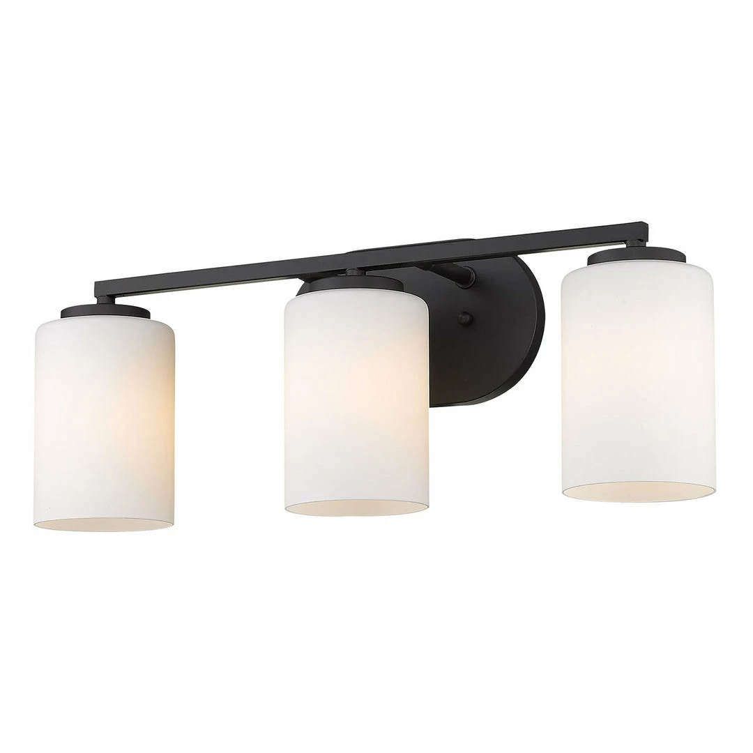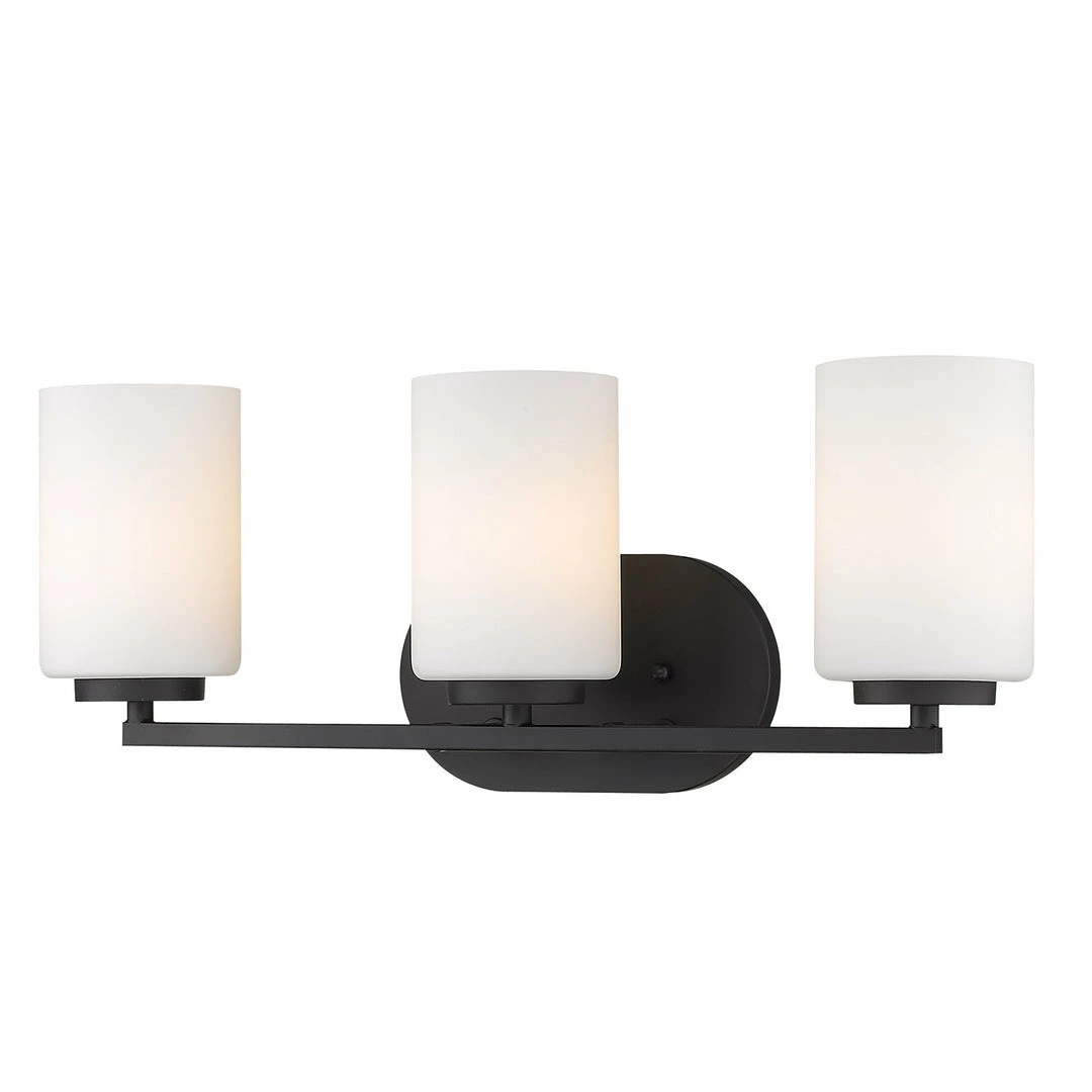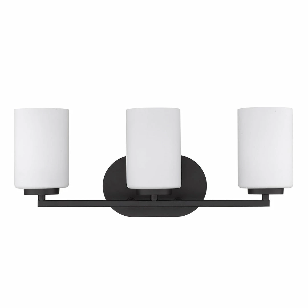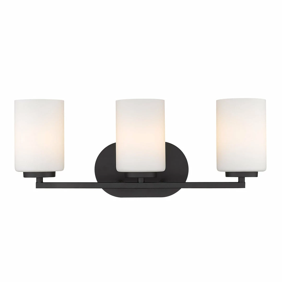 This simple and versatile look is at home in transitional to modern settings. The smooth, matte black finish adds a contemporary feel. The neutral white shade dresses up the look, while softening the geometric lines and gently diffusing the light. This fixture may be mounted with the glass facing up or down. This 3-light bath vanity is UL approved for damp locations.