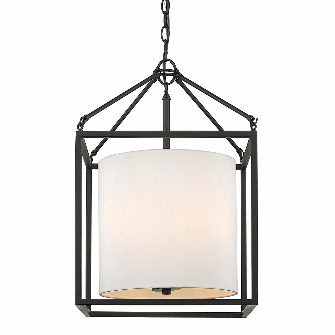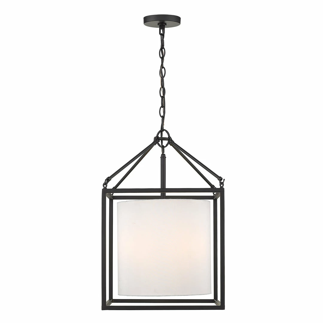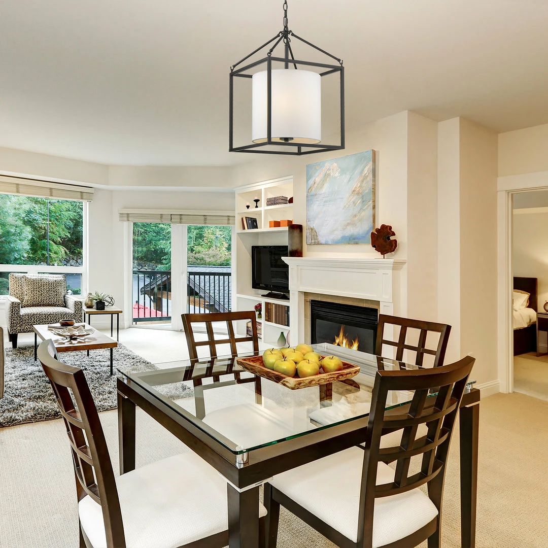 This simple and versatile look is at home in transitional to modern settings. The smooth, matte black finish adds a contemporary feel. The neutral white shade dresses up the look, while softening the geometric lines and gently diffusing the light. Easily customize the height of the fixture to suit your installation needs. This 3-light pendant creates an elegant pool of-light over an intimate dining area or breakfast nook.