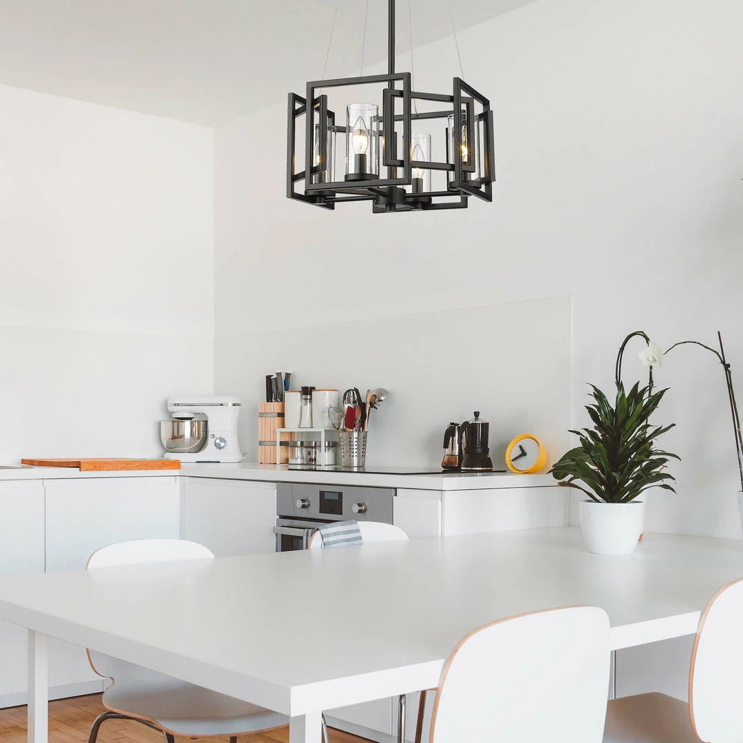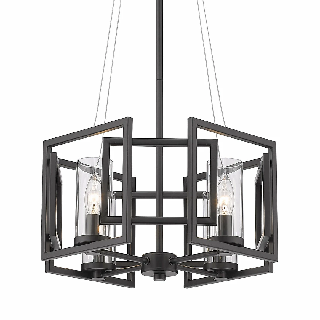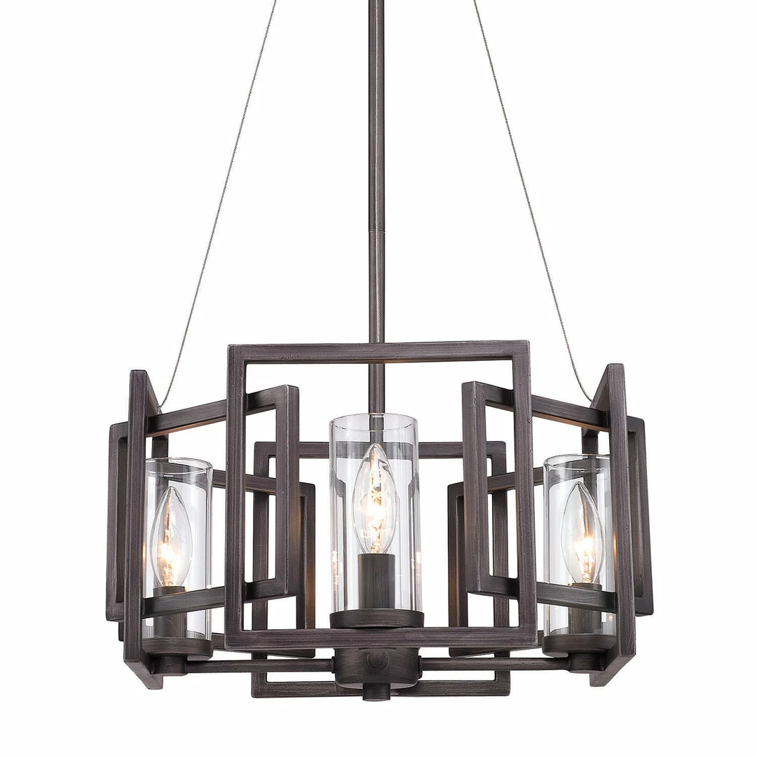 Sleek angles and a geometric form make an ultra-modern statement in the Marco collection. The series is offered in multiple finishes that heighten the light airy look. Clear Glass cylinders surround the stately silhouettes of candelabra bulbs. The Marco pendant provides ample light with contemporary flair.