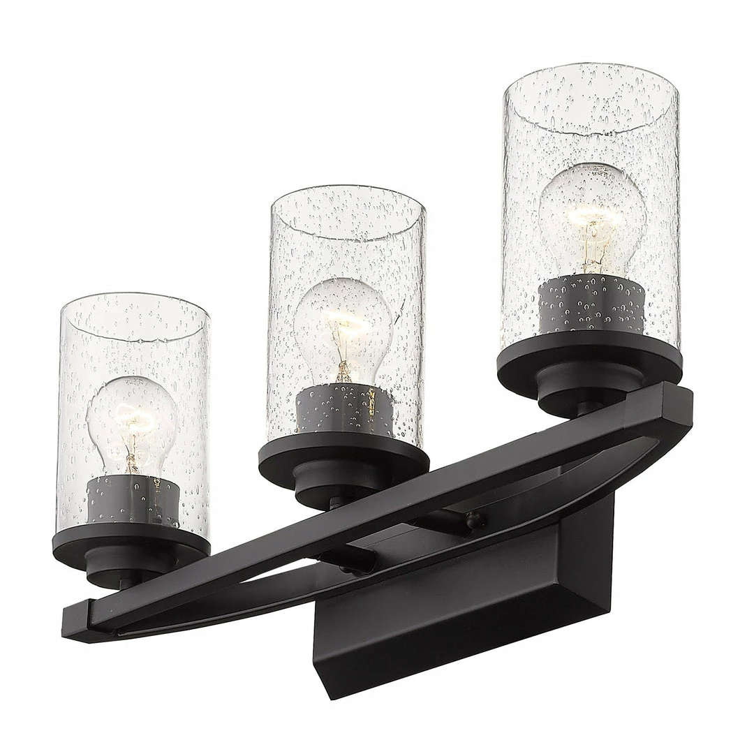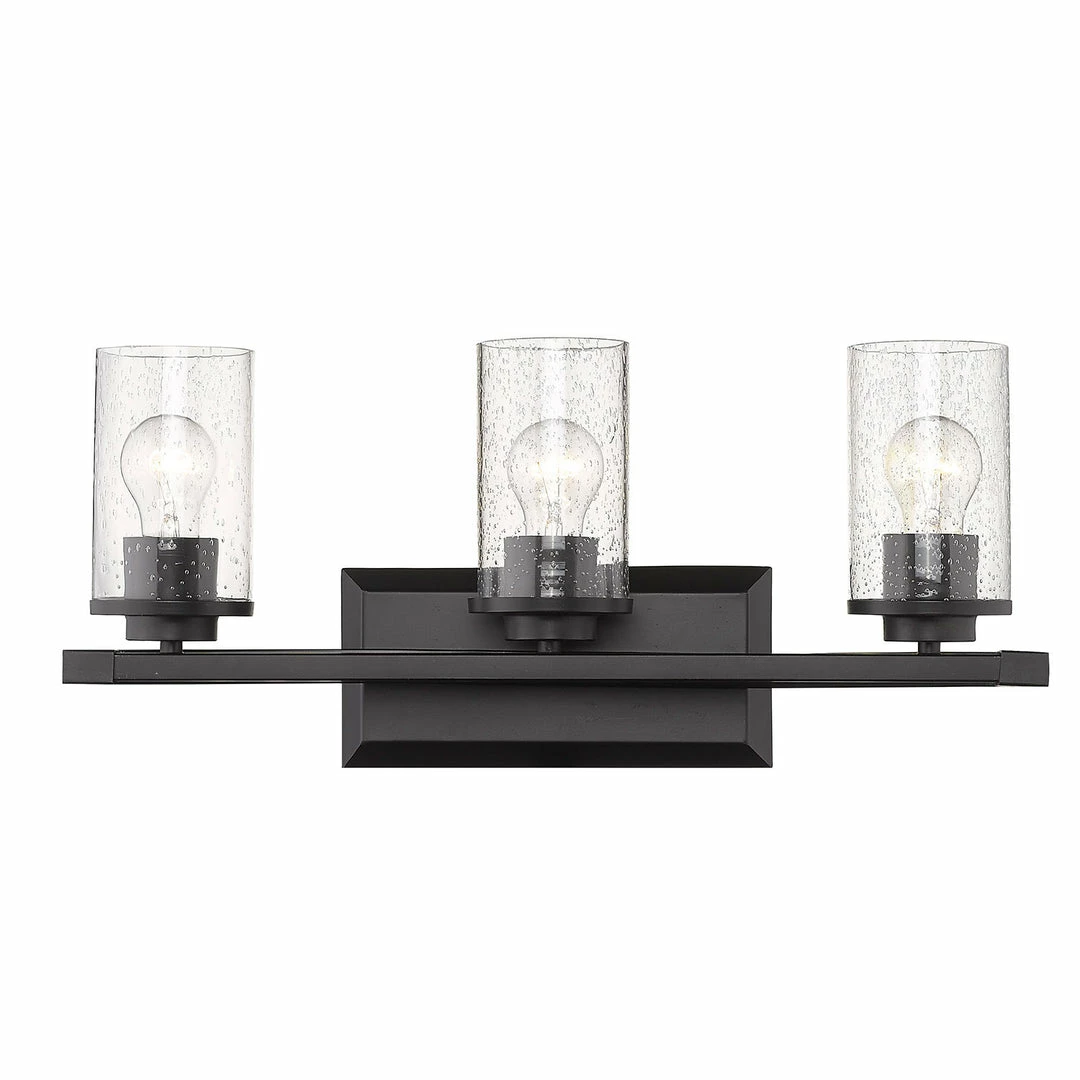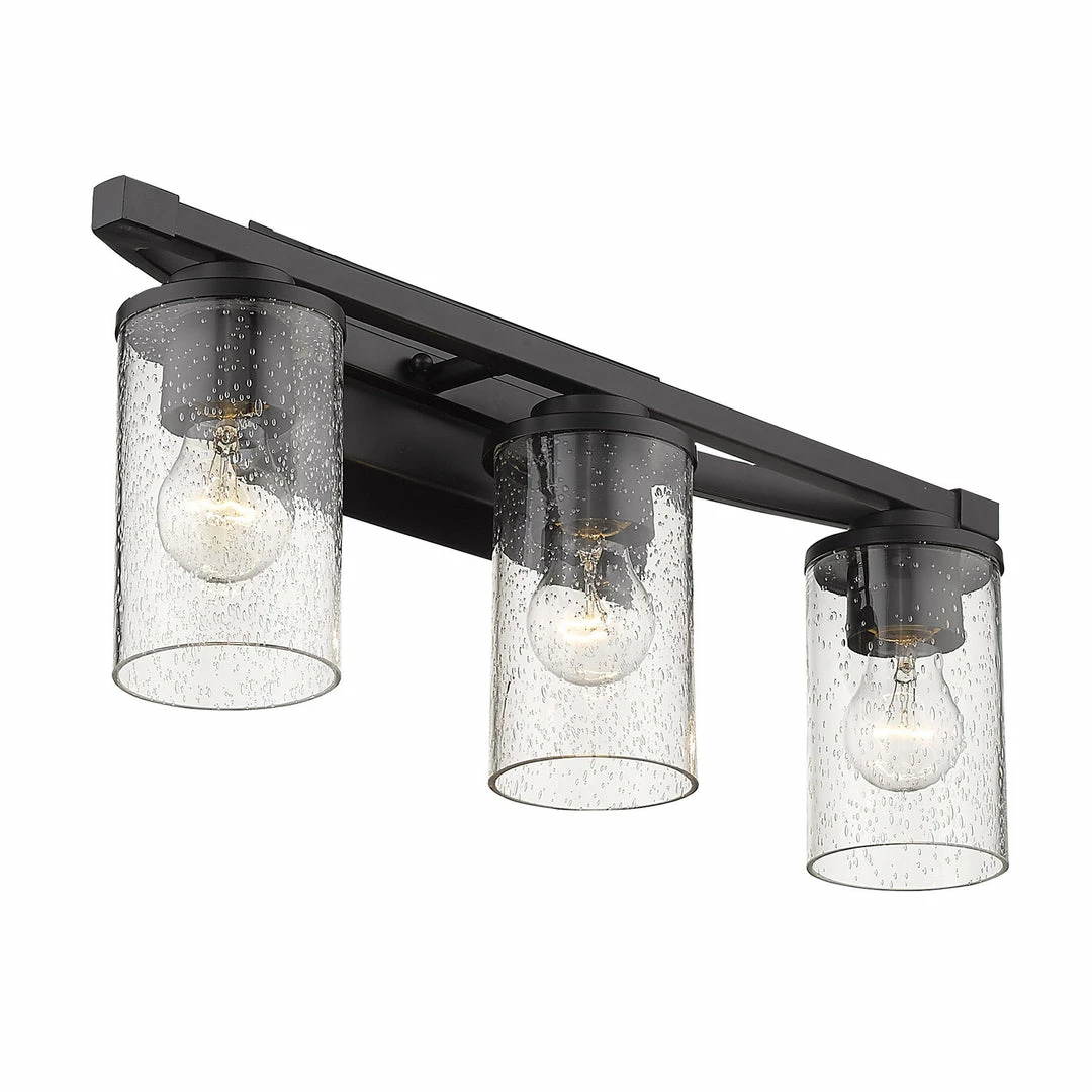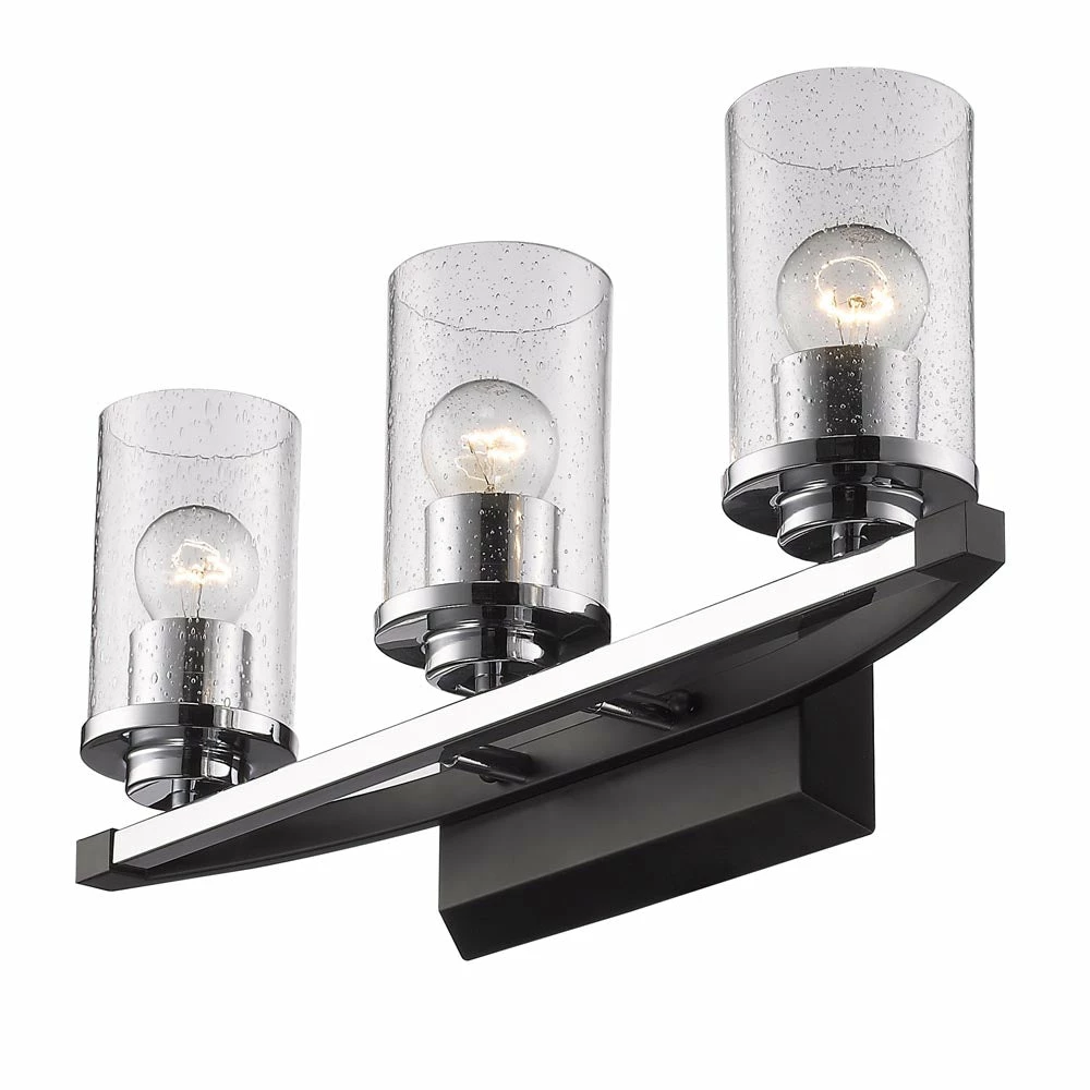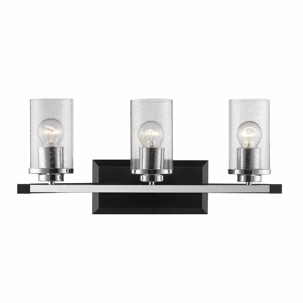With seeded glass and contemporary finishes, the simplicity of the Mercer Collection is suitable for transitional to modern interiors. Bold, graphic lines create an open-cage design. The fixtures are available in multiple accent colors to match or contrast the smooth cages. This 3-light bath vanity is damp rated for use in the bathroom.
