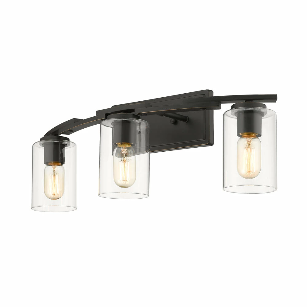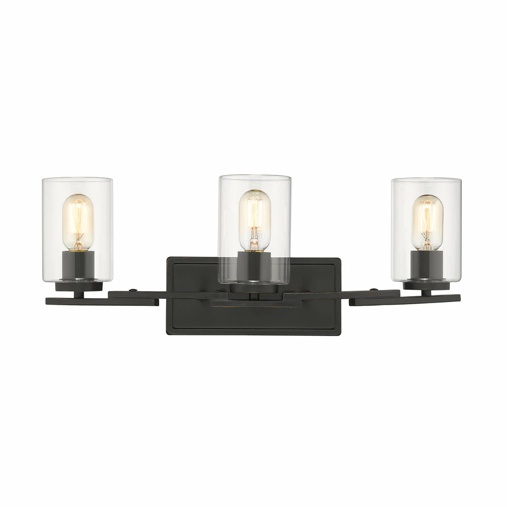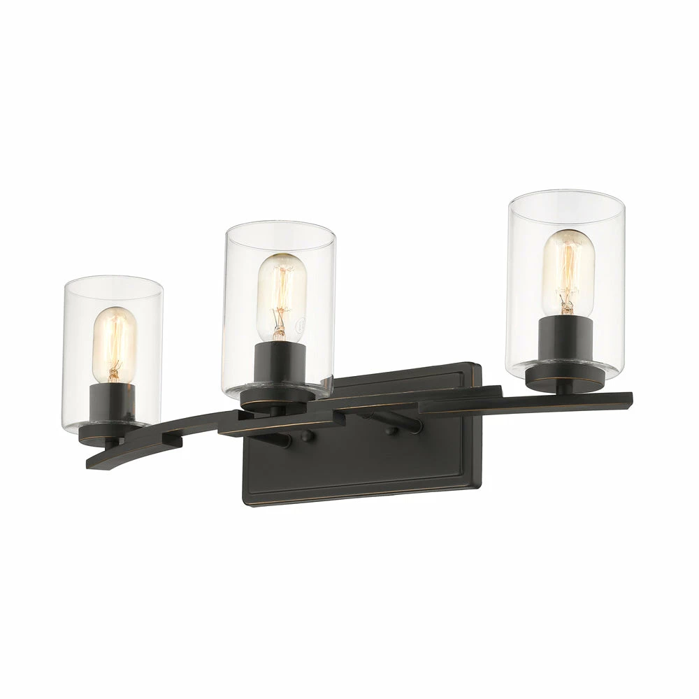 Overlapping arcs come together to form contemporary rings, supporting cylindrical clear glass shades in this clean and modern design. The matte black finish with gold highlights blends easily with many decors. Matching matte black socket covers are visible through the clear glass. The collection uses medium base bulbs. This 3-light bath vanity is approved for damp locations and can be mounted up or down.