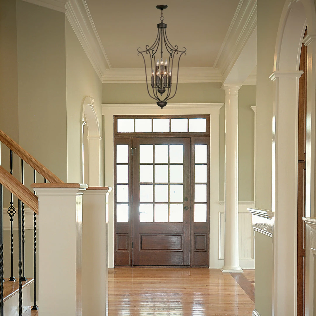 With gentle, sloping lines this caged foyer suits the soft modern or soft traditional home. Squared arms follow subtle curves for a strong contemporary feel of elegance, and the rustic Rubbed Bronze finish add a nuance of cozy casualness. Though perfectly suited for a traditional home, this fixture transitions well into a contemporary setting. This 9 light caged foyer chandelier creates a stylish focal point and is generously sized for generous foyers and living areas.