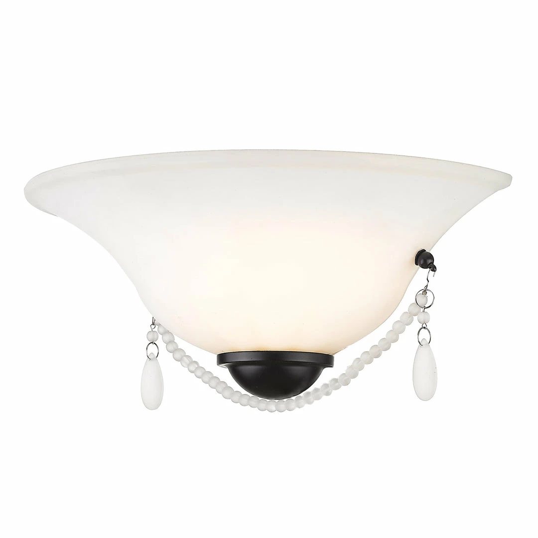 The elegance of the Priscilla collection quietly demands attention. Frosted crystal beads drape the bottom of the wall sconce. Larger teardrop crystal accents cap each end of the crystal strand. The crystal drops mimic the sophistication of fine jewels and the glowing effect of the diffused marbled glass is enchanting. The curvaceous glass contrasts the smooth, modern matte black finish for a contemporary feel.