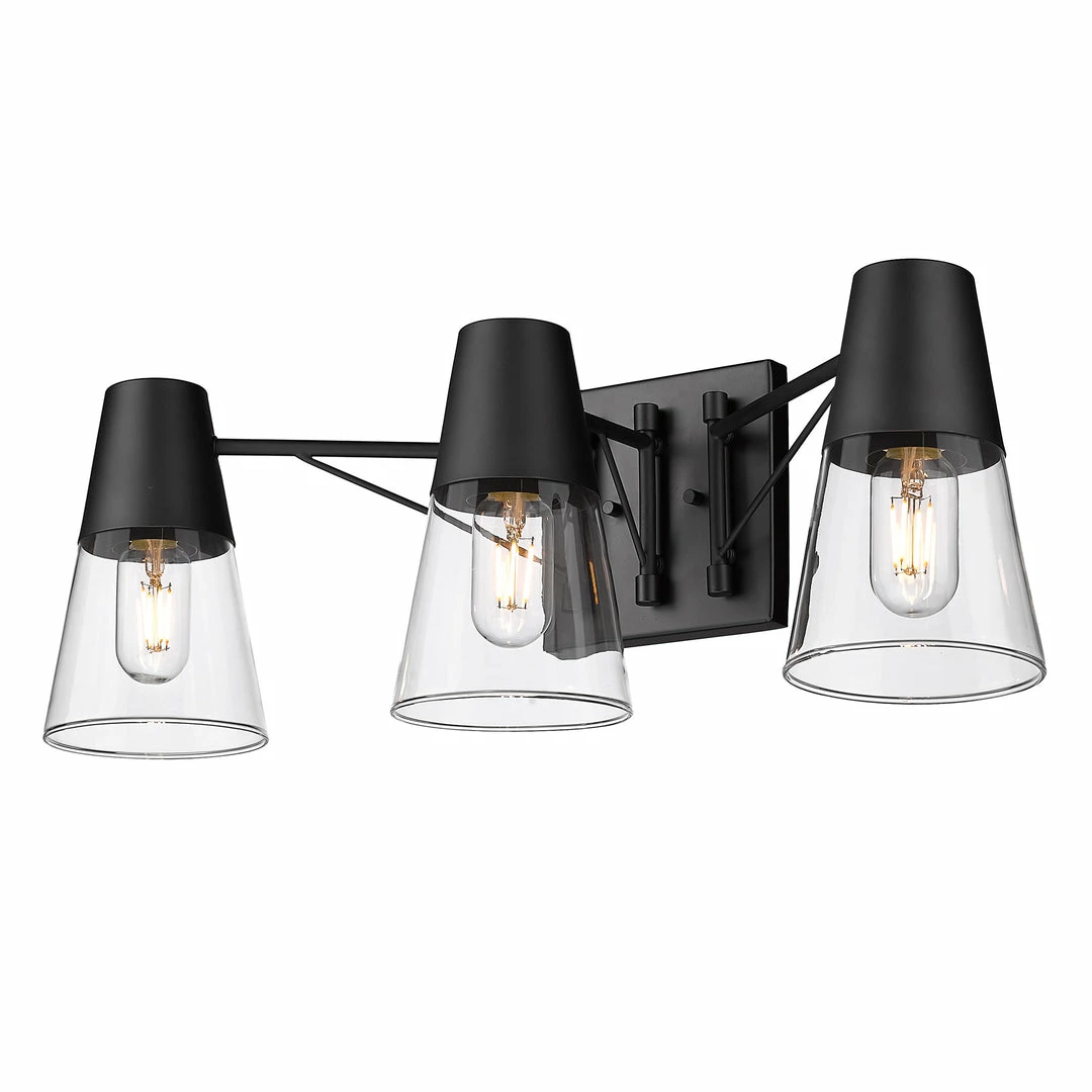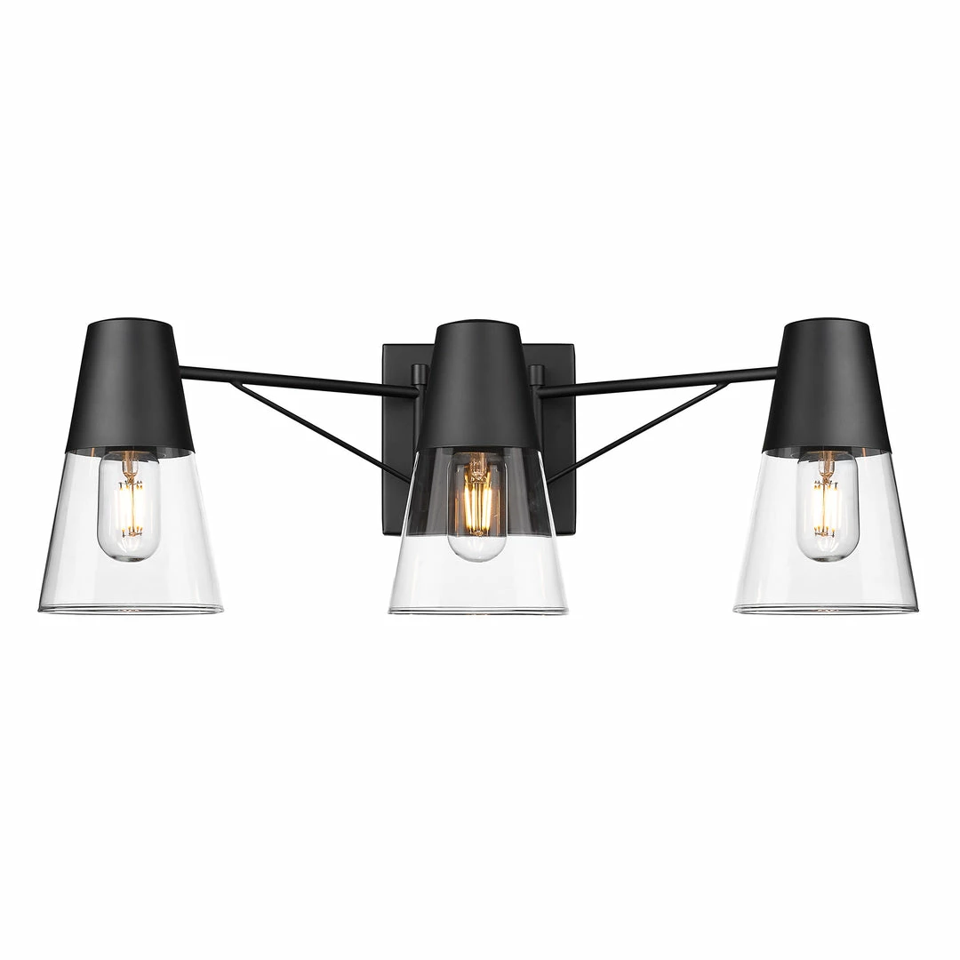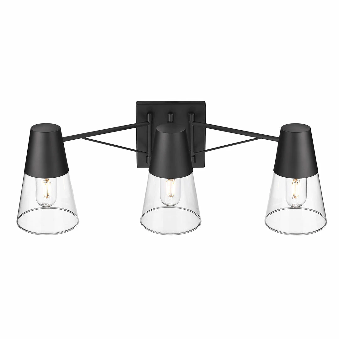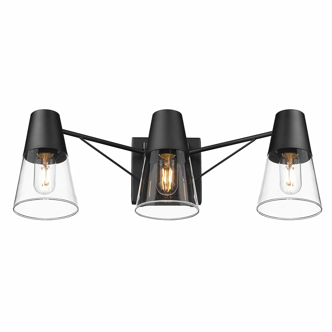 Industrial-inspired, Ryker is the perfect addition to the modern bathroom. A smooth Matte Black finish lends sophistication to the design. The unique double arms are reminiscent of suspension bridge cables. Hang above a mirror or vanity. Chunky metal cups house clear conical glass shades for wide-spread illumination where you need it most. Push the design further with Edison-style bulbs.