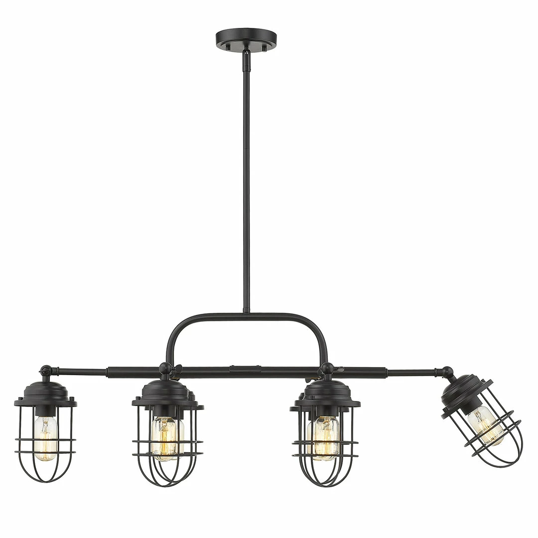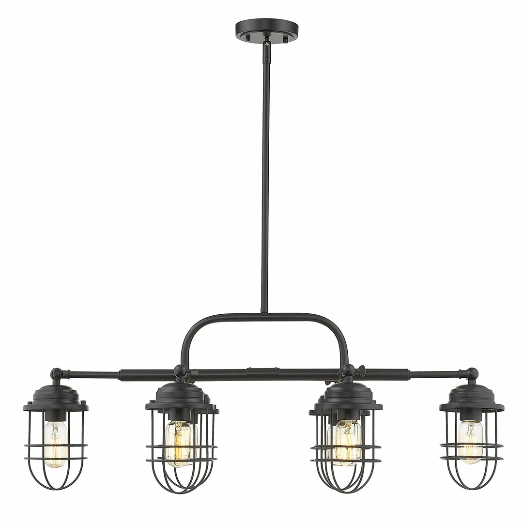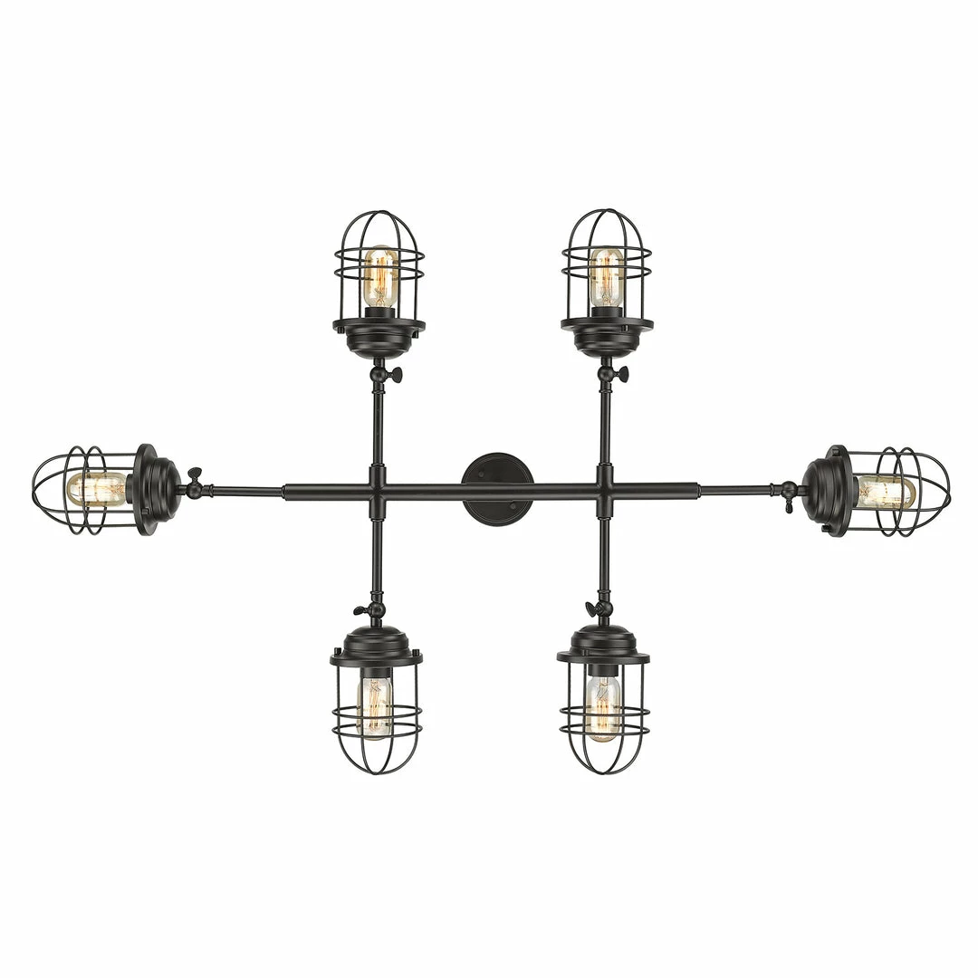 Nautical-inspired, Seaport is a collection of industrial fixtures to create your seaside retreat. Offered in a selection of finishes, the New England style is enhanced by protective cages that shield the otherwise exposed bulbs. Created to suit the needs of many, swivel canopies allow the fixtures to be mounted on sloped ceilings. Ball joints permit a multitude of configurations. Point all of the metal shades down for directional task lighting or angle them out to fit a low ceiling or tight space. This 6-light linear pendant perfectly illuminates an elongated bar, dining table, or kitchen island.