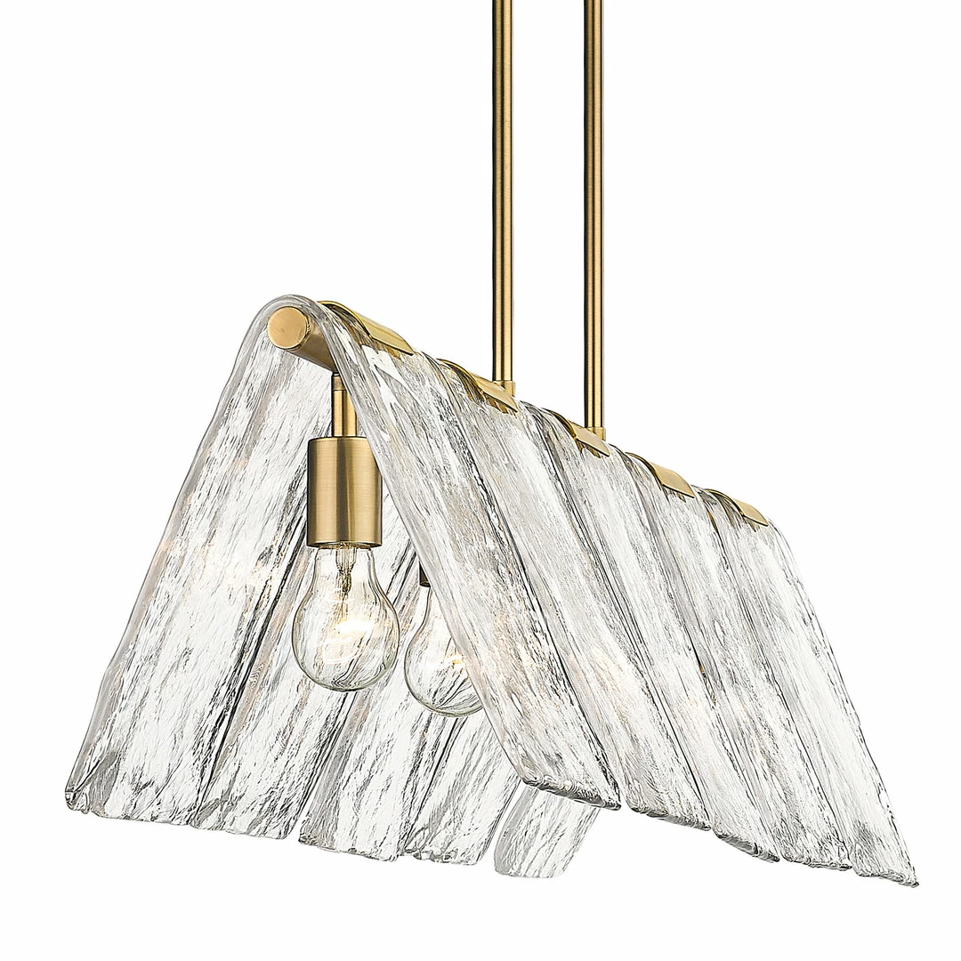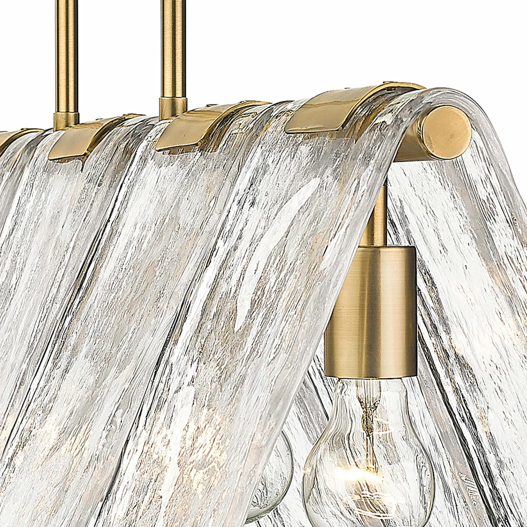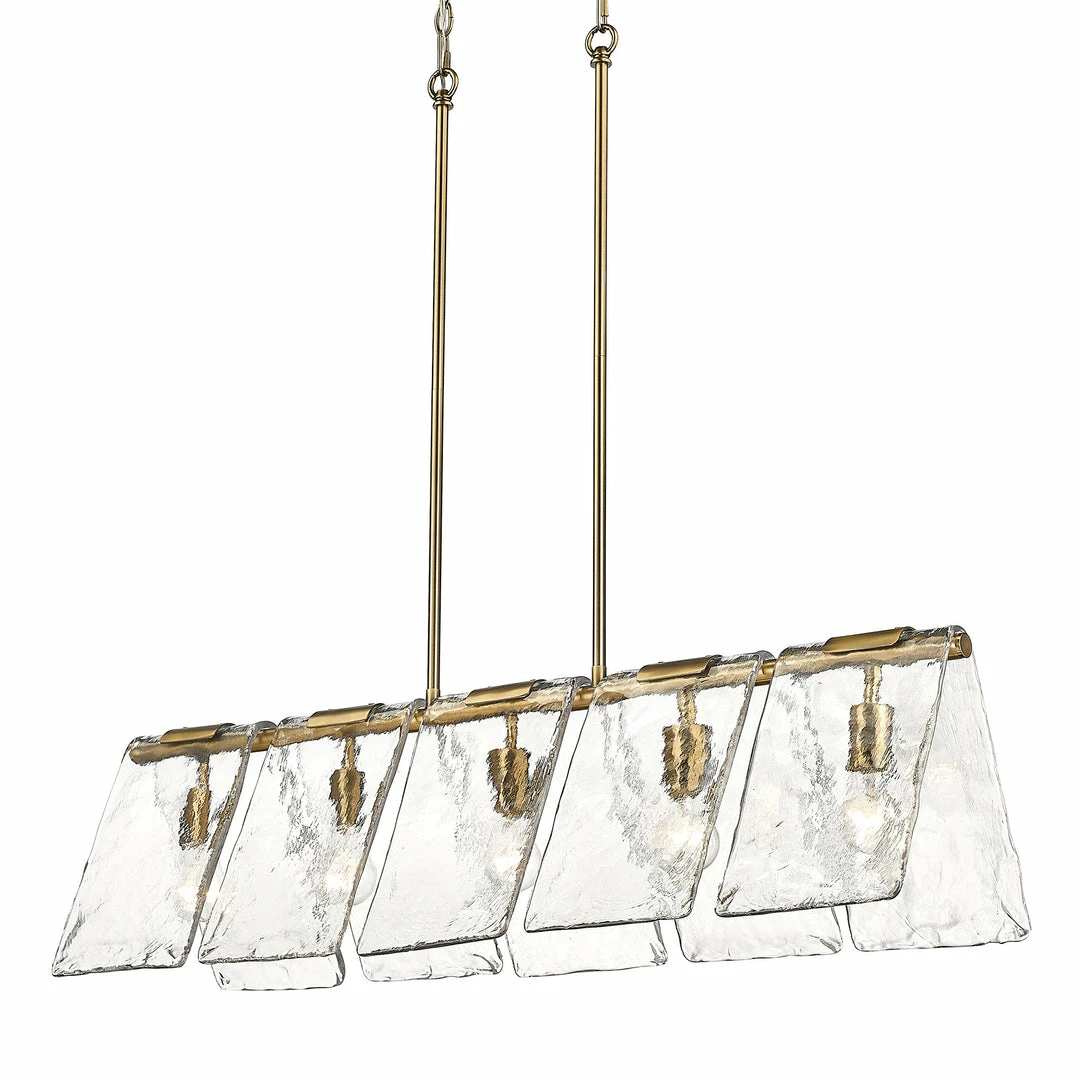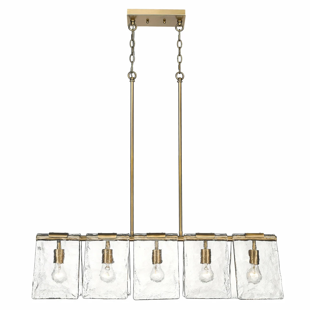 Instantly add elegance and tranquility to your home with the beautiful Serenity pendant. A contemporary tribute to nature, the draped Hammered Water Glass resembles flowing water. Functional and beautiful, the texture of the thick clear glass softens the bright light while allowing for maximum lumens output. For an added level of sophistication, the metal hardware features a warm, Modern Brass finish. Hang this minimalist 5-light linear pendant over a table or kitchen counter.