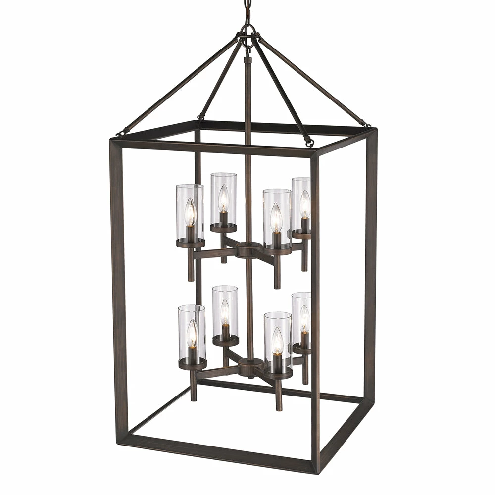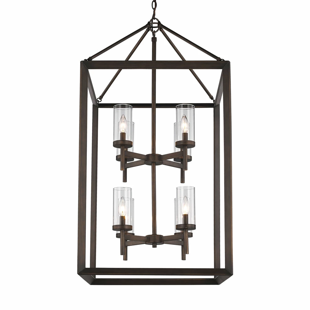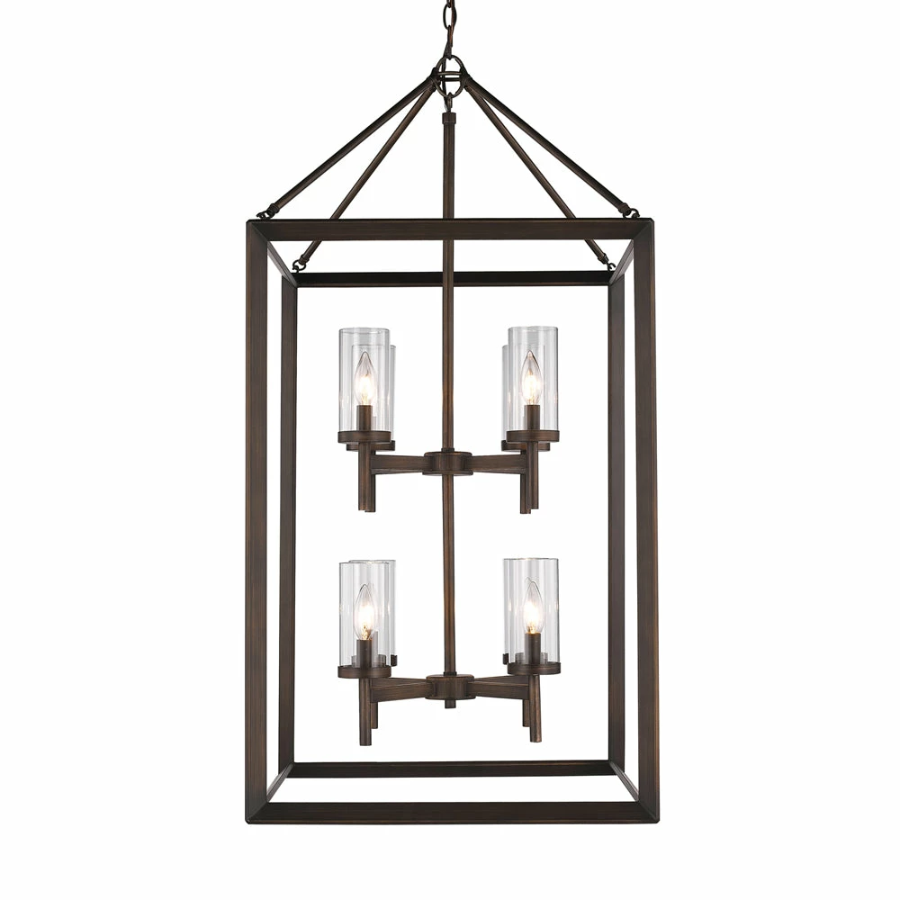 Modern lanterns featuring a handsome beveled cage design. Make an elegant statement in the Smyth collection. Clean geometry creates contemporary style with steel candles and candelabra bulbs encased in select glass options. The fixtures are offered in a variety of finishes. This 8-light pendant creates a stylish focal point comfortably sized for living, dining areas, and foyers.