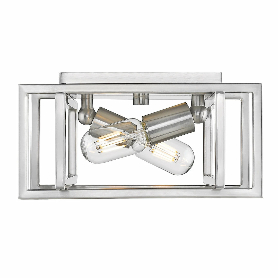 Tribeca is a contemporary, geometric series of customizable layered boxes. These striking open-cage fixtures bring sophisticated style to a space. Offered in a variety of finish options and silhouettes, including two-tone combinations, this clean transitional design pairs well with modern fashions. This 2-light flush mount creates a generous open area for widespread ambient lighting.