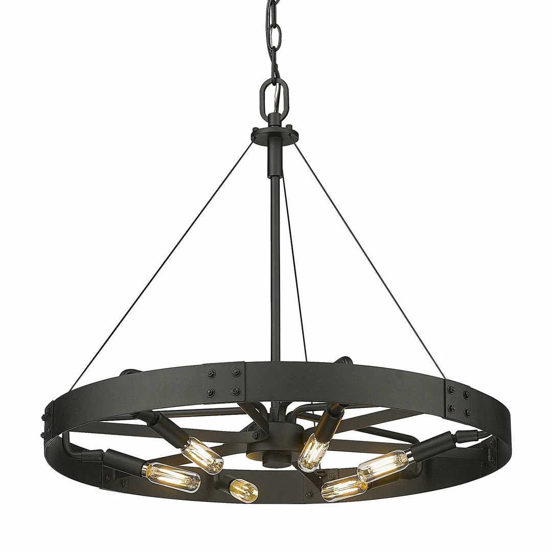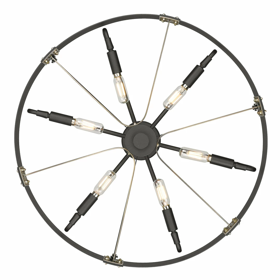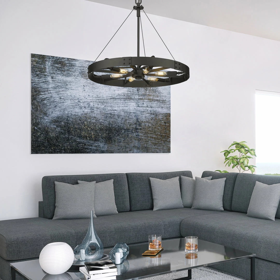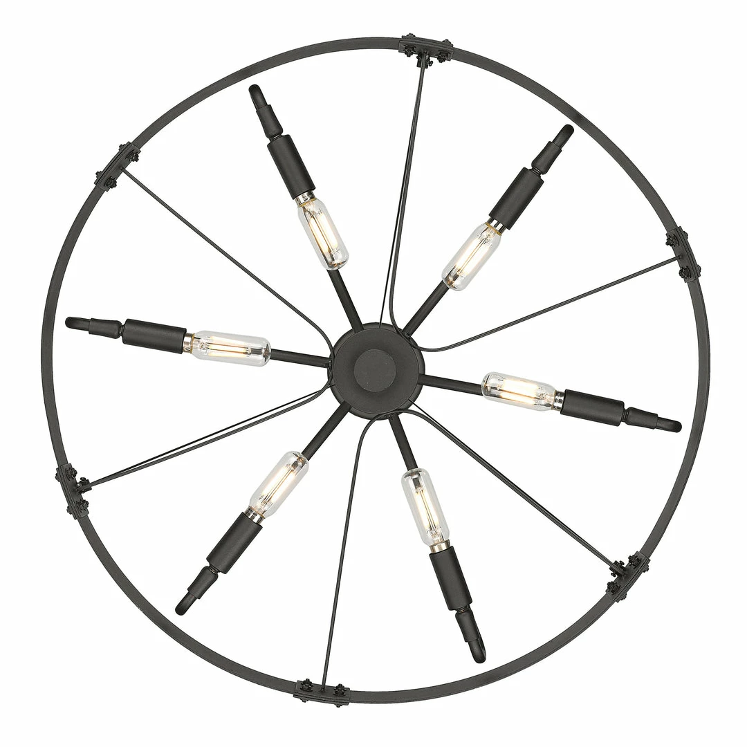 Industrial by nature, Vaughn fits well in contemporary homes. Inspired by the spokes of a vintage wagon wheel, this collection brings antiquity to the modern age. The Natural Black finish is slightly textured and adds drama to this focal series. Select a monochromatic version or elevate the look by selecting a fixture with contrasting aged brass accents. Pivoting sockets and steel cables act as additional features to the bold design.