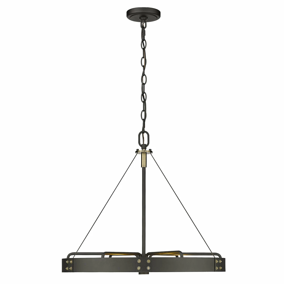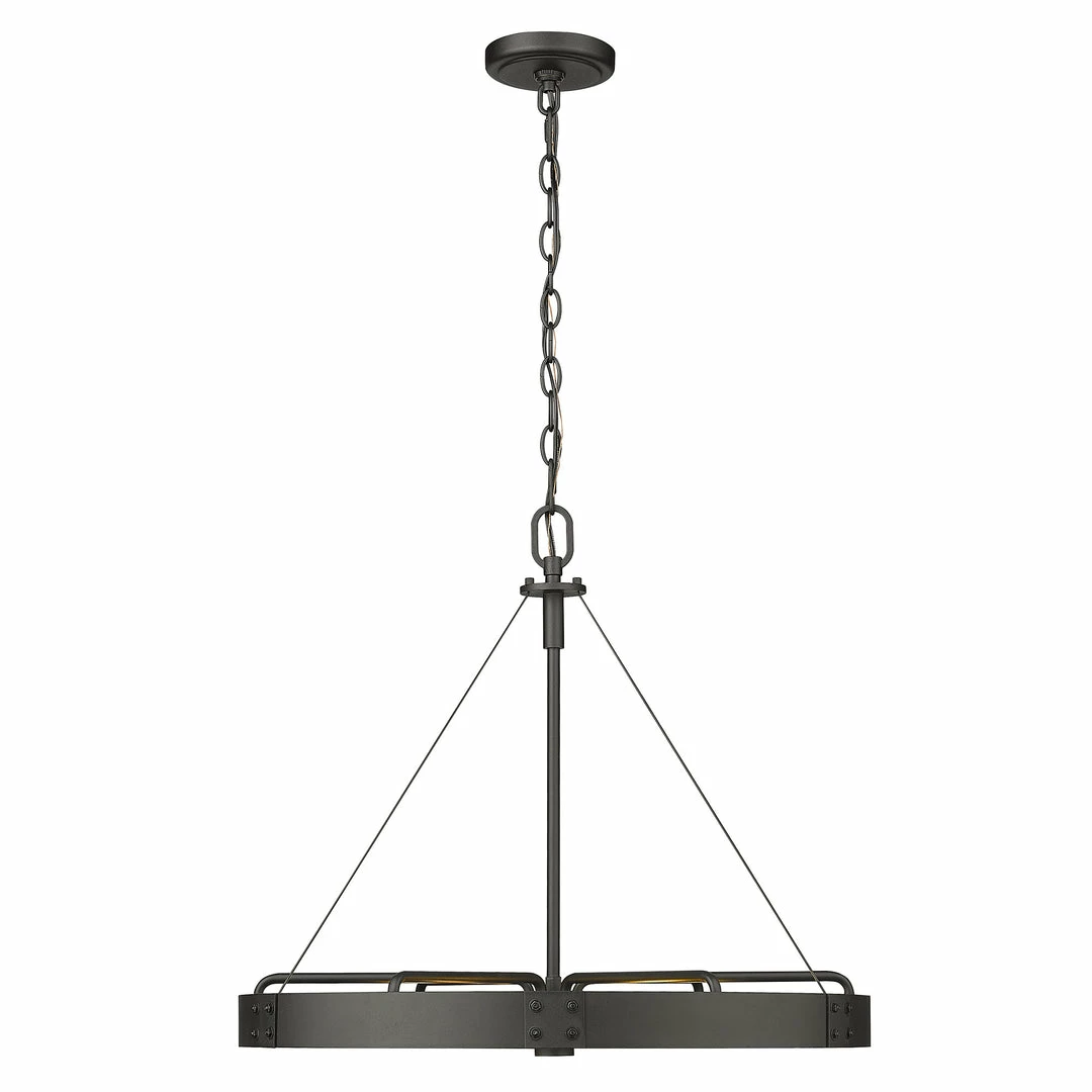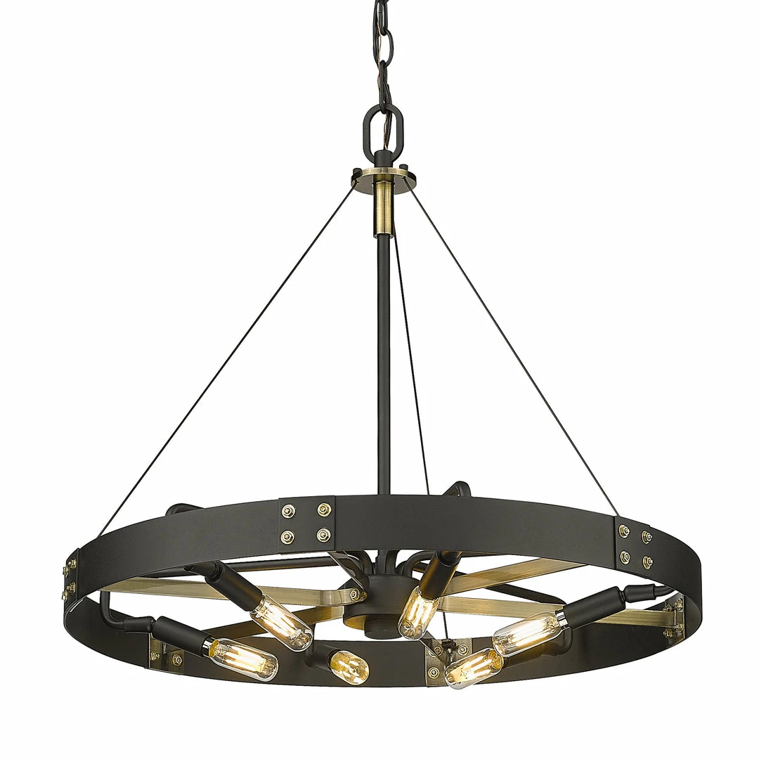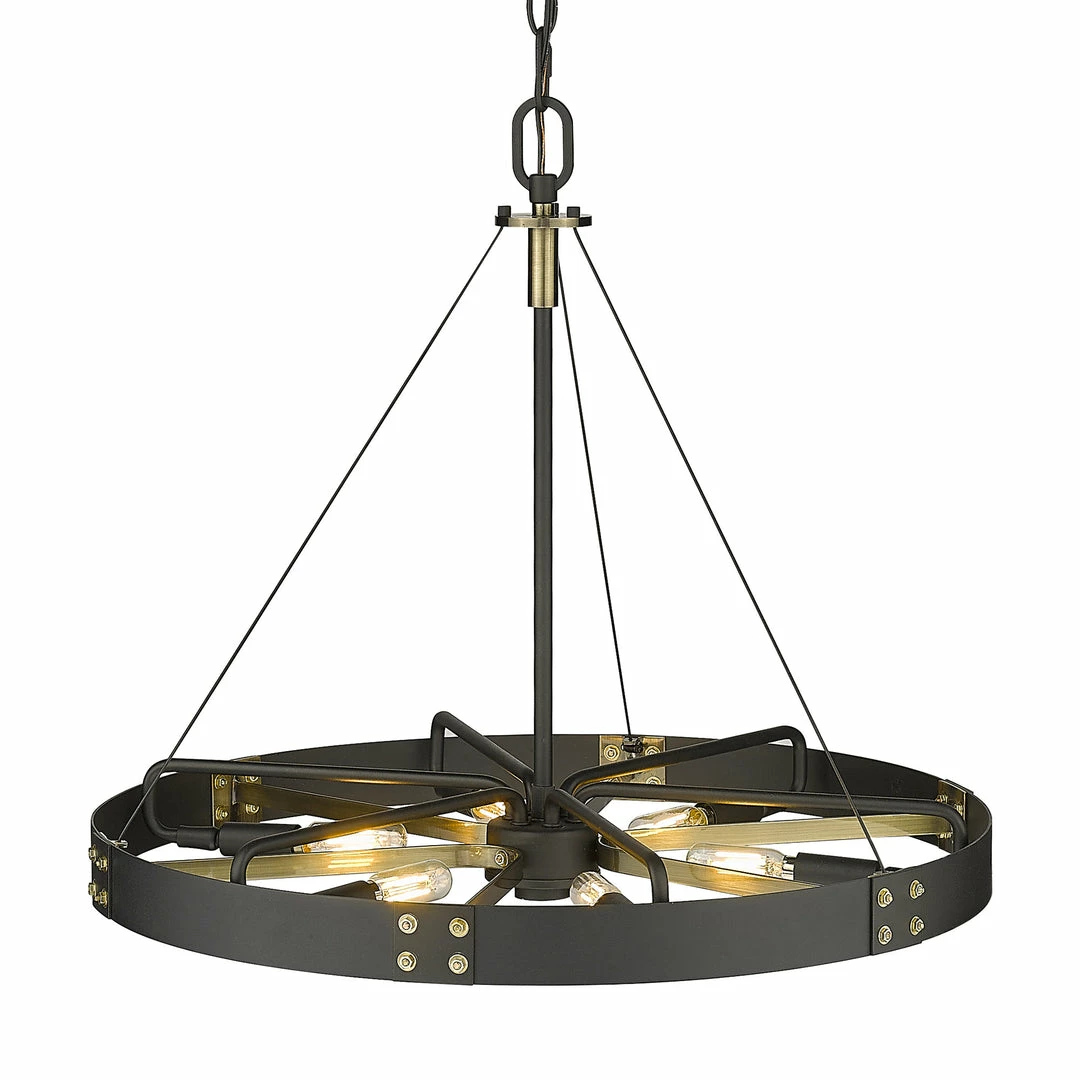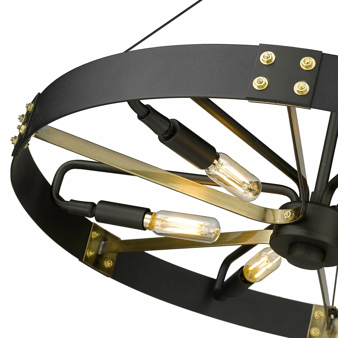 Industrial by nature, Vaughn fits well in contemporary homes. Inspired by the spokes of a vintage wagon wheel, this collection brings antiquity to the modern age. The Natural Black finish is slightly textured and adds drama to this focal series. Select a monochromatic version or elevate the look by selecting a fixture with contrasting aged brass accents. Pivoting sockets and steel cables act as additional features to the bold design.
