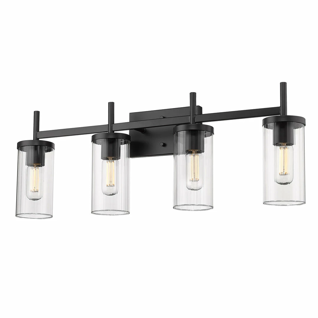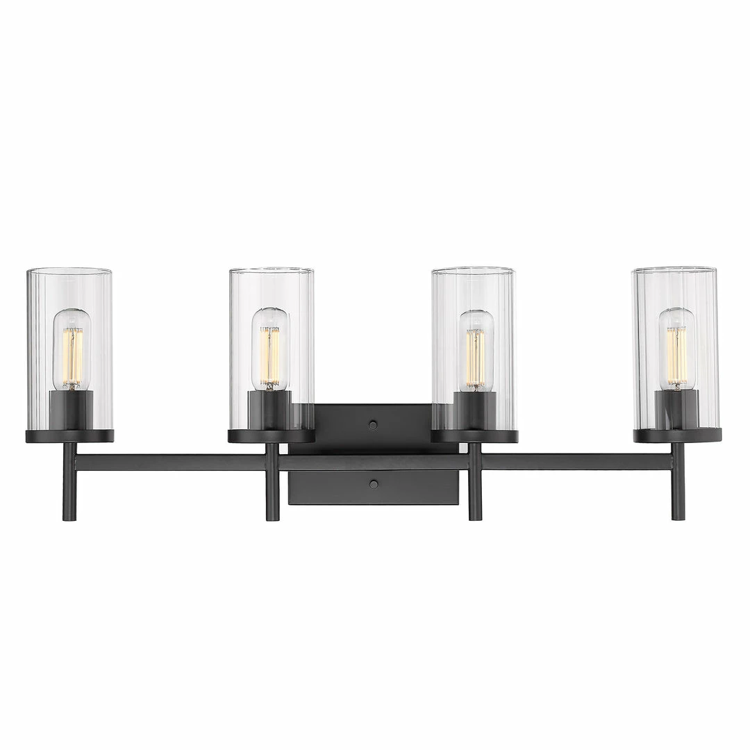 The Winslett collection is versatile and transitional in style. Classic silhouettes are perfectly matched with clean, modern lines for a mixture of form and function. Bright bulbs shine within ribbed clear glass shades. The linear texture, made by a glass-blowing technique, creates the optical illusion of distortion. The vertical lines in the glass provide gentle diffusion while playfully refracting light. Offered in a selection highly adaptable finishes, the Winslett collection is suitable for a variety of decors. This 4-light bath vanity is UL approved damp locations.