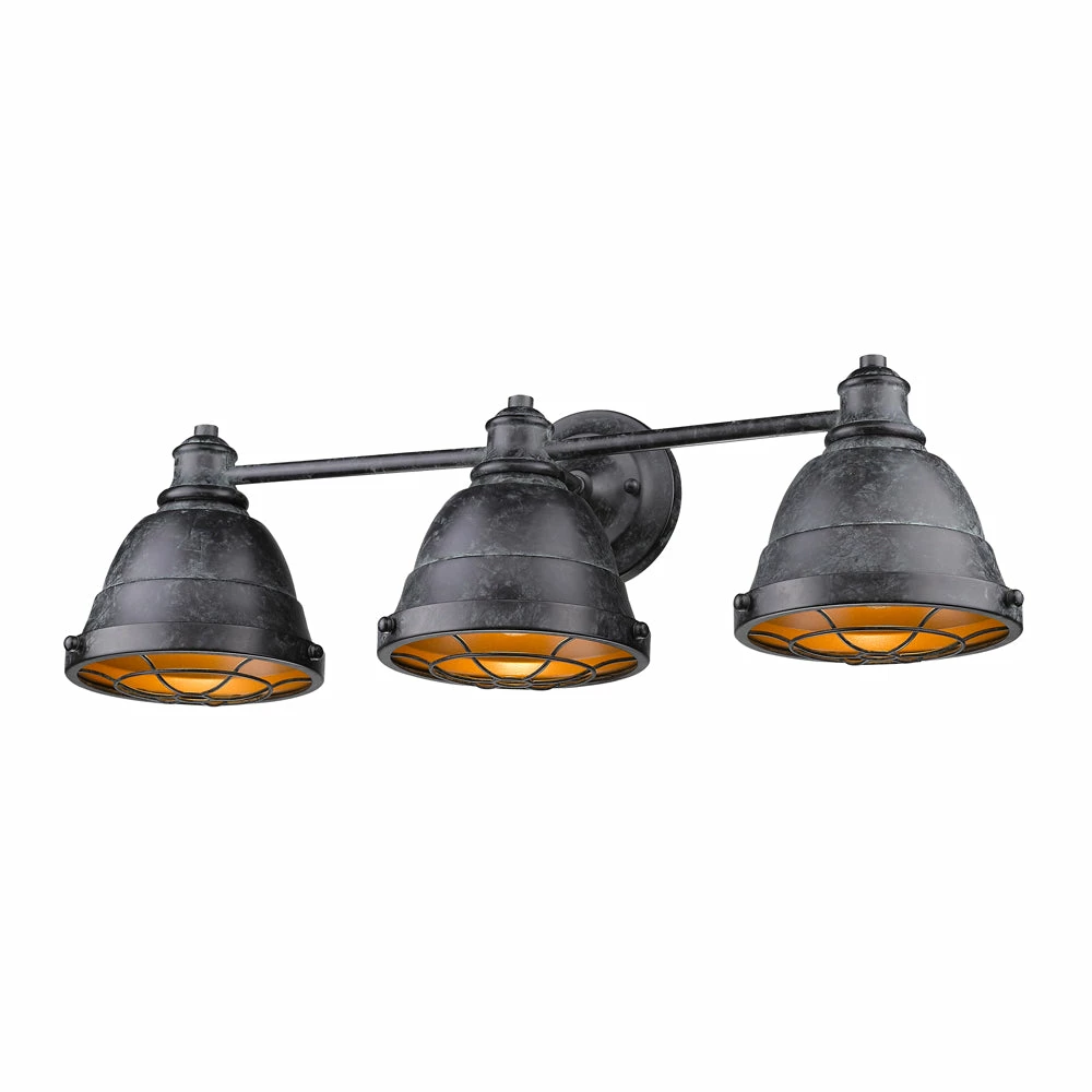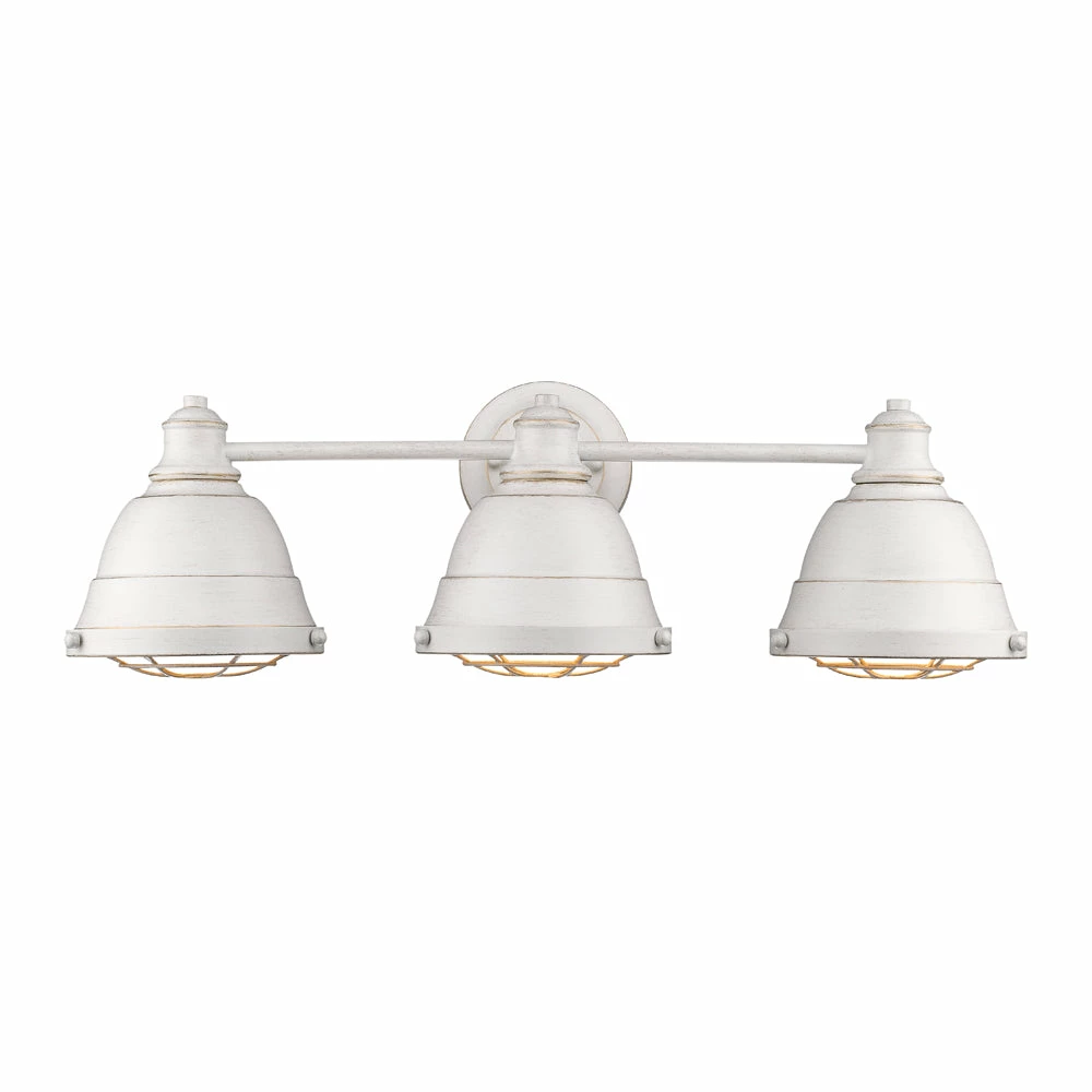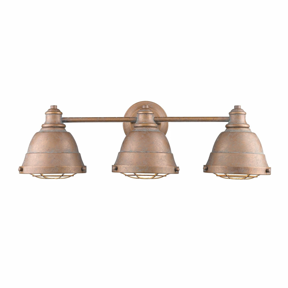 The Bartlett collection features industrial, vintage-inspired fixtures with simple, traditional silhouettes that are a nod to a bygone era. The collection features authentic details like caged diffusers and exposed hardware. Available in a selection of rustic finishes. This 3-light bath vanity is UL approved damp locations.
