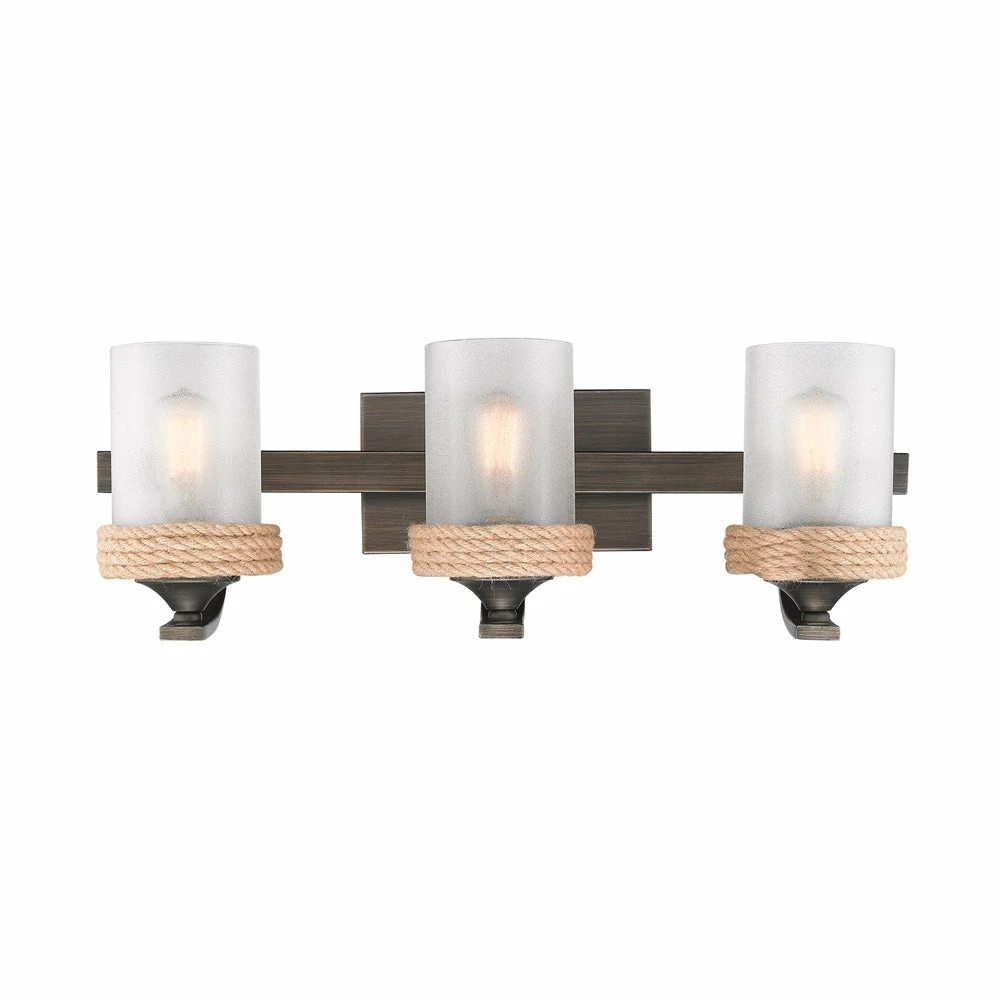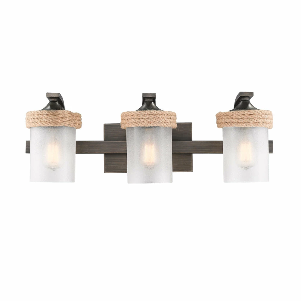 Inspired by the sea, this coastal collection features a simple design with authentic, nautical details. Tied in sailor’s knots, woven ropes loop metal cleats before being suspended from maritime hooks. The contrast between the available finish options and texture of the rope and metalwork creates visual interest. The white glass is softly frosted to diffuse the light. This look is perfect for seaside retreats, casual lofts, and rustic bungalows. This 3-light bath vanity is UL approved for damp locations.