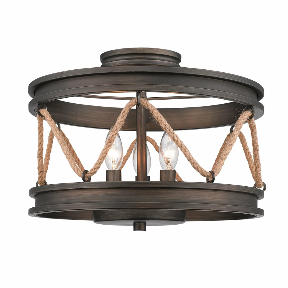 Inspired by the sea, this coastal collection features a simple design with authentic, nautical details. Tied in sailor’s knots, woven ropes loop metal cleats before being suspended from maritime hooks. The contrast between the available finish options and texture of the rope and metalwork creates visual interest. This look is perfect for seaside retreats, casual lofts, and rustic bungalows. With its candelabras and open form, this 3-light semi-flush brightens a space with widespread ambient light.