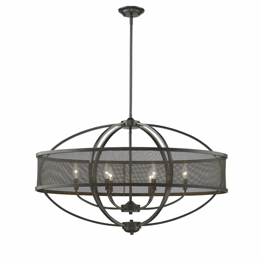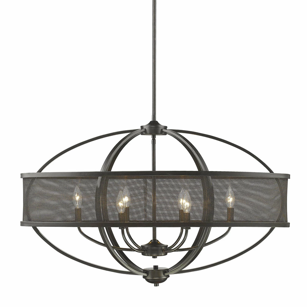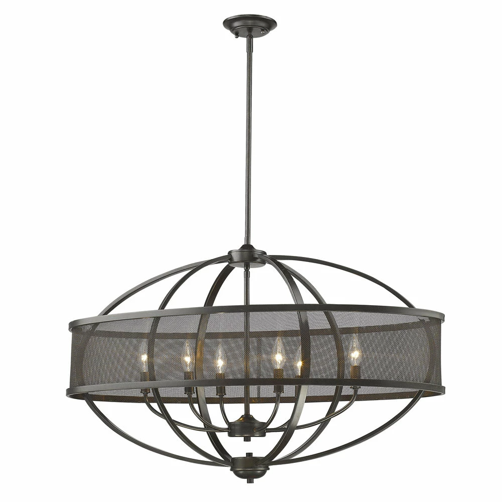 This transitional and industrial-chic design is ideal for lofts, farmhouses, and contemporary interiors. Curvaceous arms sit inside simple round frames. The extensive collection includes wall and ceiling fixtures. Fixtures may be purchased with or without metal mesh shades. The optional shades shield the exposed bulbs of these elemental fixtures. Available in multiple finishes, this elongated, oval linear pendant illuminates a kitchen bar, dining table, or similar area without interfering with activity at the surface.