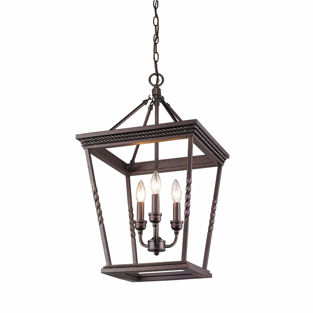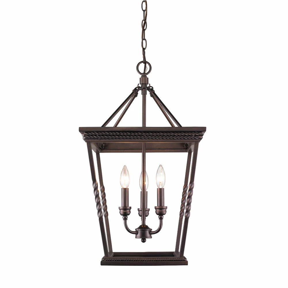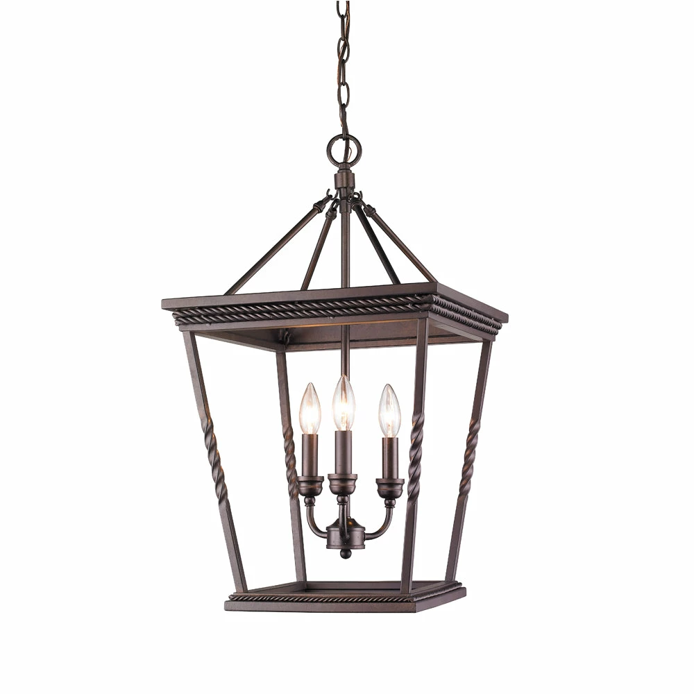 The Davenport collection is an updated, traditional style that features a series of large, traditional, classic box lanterns. The open-cage design is accented by a simple, decorative, rope braid detail and the exposed steel candles and candelabra bulbs create a stunning effect. The hand-painted Etruscan Bronze finish is multi-layer and has faint gold highlights. This 3-light pendant is perfect for a small dining room, nook, or entry.