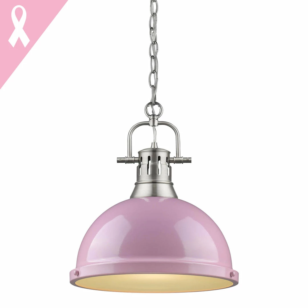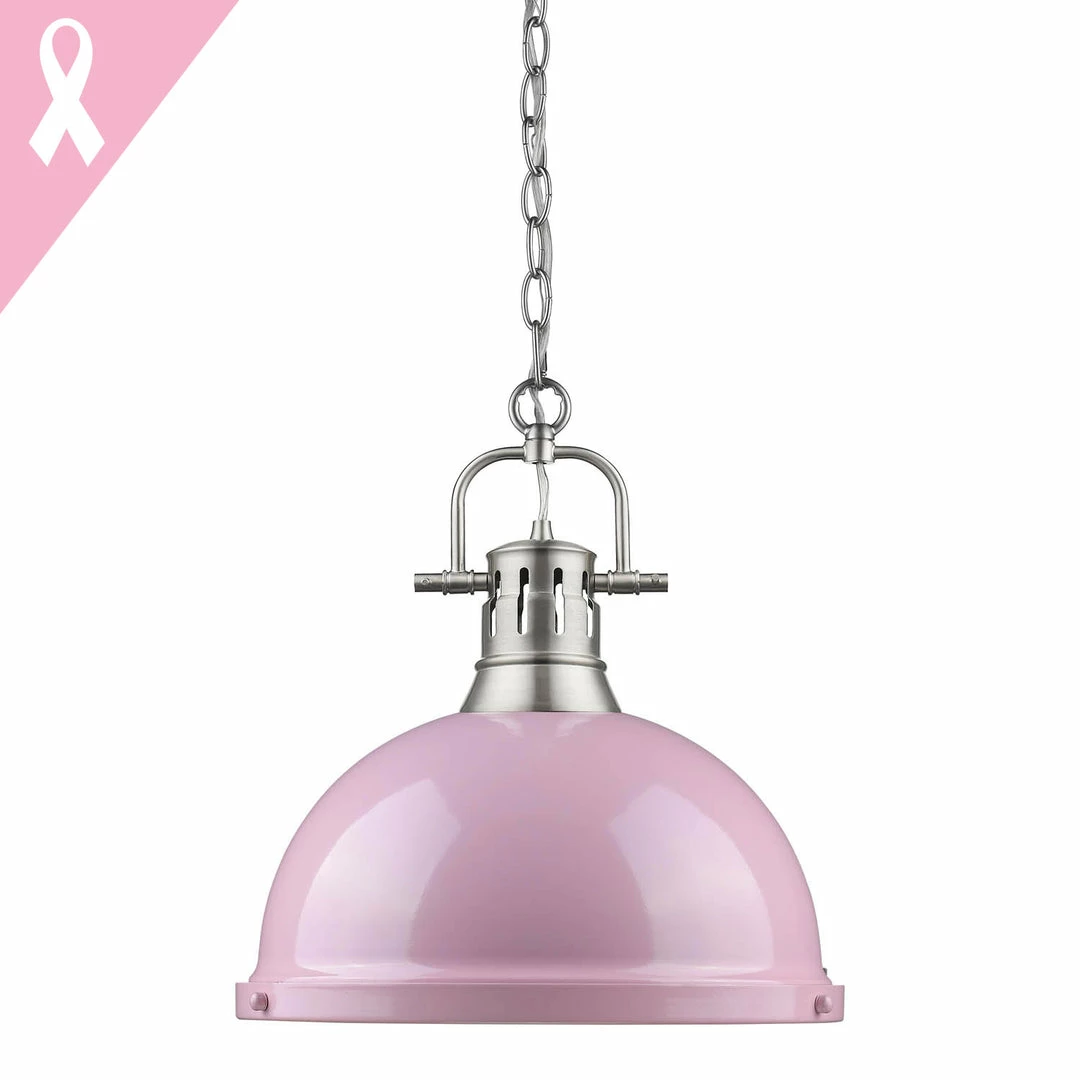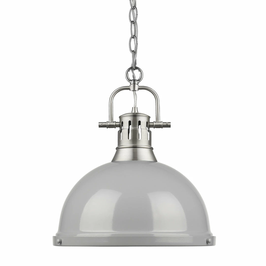 The Duncan collection is contemporary style with an industrial feel. The collection features a variety of simple, traditional silhouettes that are a nod to a bygone era. Transform the look of your room with these classic, vintage-inspired fixtures. A variety of plated and painted metal shade finishes are offered in choice combinations. This large, chain-hung pendant features a glass diffuser and is comfortably sized for a small nook or island. The pendant may be hung individually or grouped over a bar.