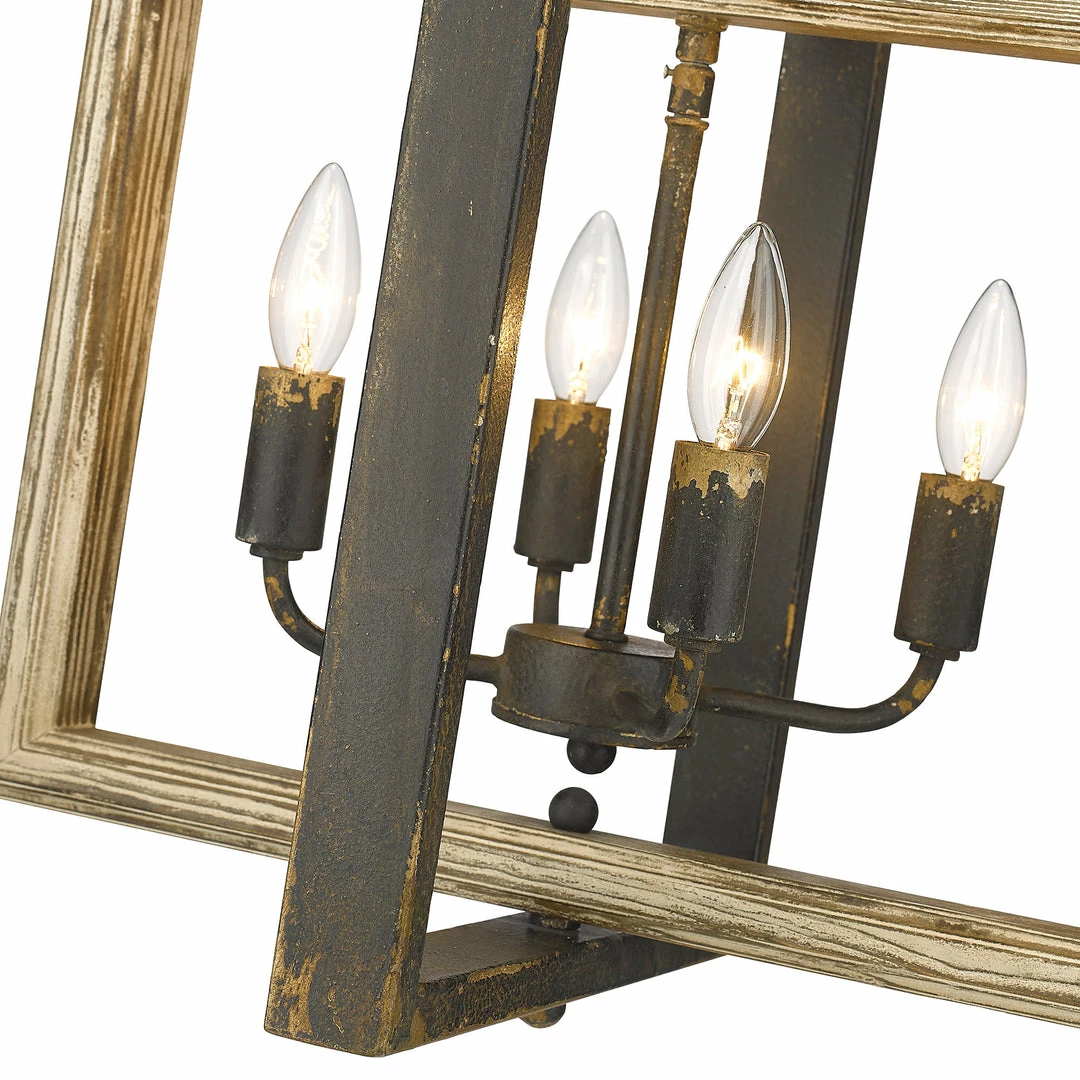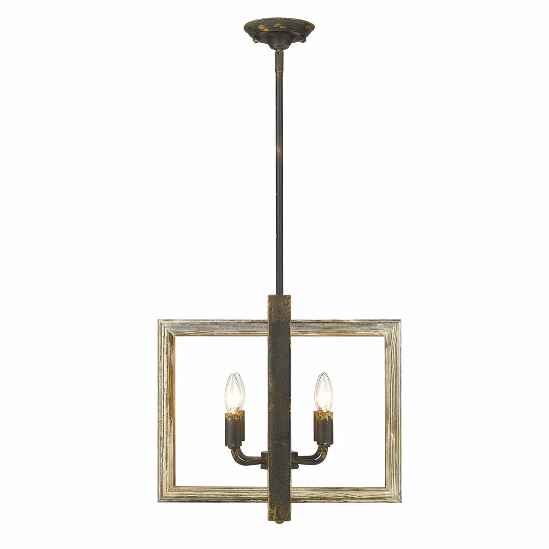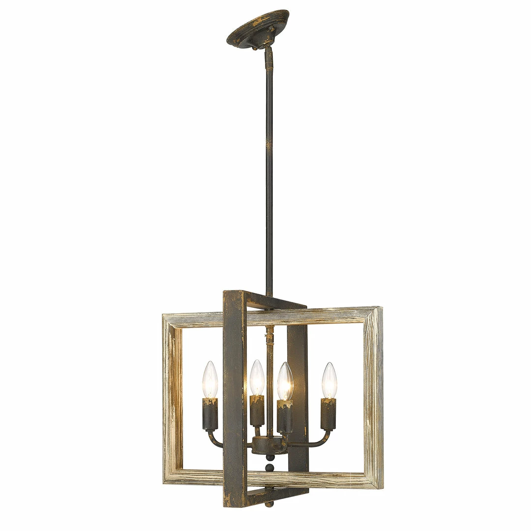 With a mixture of metal and wood materials, Harvey is a two-tone Rustic-Modern box. This vintage-inspired design has an attractive, industrial feel. An inner frame composed of light wood in a heavy natural grain sits inside a metal frame finished in an Antique Black Iron finish. A simple canopy and rods that match the rest of the fixture’s hardware suspend perpendicular frames for a contemporary look. Within the geometric framework sits a cluster of four upright candle lights. Use this simple and sophisticated 4-light fixture to enhance your rustic farmhouse or coastal design.