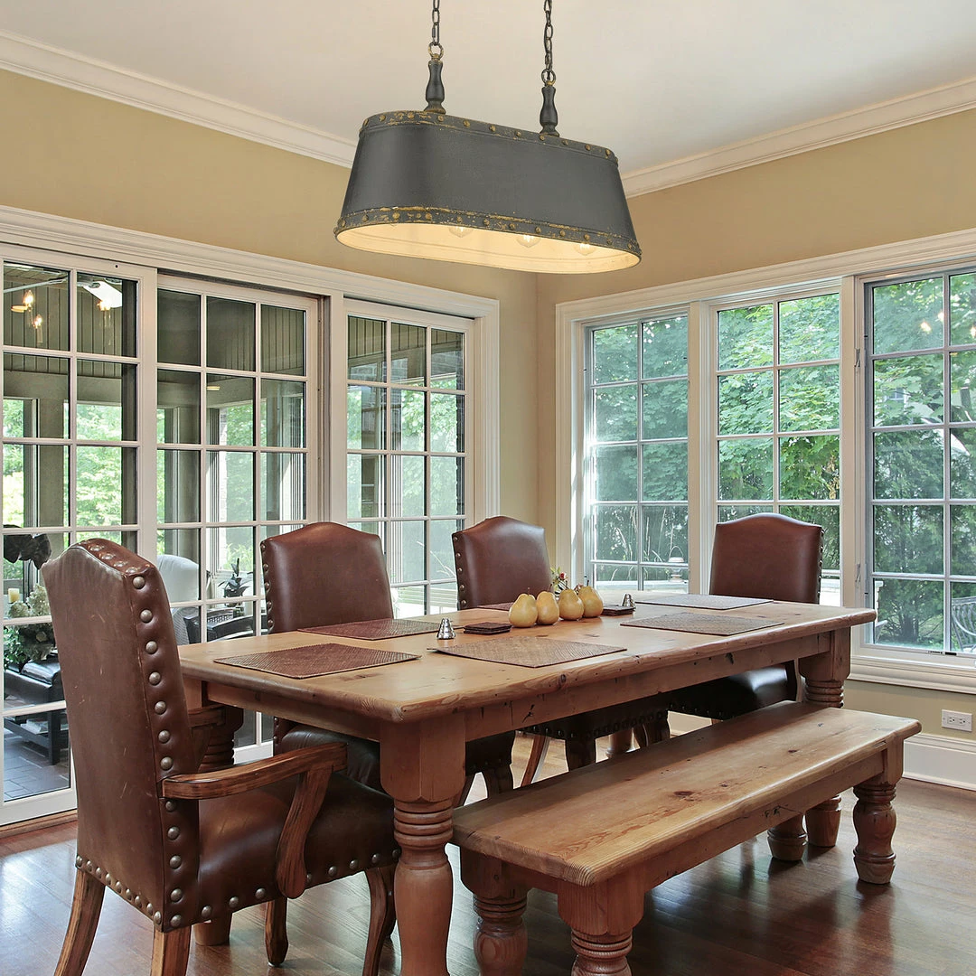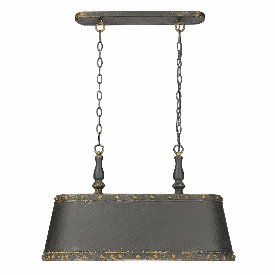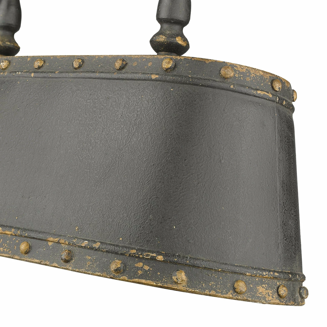 The sophisticated styling of Hemlock lends itself a seat in the most prestigious cigar room. Antique black iron finish enhances the aged quality of this series as if mimicking a charred, smokey antique. Button-like rivets line the top and bottom edge of the shade accentuating its masculine appearance.