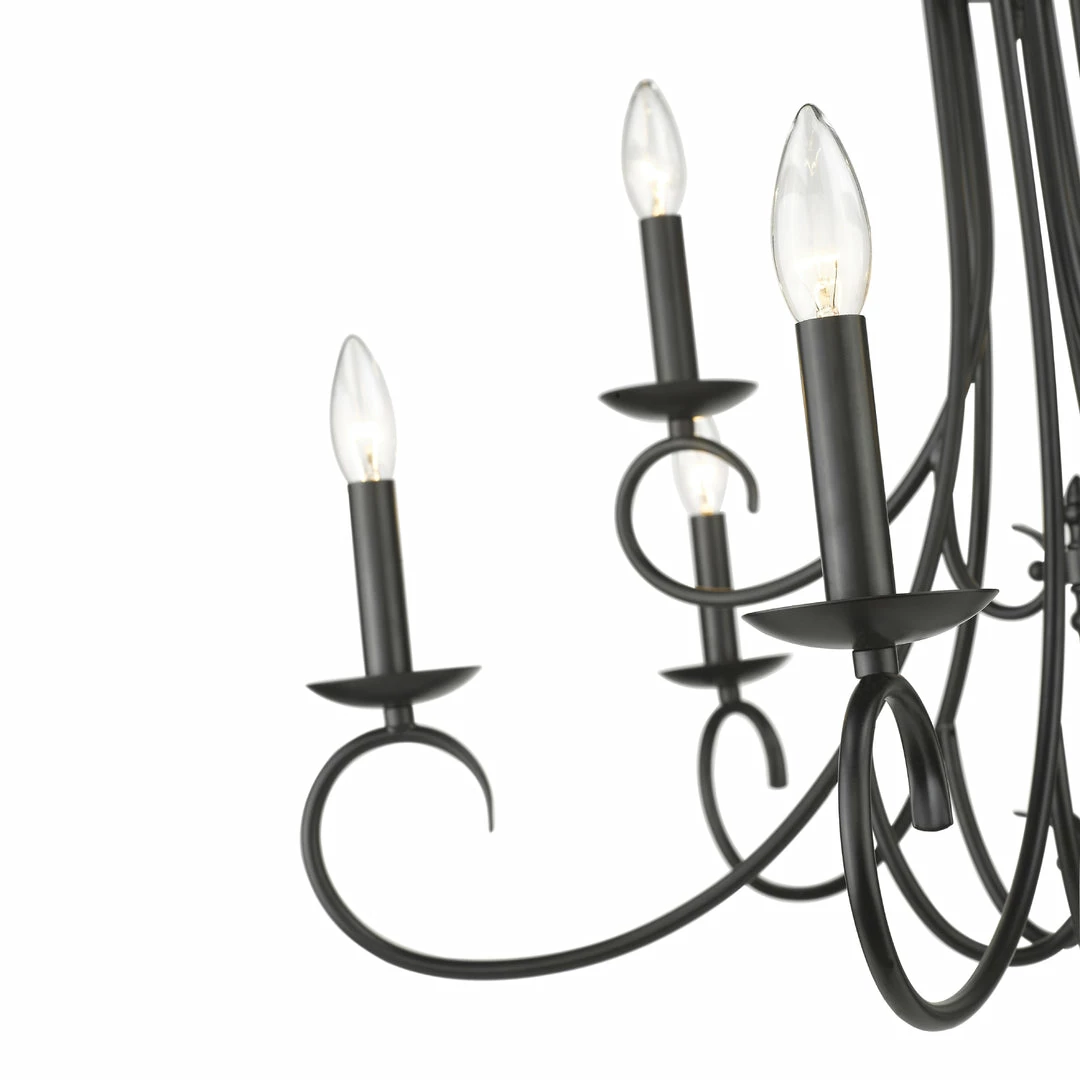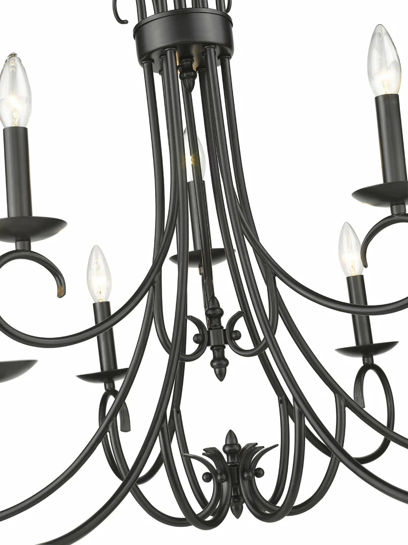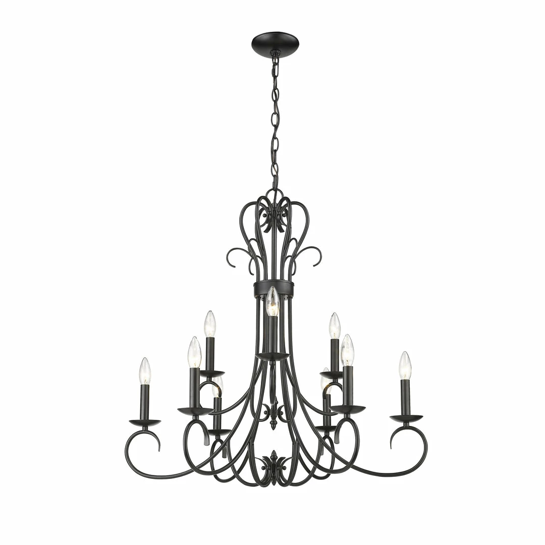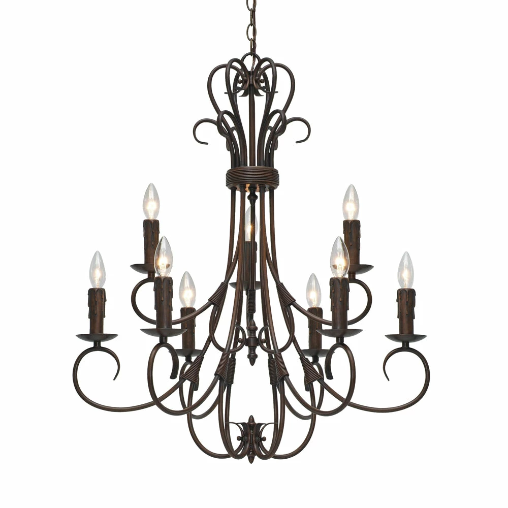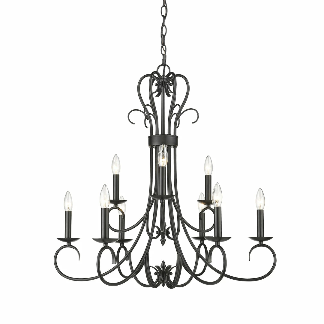 Earthy tones and organic lines make the Homestead collection a comforting addition to the transitional style home. Whether the decor is eclectic, casual, or even traditional, Homestead pieces blend well in cozy environments. Available in multiple finishes, these options give depth and weight to the collection’s delicately curved arms. A selection of glass options partner perfectly with these finish options. This 2-tier, 9-light candelabra chandelier with candlesticks creates a dramatic focal point graciously sized for taller living and dining areas.