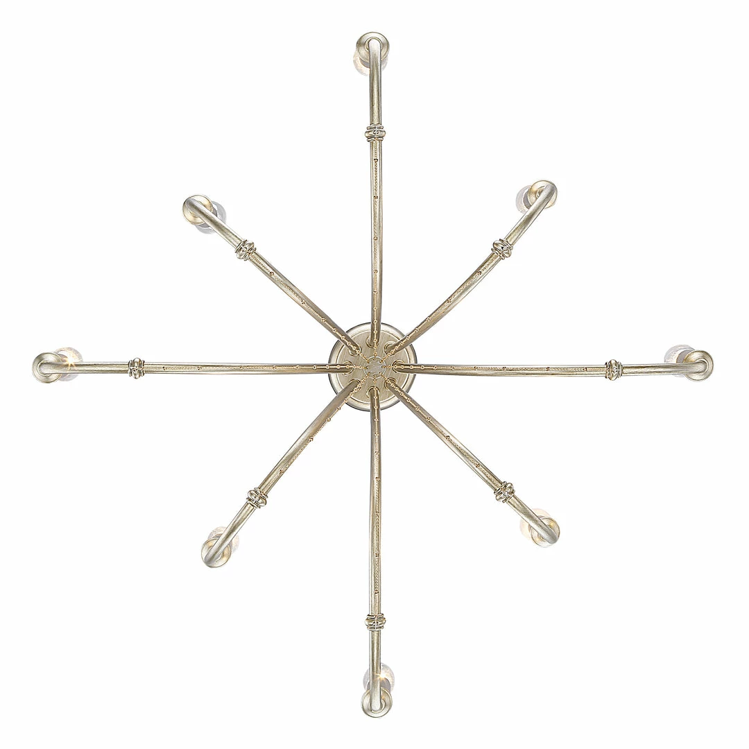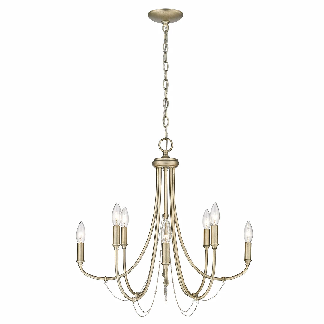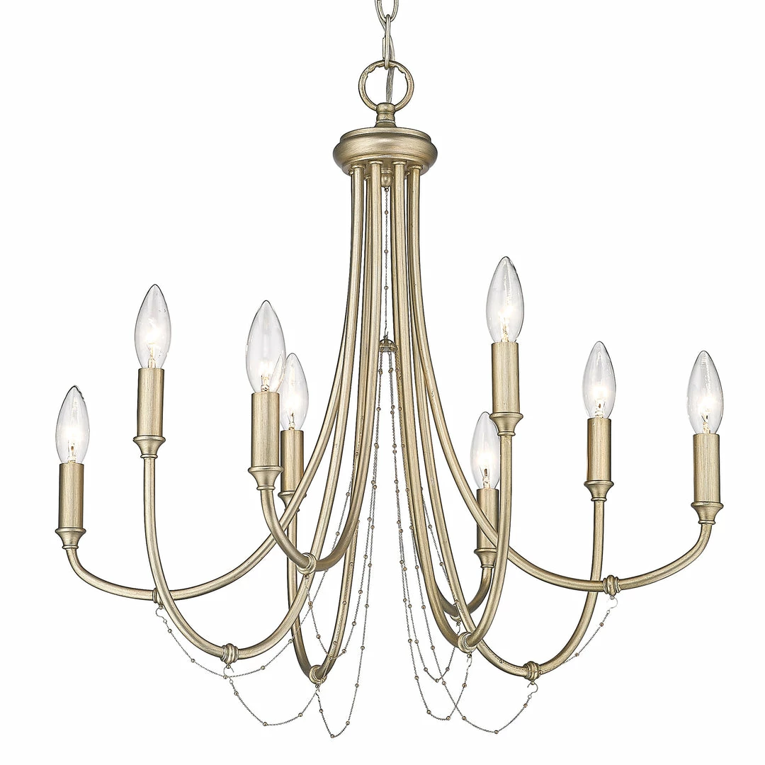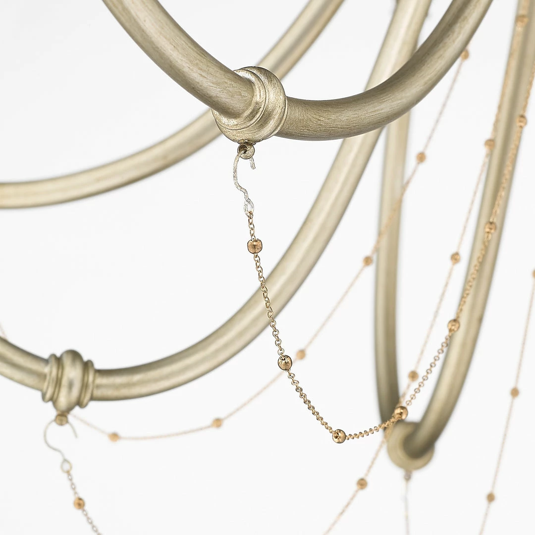 Modern elegance, Kamila is a contemporary update to traditional chandeliers. Pretty and feminine, Kamila was designed to liven conservative spaces. Decorative gold chains with small beads adorn the sweeping arms. Finished in a soft White Gold finish, the fixture features exposed bulbs and fashionable candelabras.