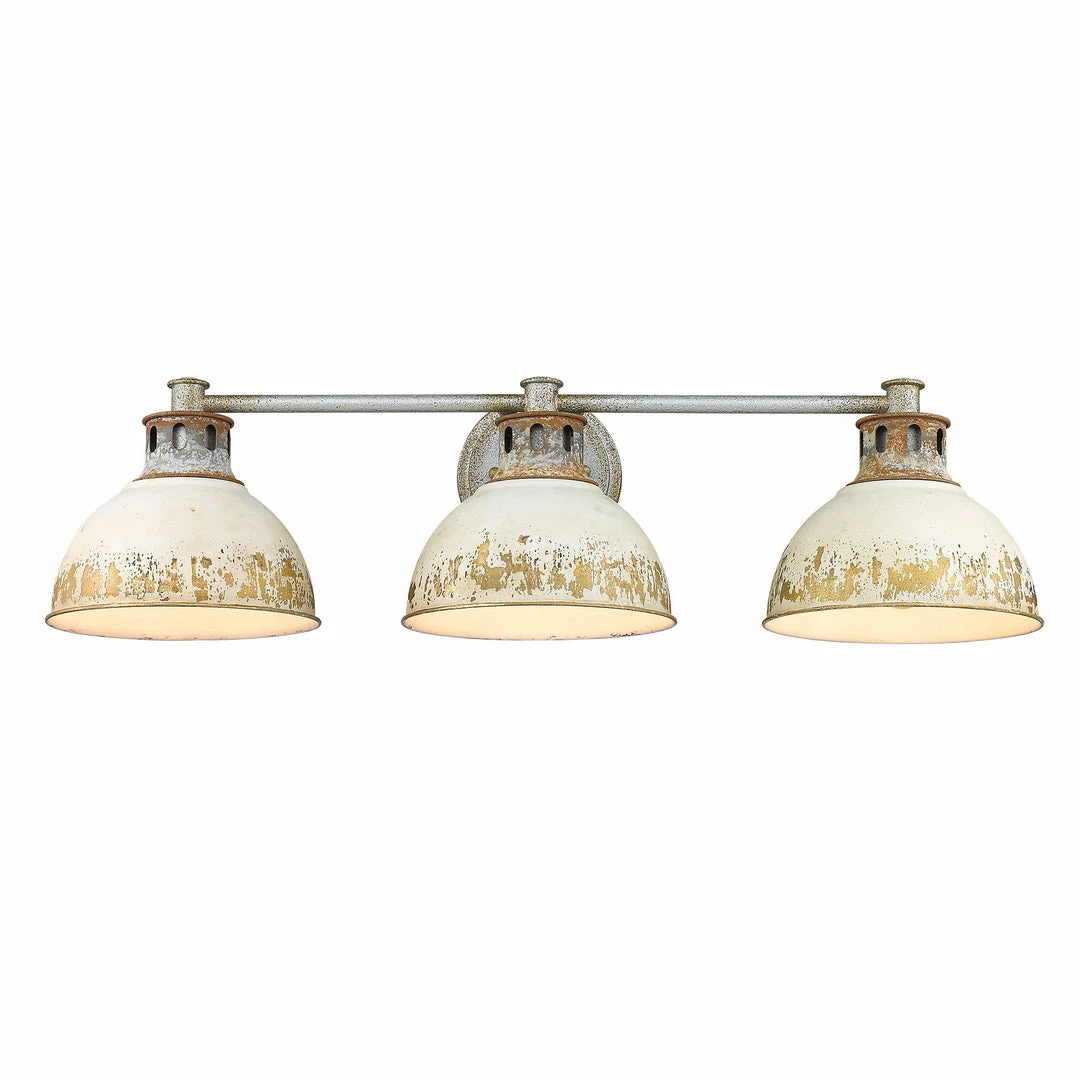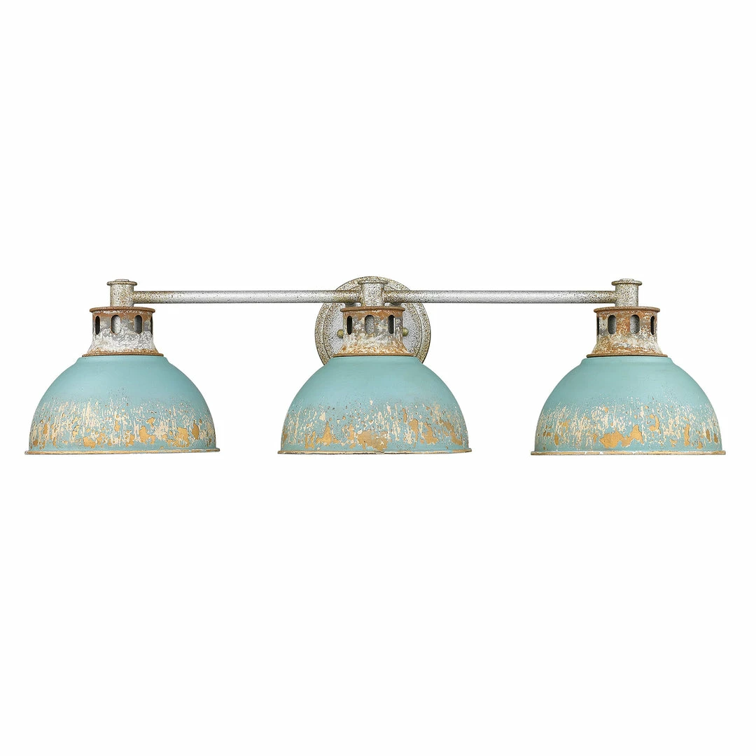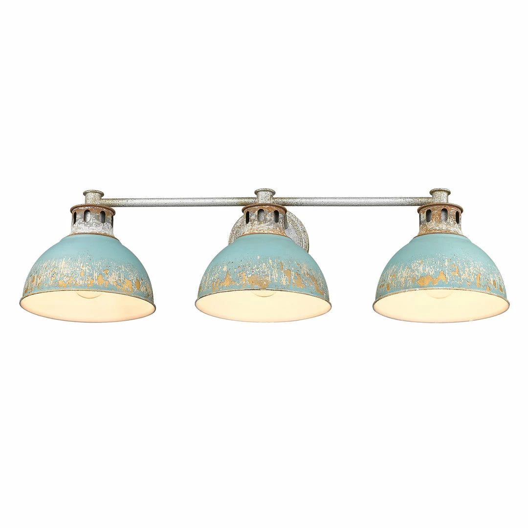 Kinsley has a rustic, vintage appeal that is perfect for homes with eclectic or farmhouse decor. The Aged Galvanized Steel frame balances the numerous antique shade color options offered in this collection. The hand-painted series has a distressed, weathered look. Choose a shade that fits your existing color scheme or opt to design around a variety of vintage shade options.