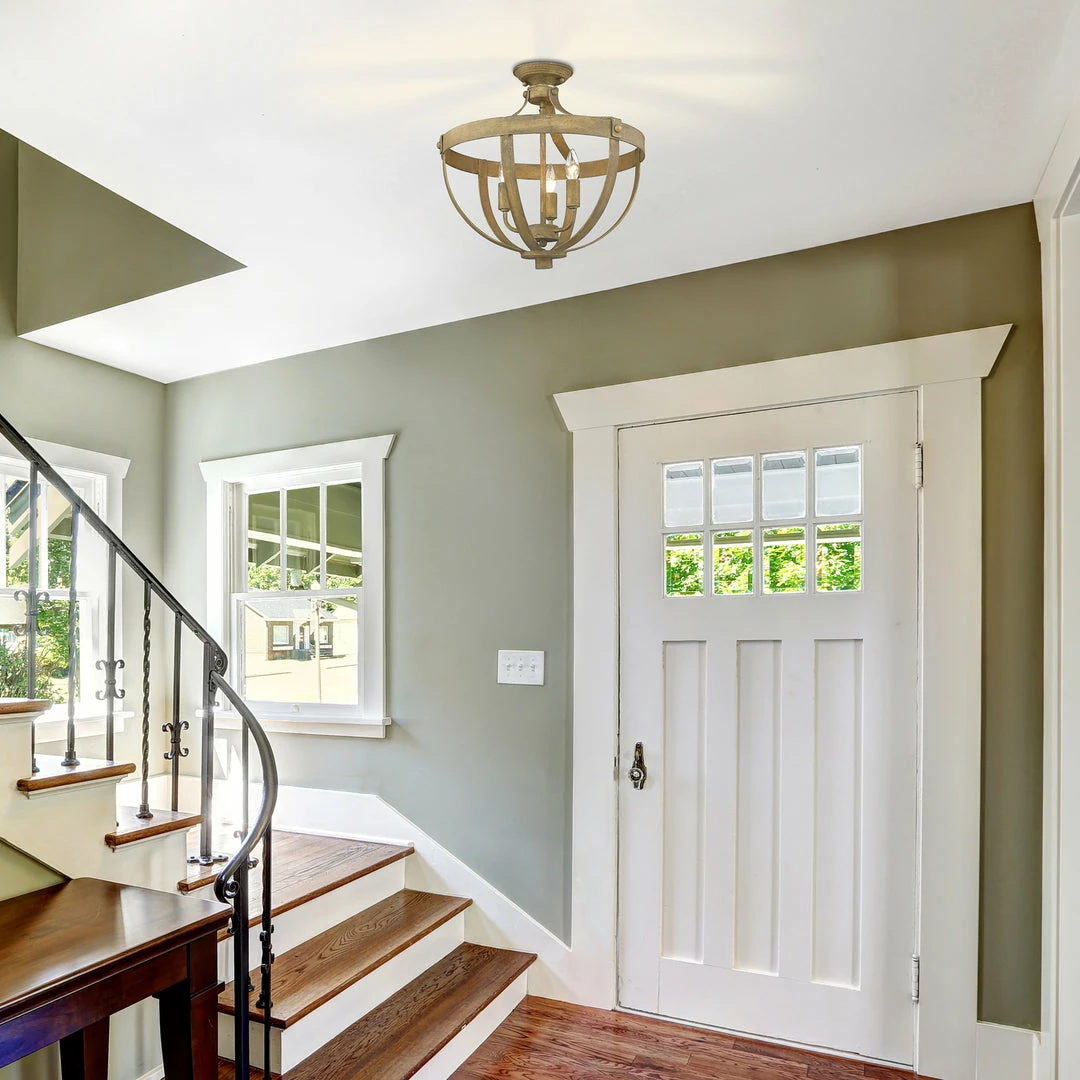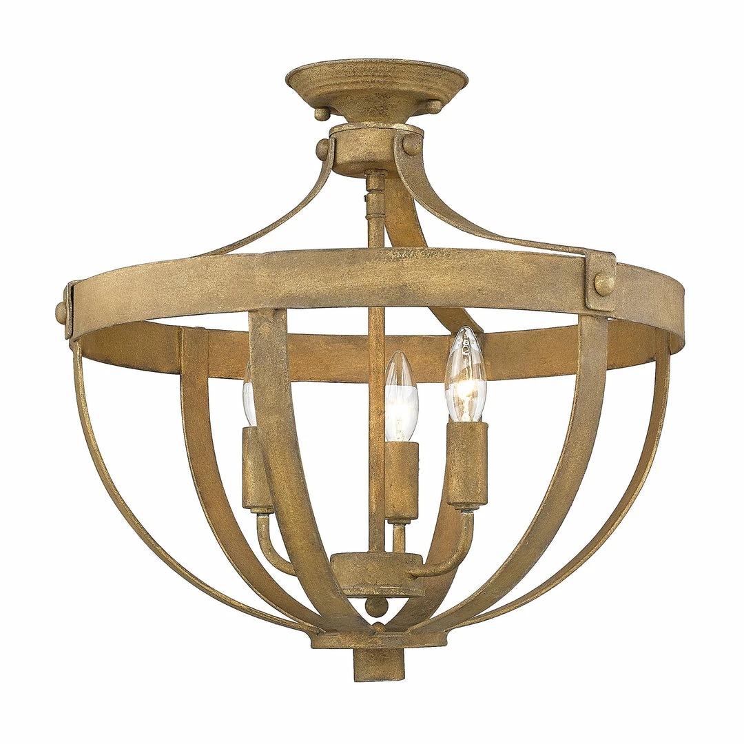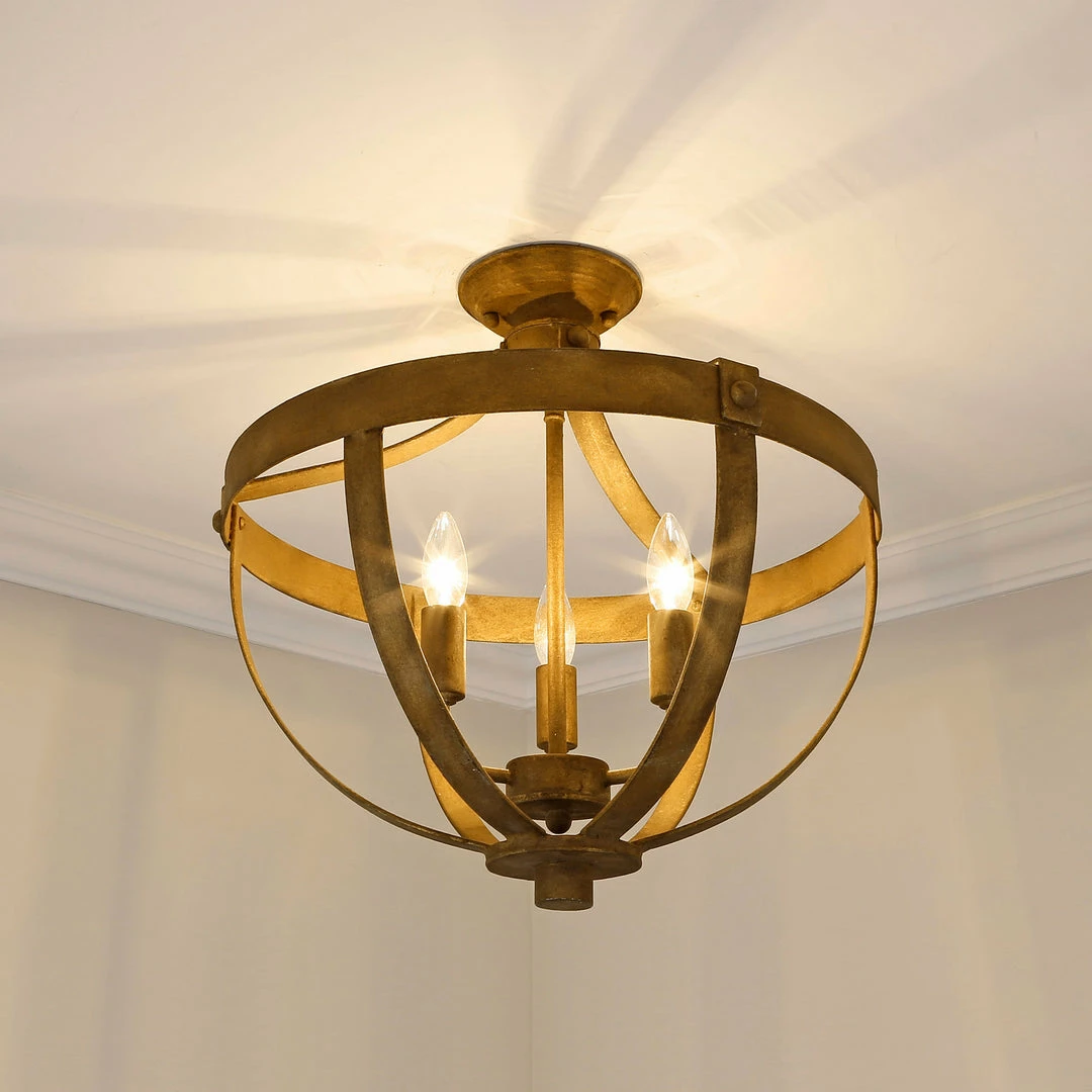 Strong and bold, Leona’s voluptuously curved frame mimics the generous lines of an Old World revival piece. As if newly restored for daily use, this charming fixture possesses all of the regality of a chandelier that would have graced a grand ballroom, but in a more compact and useful size. Hand-painted a warm, burnished chestnut finish, the design resembles a heavily tarnished antique. The decorative, button-like rivets along Leona’s silhouette is reminiscent of an old-world gown. They add a finishing touch to this beautiful treasure. Hang this close-to-ceiling 3-light fixture in a cozy dining room, nook, or entry.