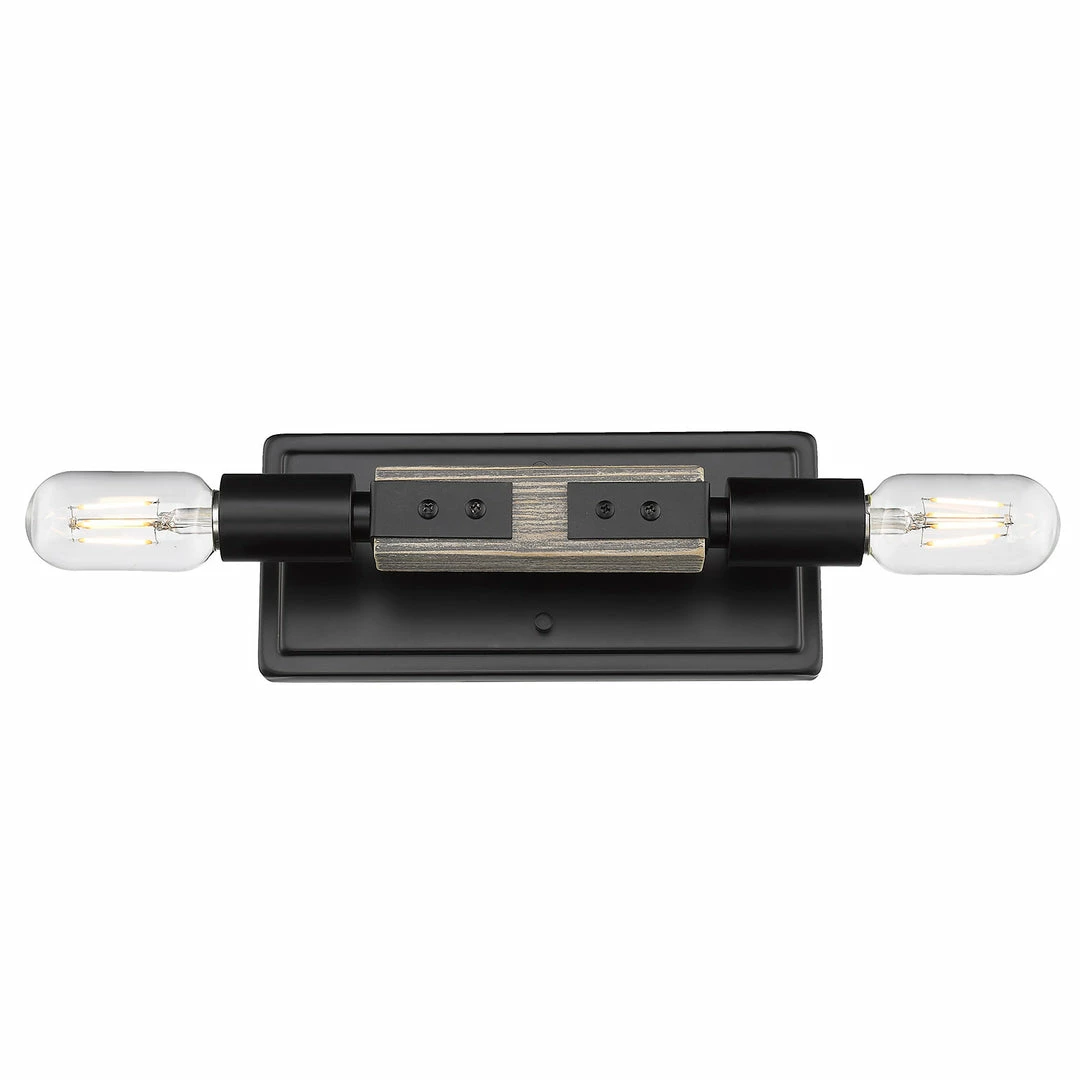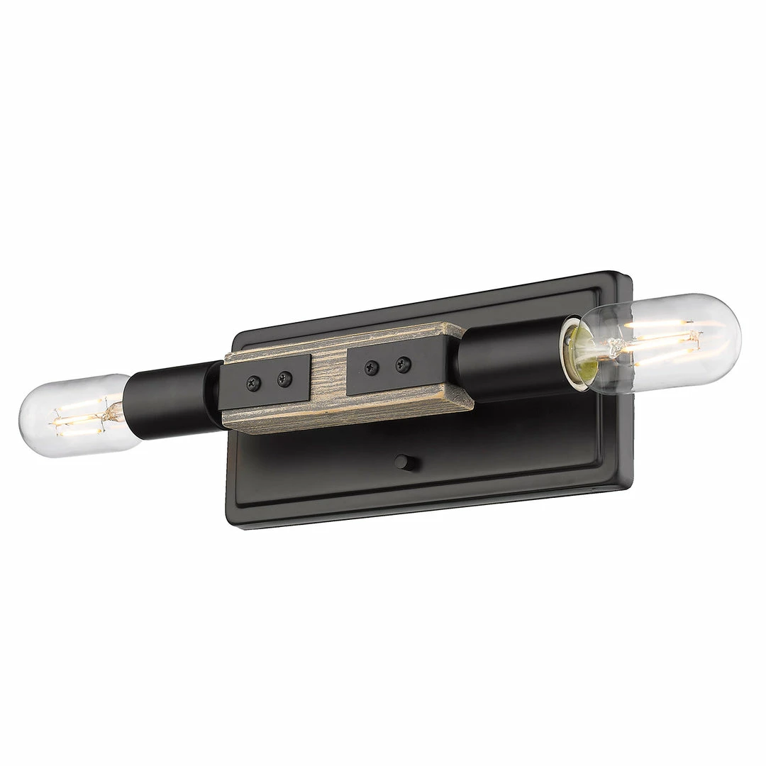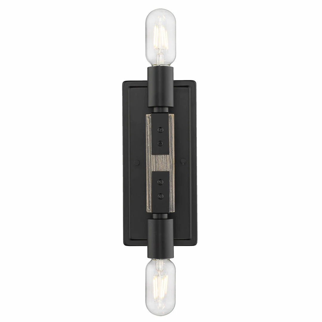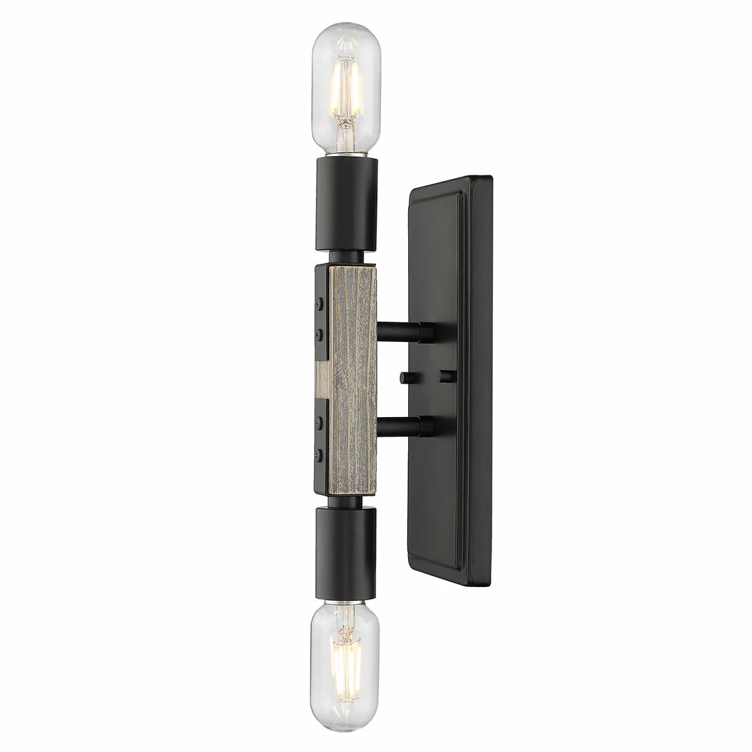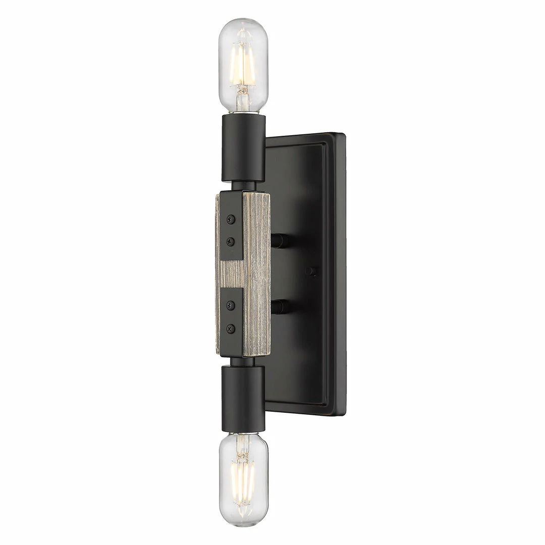 Simple and geometric, Lowell is rustic style in a modern form. Crafted of genuine Pinewood, the lightly distressed solid wood frames are washed in a soft gray for a casual, coastal feel. The dark matte black of the exposed sockets, joints, and hardware lends an industrial influence to the design, providing dramatic contrast to the light tone of the natural wood. This 2-light wall sconce may be mounted vertically and horizontally.