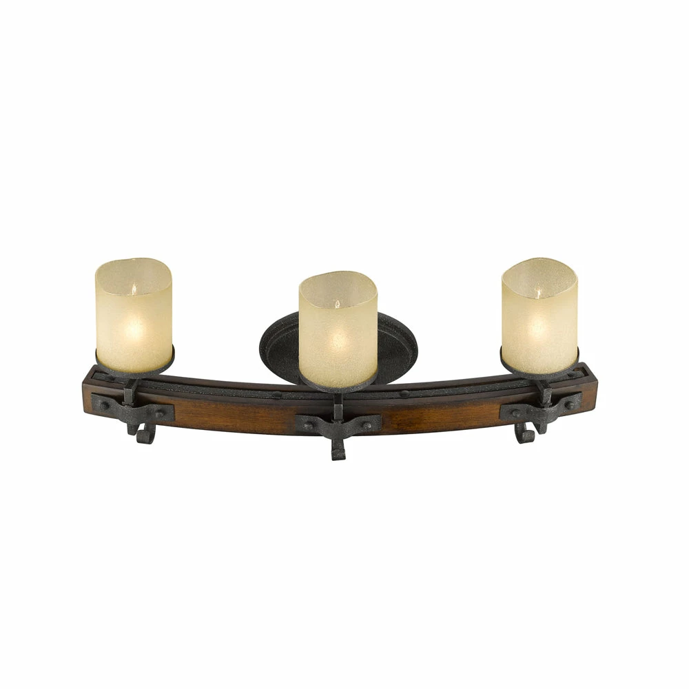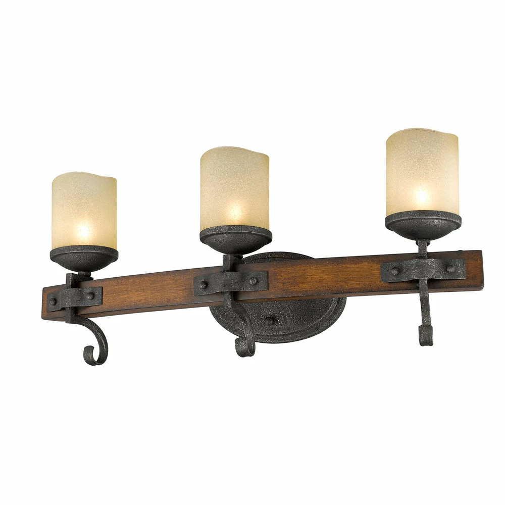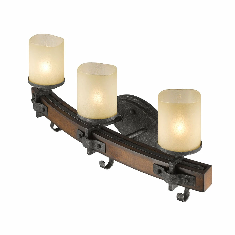 Magnificently traditional, the Madera collection blends antique tones and patinas that speak of a rich Spanish heritage. Available in a selection of rustic finishes, hand-forged metal scrollwork brings out the weathered details. A number of silhouettes in this series give an air of authenticity by offering either hand-painted glass or choice wood accents. This 3-light bath vanity is UL approved for damp locations and is ideal over a vanity or mirror.