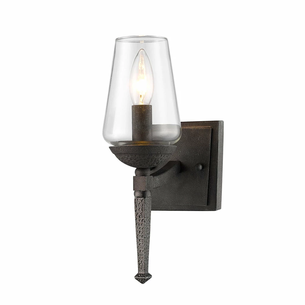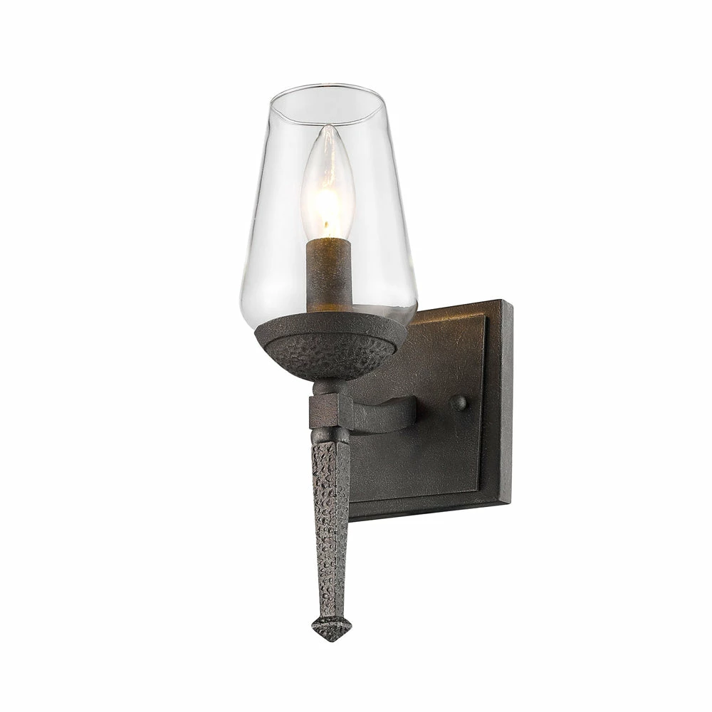 The rustic, hammered steel fixtures of the Marcellis collection lend texture and dimension to a room. The hand-painted Dark Natural Iron finish is lightly distressed. A steel candle and candelabra bulb are encased in hand-blown clear glass for a distinctly traditional look. Wall sconces are popularly used in halls, stairways, entries and foyers. The soft light of the candelabra bulb is perfect for accent lighting.