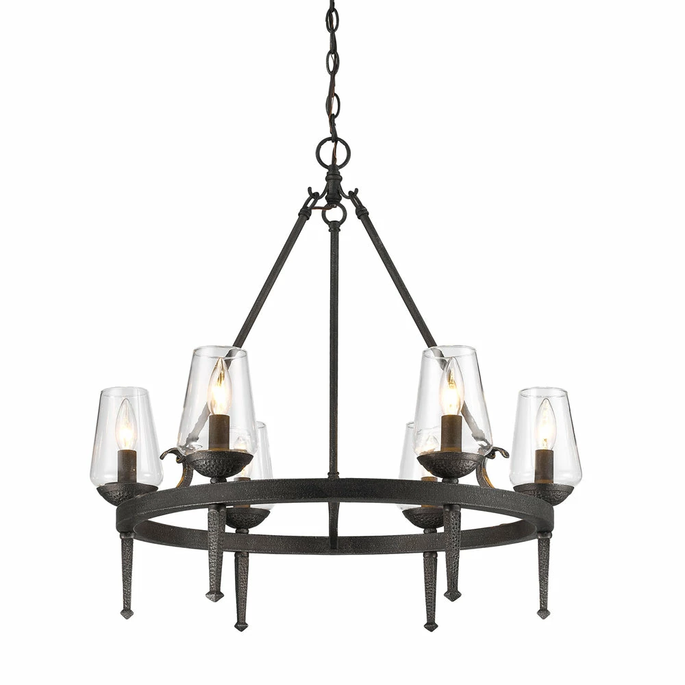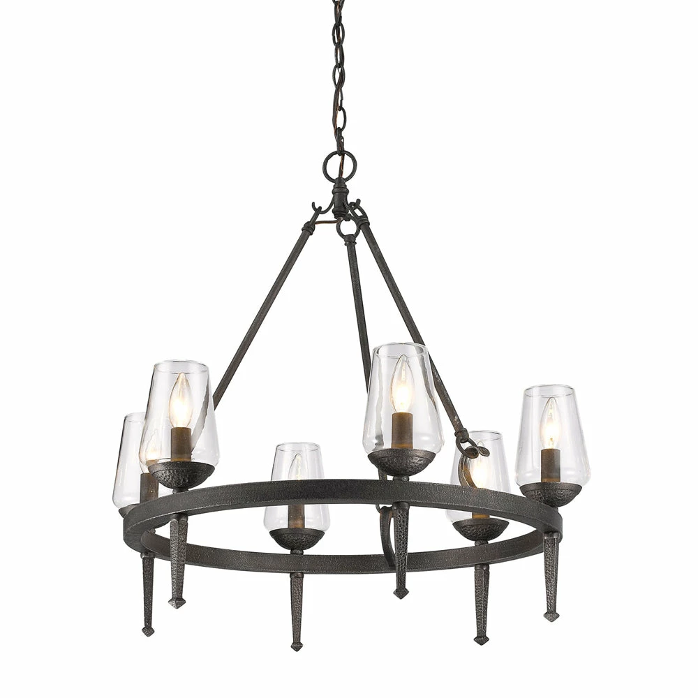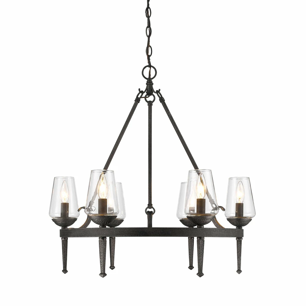 The rustic, hammered steel fixtures of the Marcellis collection lend texture and dimension to a room. The hand-painted Dark Natural Iron finish is lightly distressed. Steel candles and candelabra bulbs are encased in hand-blown clear glass for a distinctly traditional look. Chandeliers create stylish focal points and this 6-light chandelier is comfortably sized for a cozy dining room, nook, or entry.