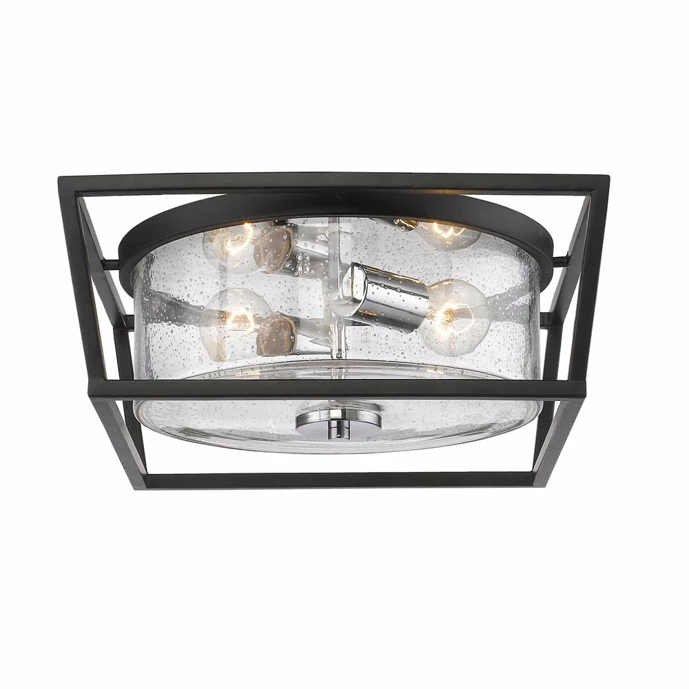 With seeded glass and contemporary finishes, the simplicity of the Mercer Collection is suitable for transitional to modern interiors. Bold, graphic lines create an open-cage design. The fixtures are available in multiple accent colors to match or contrast the smooth cages. This flush mount provides widespread ambient lighting.