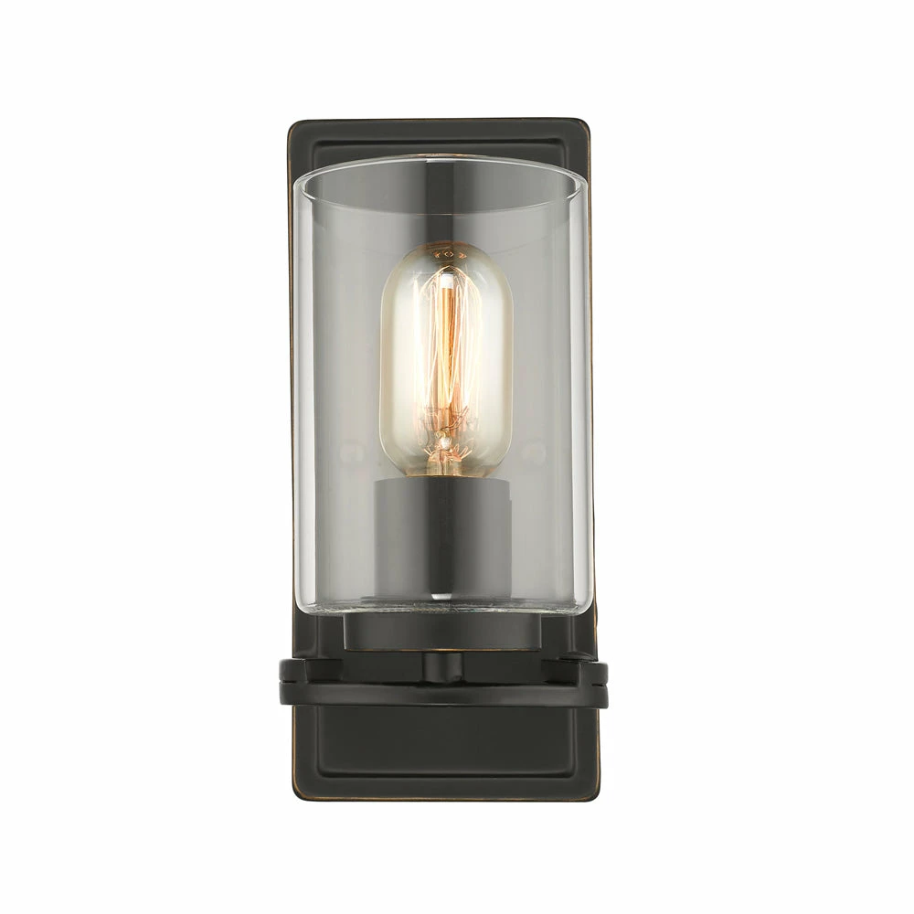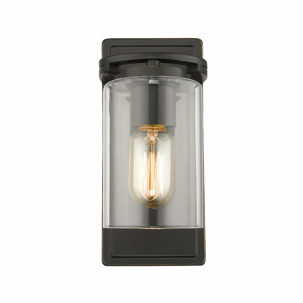 Overlapping arcs come together to form contemporary rings, supporting cylindrical clear glass shades in this clean and modern design. The matte black finish has gold highlights and blends easily with many decors. Matching black socket covers are visible through the clear glass. The collection uses medium base bulbs. This 1-light fixture is approved for damp locations, but can be used all over the house. This fixture may be mounted with the glass facing up or down.