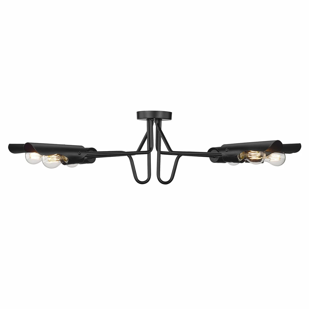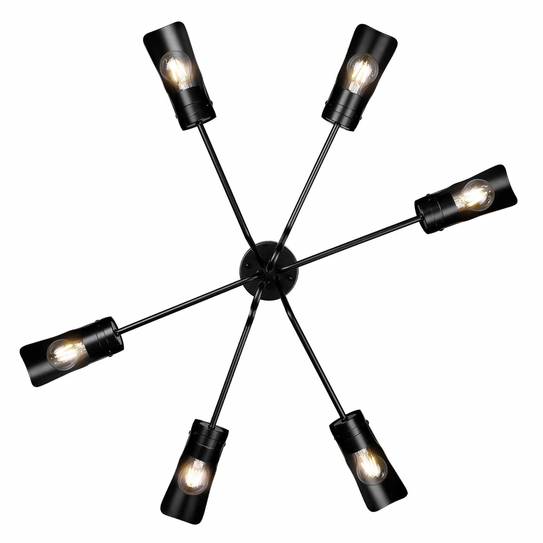Spark conversation with our Sputnik-inspired Newton Semi-flush Chandelier. This showpiece is in the style of Mid-Century modern starbursts. Designed for modern spaces with minimalist decor this oversized, low-profile fixture features multiple lights for widespread illumination in tight spaces with low ceilings. Close-to-ceiling, the long, geometric arms bend at alternating angles for visual interest, and partial shades add a functional and aesthetic twist. Install with the shades up, down, or both. Reposition the shades up or down to suit your needs. A bold monochromatic Matte Black finish enhances the contemporary feel, completing the look and making the fixture a focal point in most spaces.