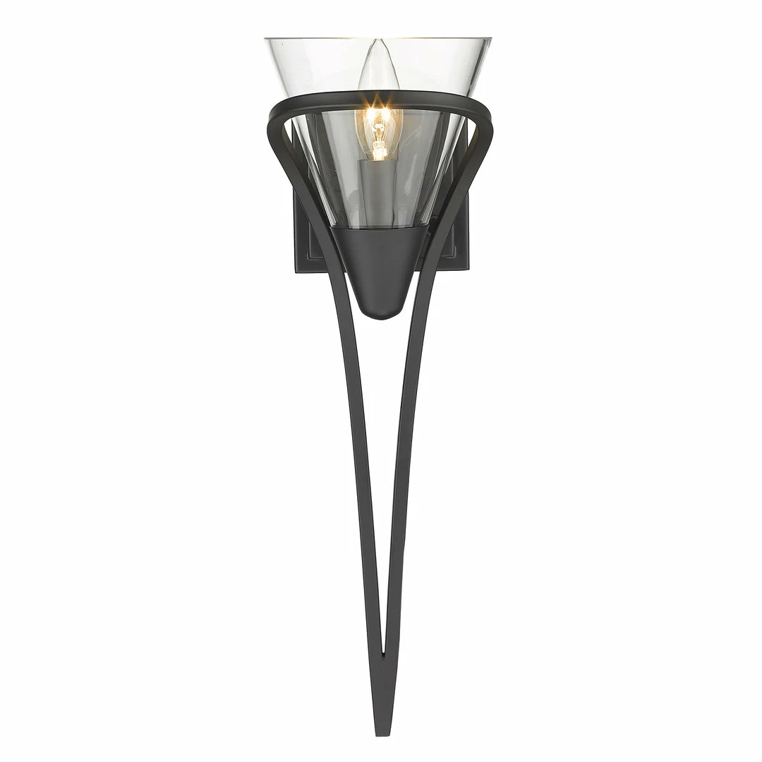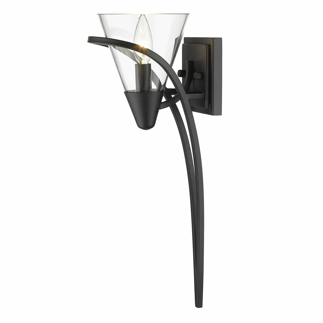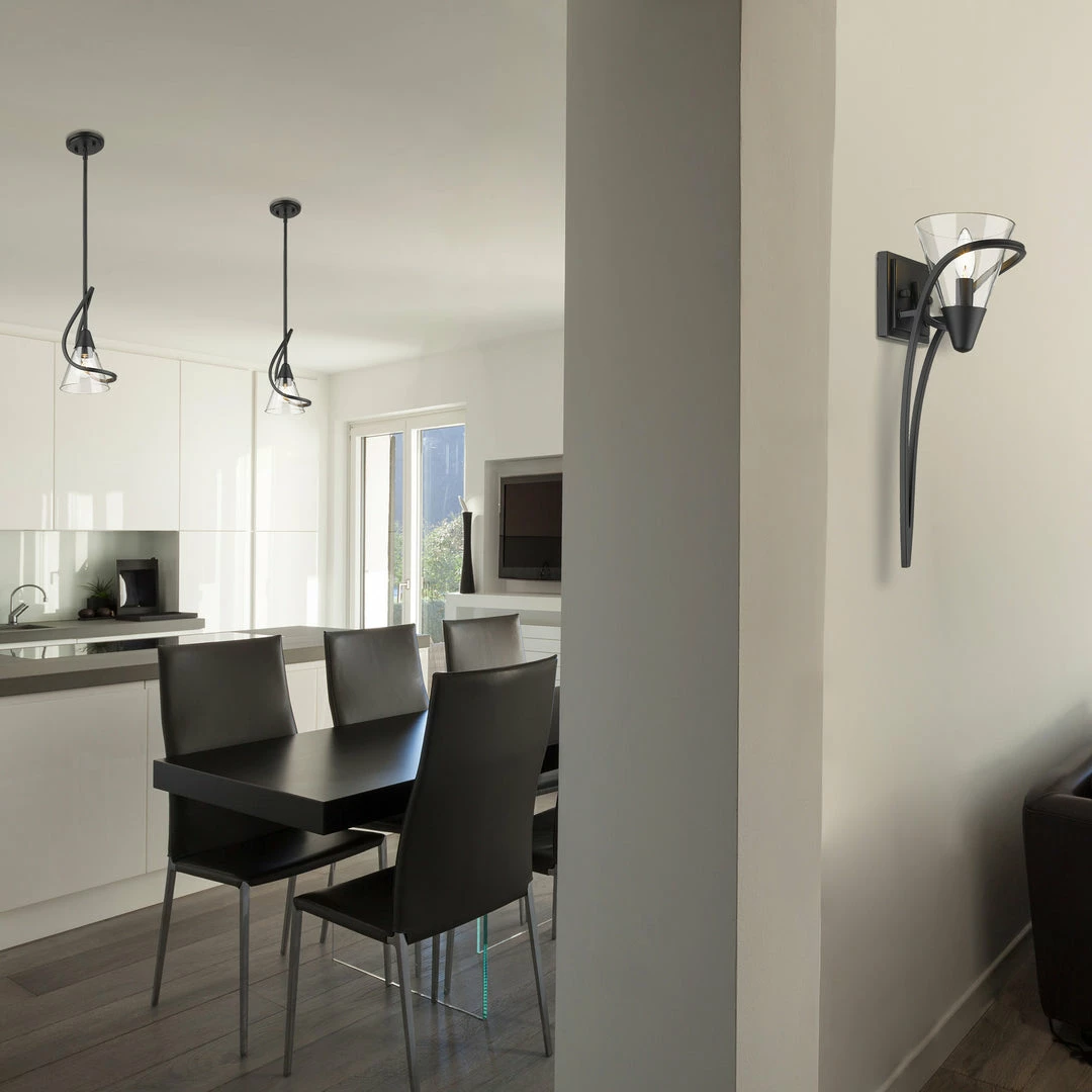 The clean lines of the Olympia collection offer Transitional style with a contemporary edge. The graceful scroll details appear to sweep around, encasing the conical glass shade. The overall effect is elegant fluidity. This collection is available in select finishes and glass options. This sconce is an eye-catching accent that can be used alone or as a set.