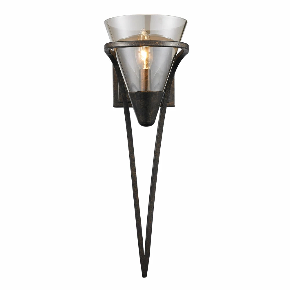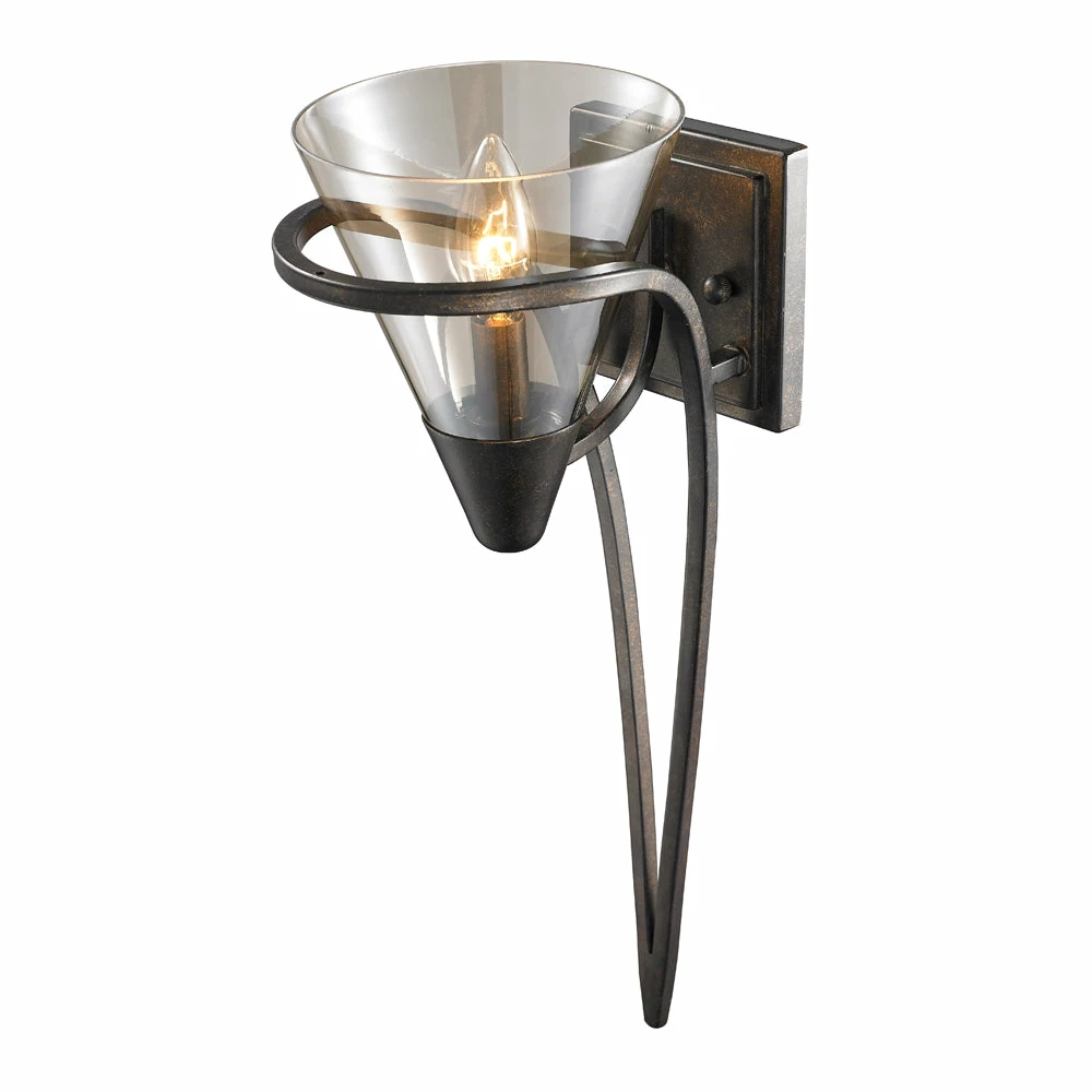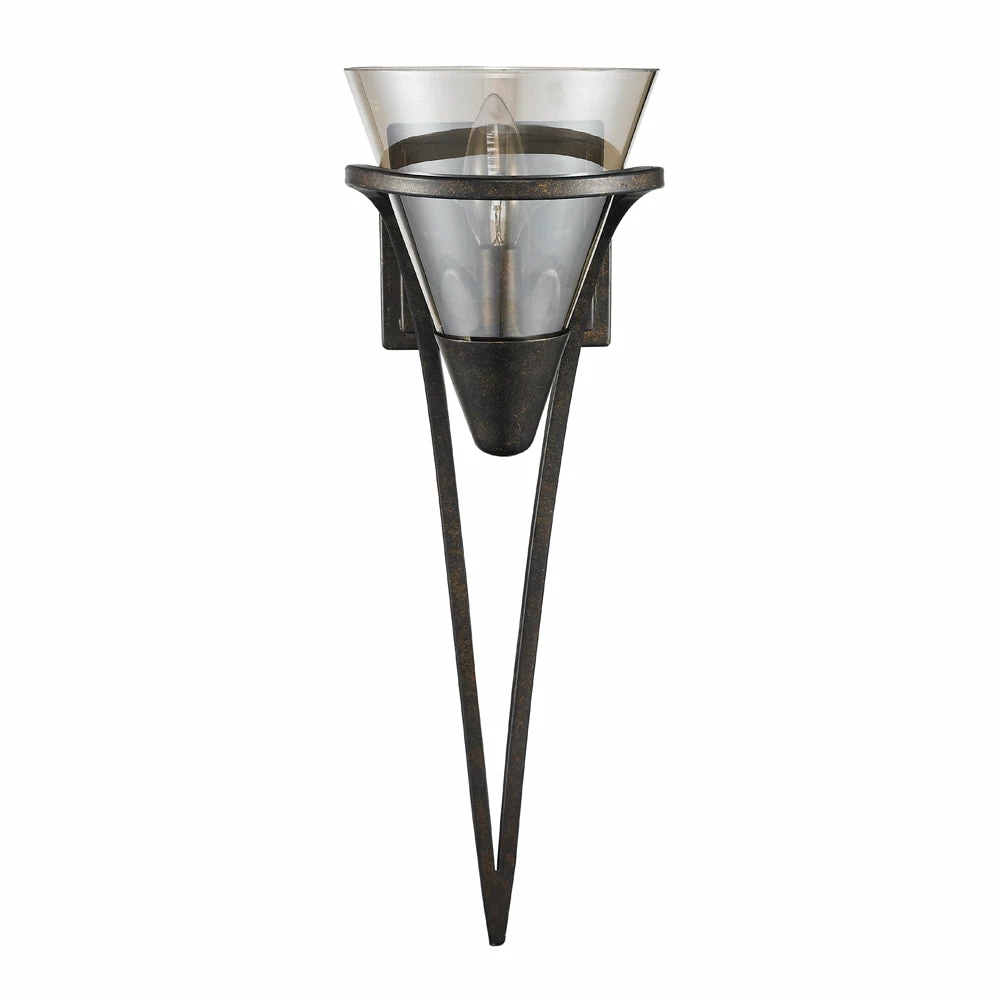 The clean lines of the Olympia collection offer Transitional style with a contemporary edge. The graceful scroll details appear to sweep around, encasing the conical glass shade. The overall effect is elegant fluidity. This collection is available in select finishes and glass options. This sconce is an eye-catching accent that can be used alone or as a set.