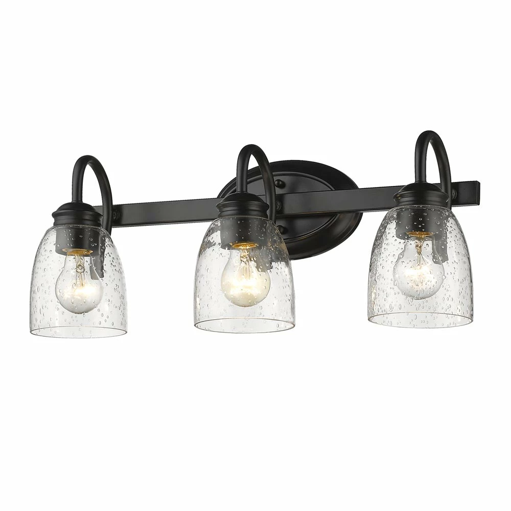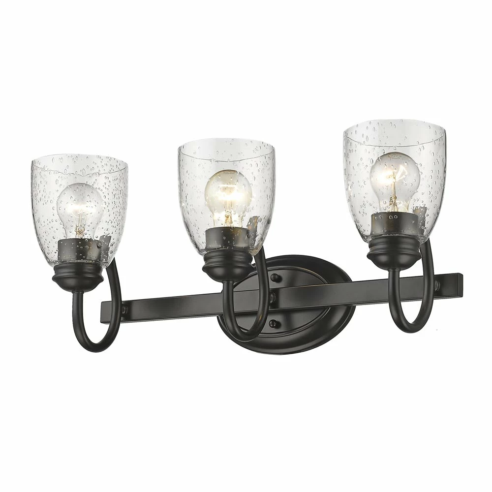 Simple and elegant, the Parrish collection is a lovely blend of masculine and feminine, old and new. A number of versatile finishes are available. The modern finishes overlay graceful, traditional arms for a transitional look. Matching socket covers add a touch of color to the clear, textured seeded glass. The contemporary shape of the glass and simple finish give this otherwise classic silhouette a modern update. Perfect for traditional to transitional interiors, this charming collection is a timeless beauty. This family offers a variety of fixtures to suit all of your interior lighting needs. This 3-light bath vanity is UL-approved for damp locations and will provide well-diffused light over a vanity or mirror.