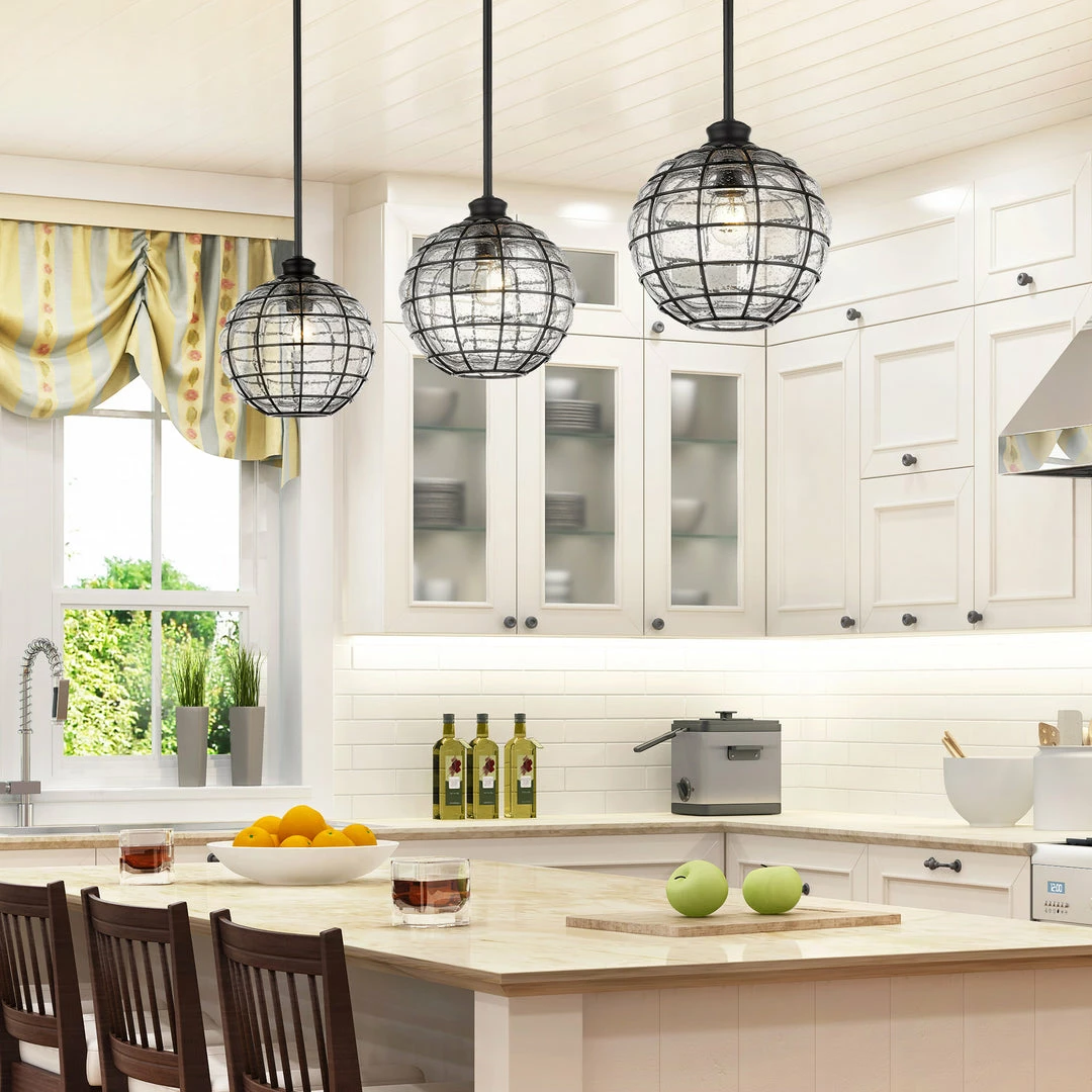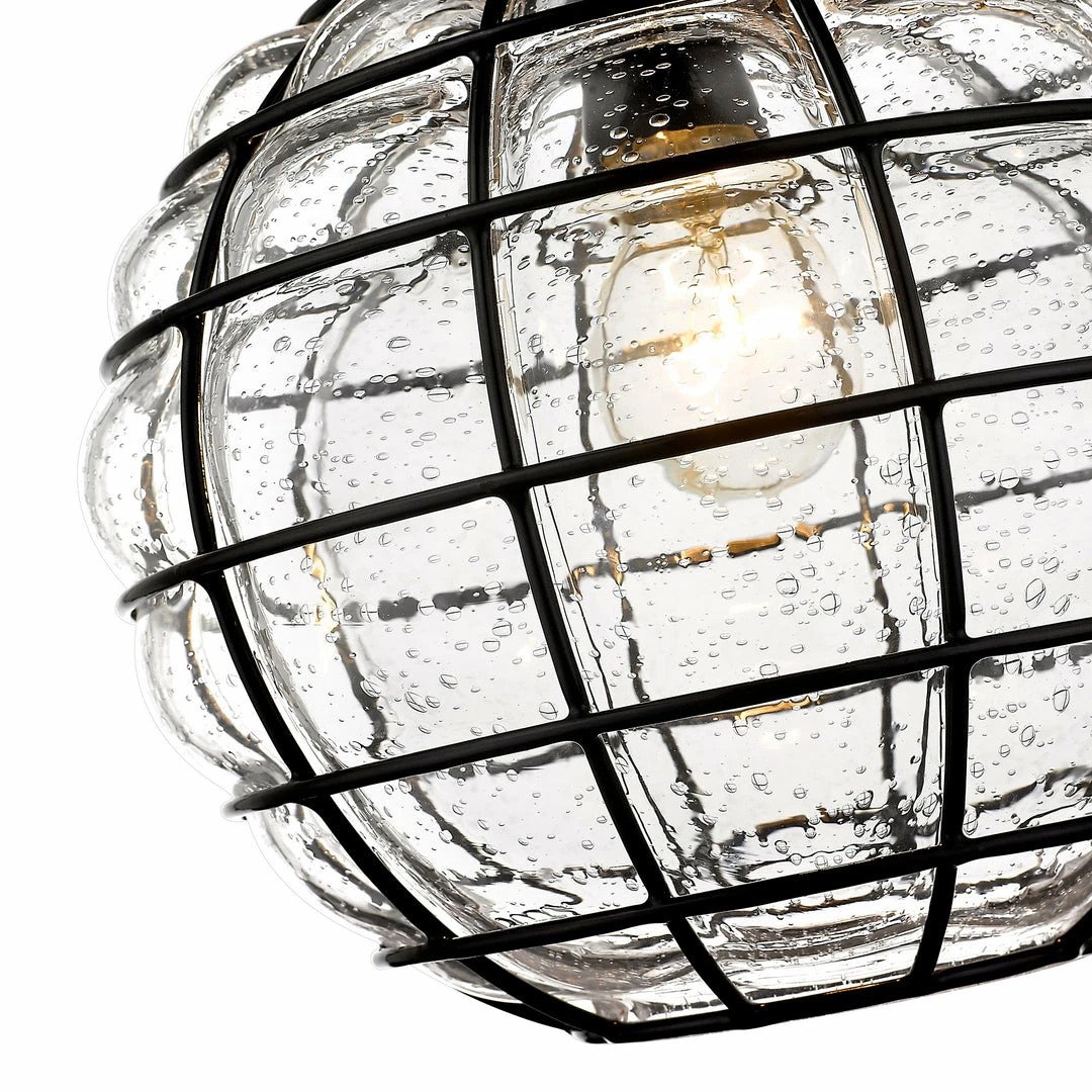 Powell is a collection of lovely glass and metal pendants. The decorative, mixed materials of the shades are the focus of these contemporary fixtures. To allow the shades to take center stage, the remaining matte black hardware is kept simple by design. Composed of curved iron, the shade’s metal ribbing forms an elongated sphere. Open at the bottom and handblown by artisans, the structured glass has an industrial-modern feel. During the blowing process, hot, molten glass pours through each crevice creating raised bubbles along the surface. As it cools, the seeded glass clings to the grid-like metal cage. When lit, the gently diffused shades have a unique glow. Beckoning onlookers, these lights add visual interest anywhere they hang.
