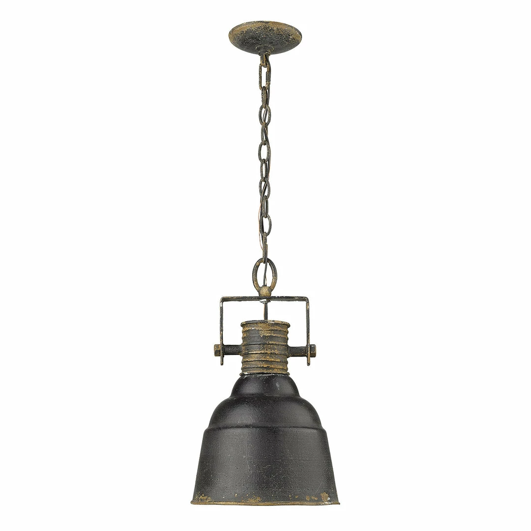 Quarry was designed for industrial and farmhouse decors. Black with hints of gold, this two-tone fixture commands attention while complementing most color schemes. The authentic industrial components and simple accents create a casual, modern look that pays homage to the classics. The heft of the metal shade and the details of the vintage-inspired top cap speak to the quality of the design. This pendant may be mounted as a single accent or hung in a group.