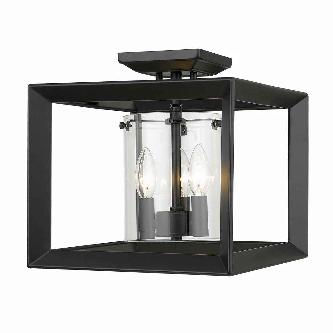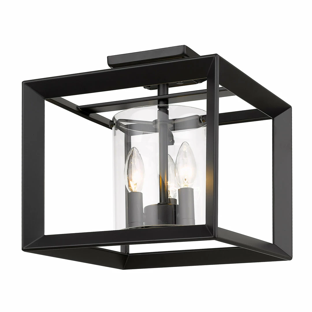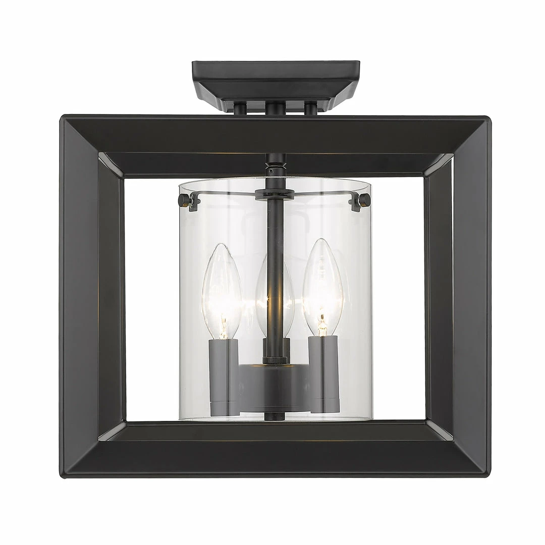 Modern lanterns featuring a handsome beveled cage design. Make an elegant statement in the Smyth collection. Clean geometry creates contemporary style with steel candles and candelabra bulbs encased in select glass options. The fixtures are offered in a variety of finishes. This 3-light Low Profile semi-flush creates a stylish focal point.